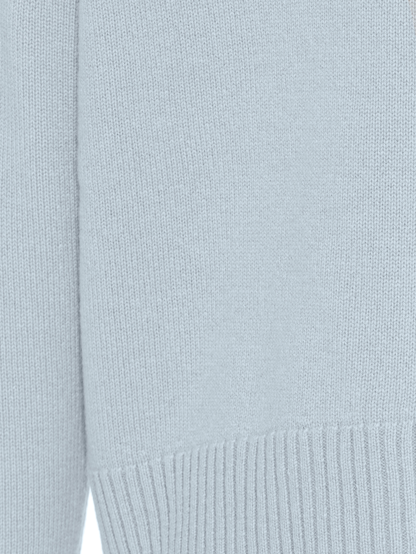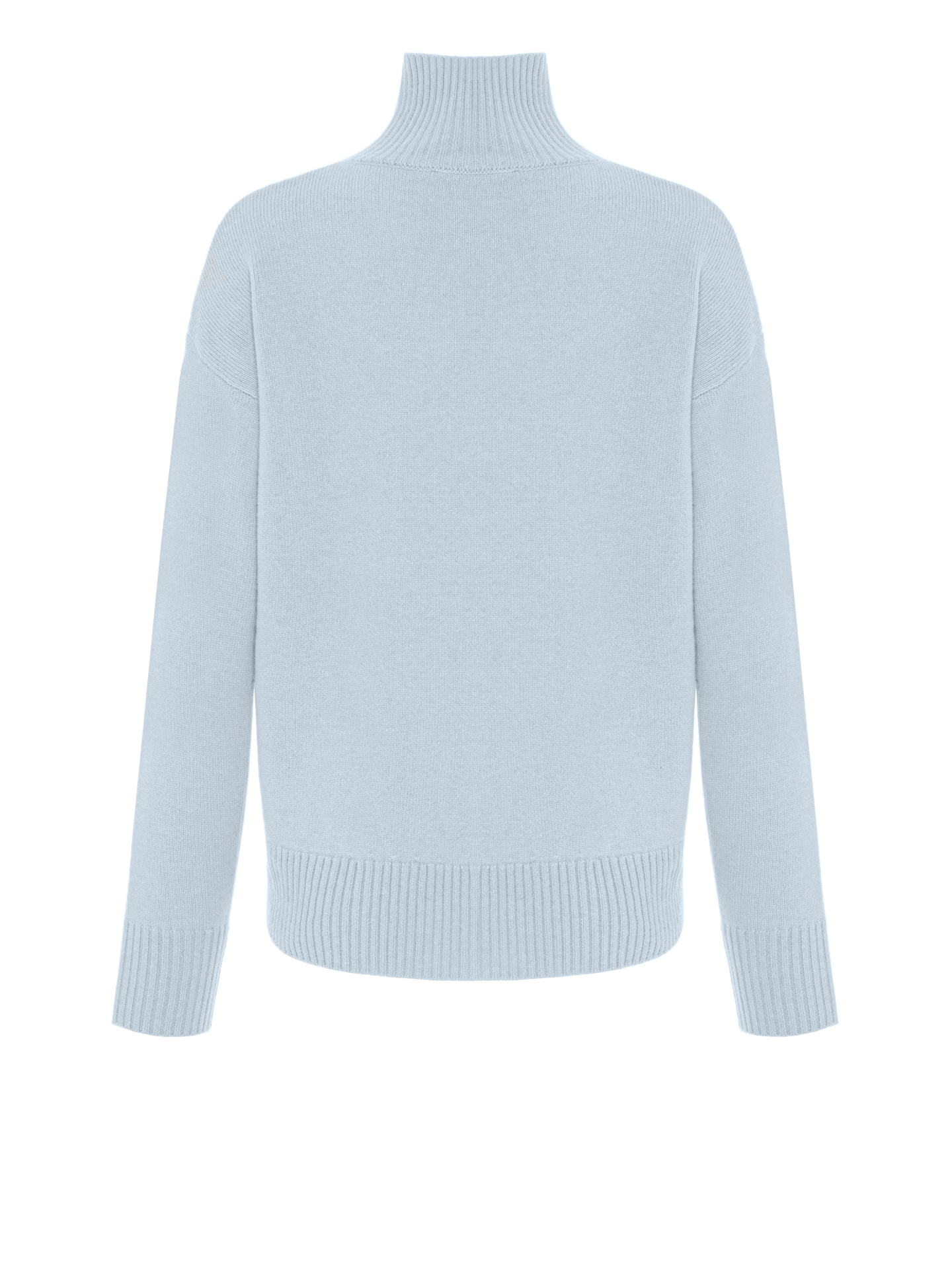 A cozy high-neck light blue sweater is made of 100% premium-quality royal cashmere. The fine, silky, almost weightless yarn reliably retains warmth and maintains a comfortable microclimate while allowing the skin to breathe. The material is highly durable, does not wrinkle and does not lose its shape. The basic model is relevant for any wardrobe and suits all body types.