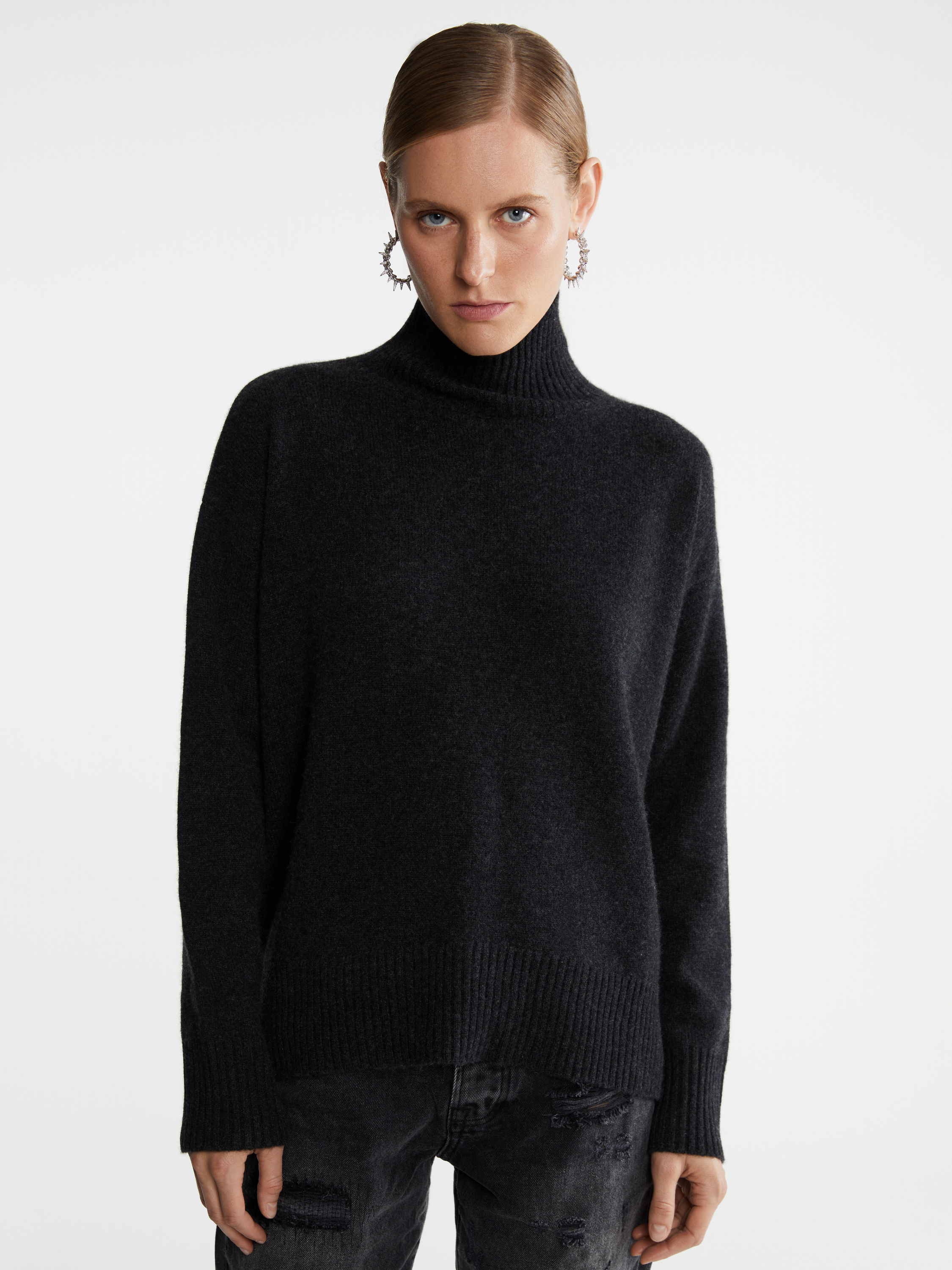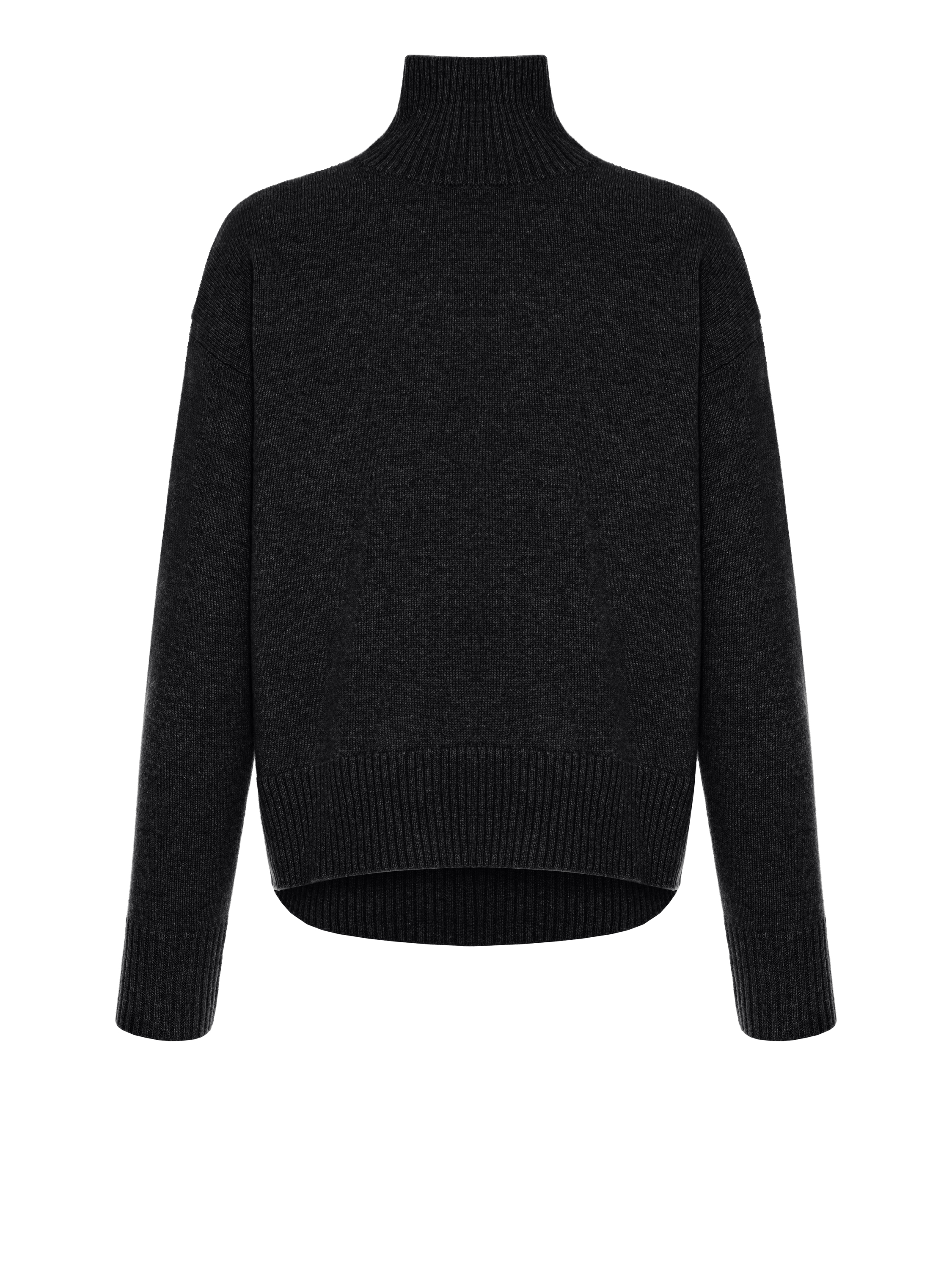 A cozy high-neck dark gray sweater is made of 100% premium-quality royal cashmere. The fine, silky, almost weightless yarn reliably retains warmth and maintains a comfortable microclimate while allowing the skin to breathe. The material is highly durable, does not wrinkle and does not lose its shape. The basic model is relevant for any wardrobe and suits all body types.