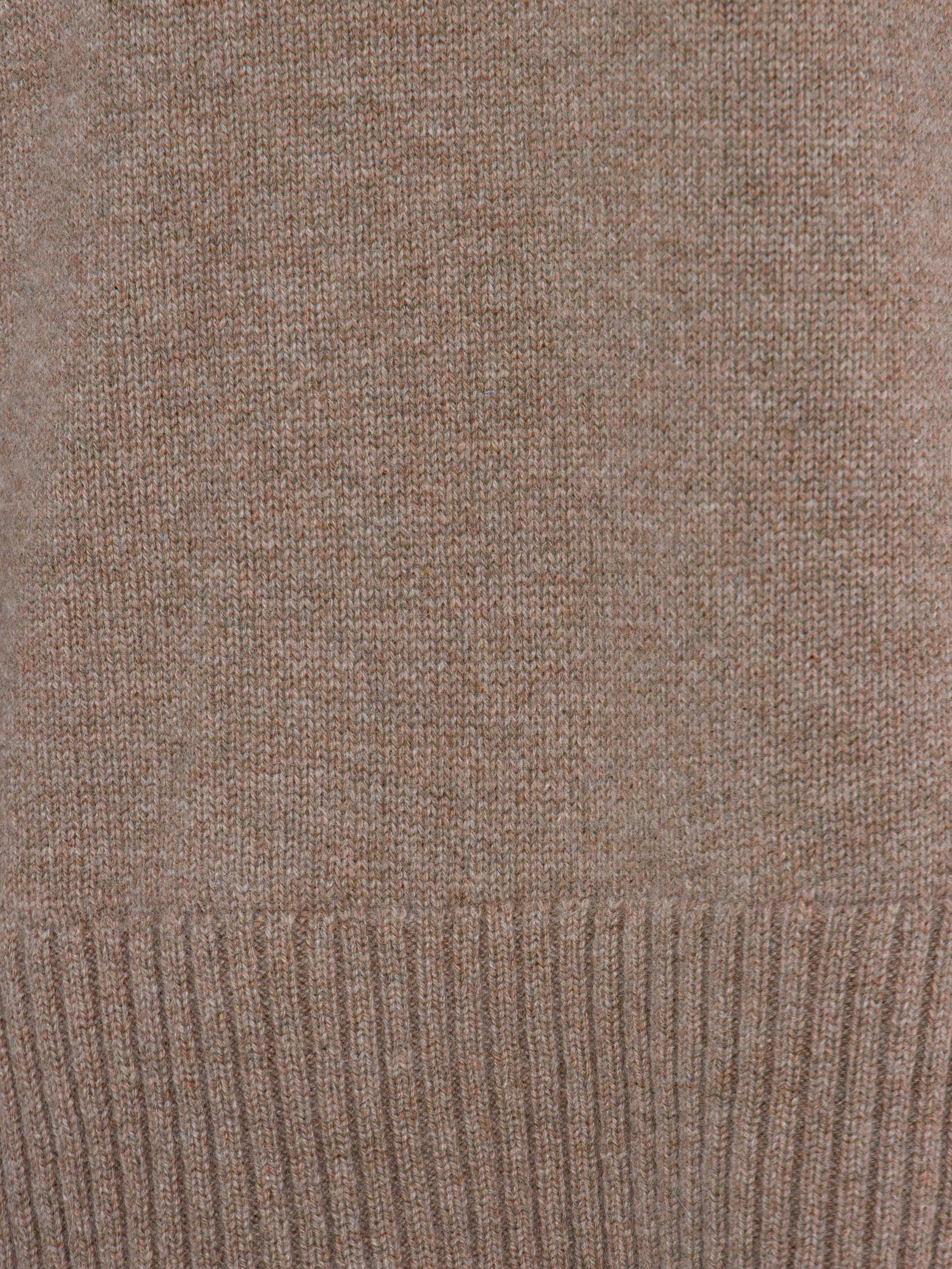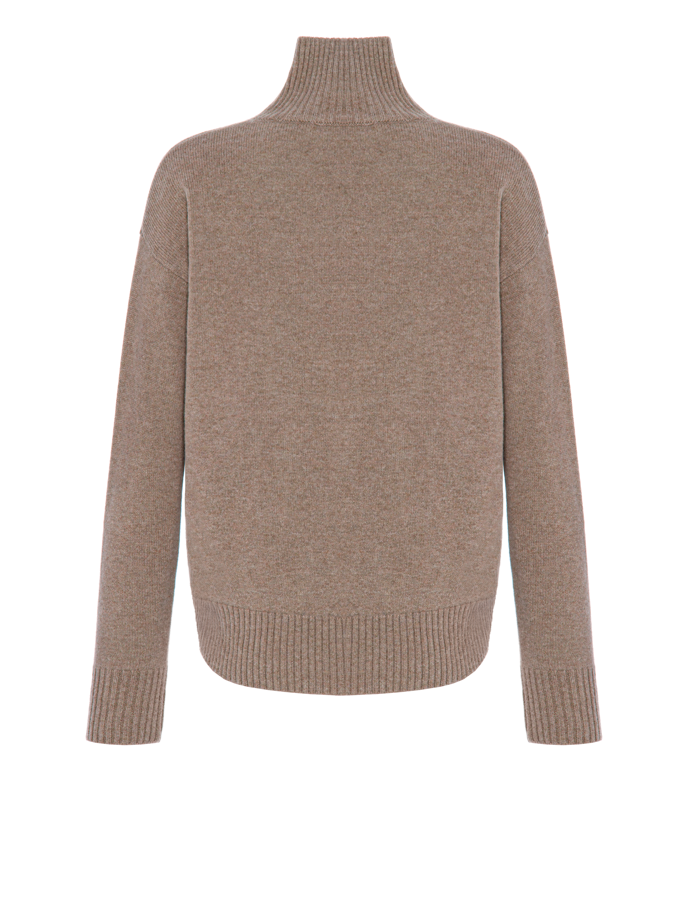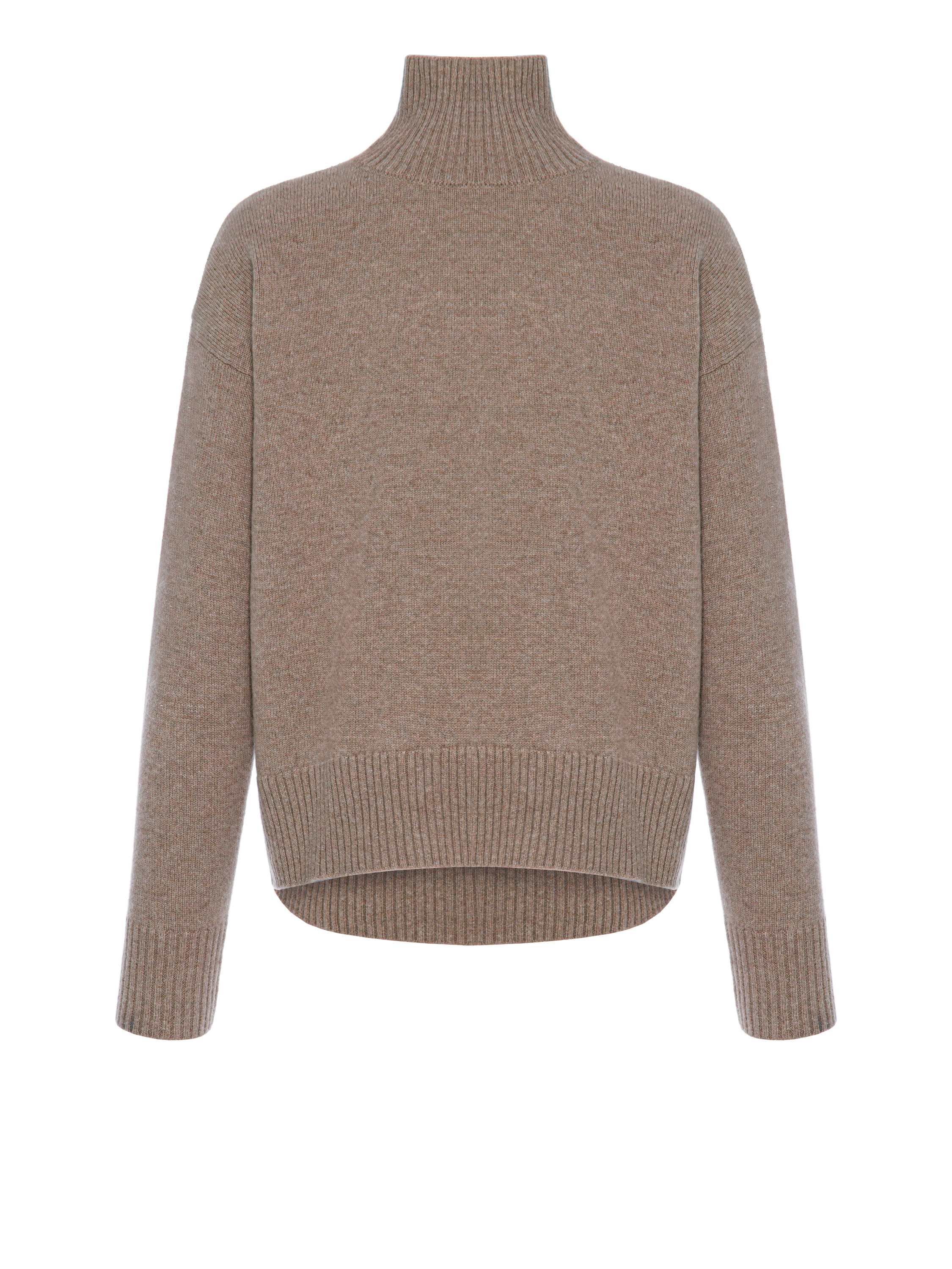 A cozy high-neck dark beige sweater is made of 100% premium-quality royal cashmere. The fine, silky, almost weightless yarn reliably retains warmth and maintains a comfortable microclimate while allowing the skin to breathe. The material is highly durable, does not wrinkle and does not lose its shape. The basic model is relevant for any wardrobe and suits all body types.