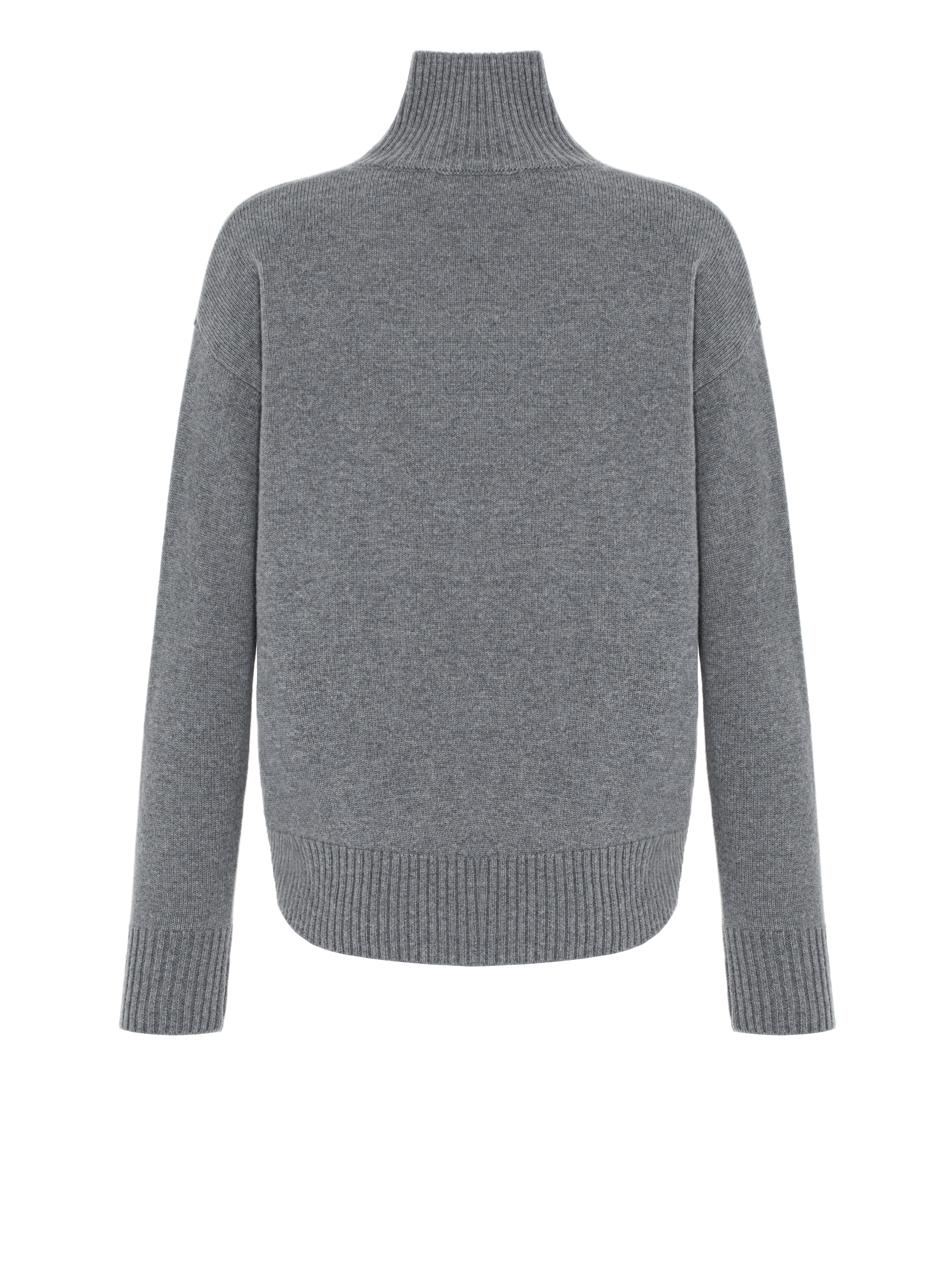 A cozy high-neck gray sweater is made of 100% premium-quality royal cashmere. The fine, silky, almost weightless yarn reliably retains warmth and maintains a comfortable microclimate while allowing the skin to breathe. The material is highly durable, does not wrinkle and does not lose its shape. The basic model is relevant for any wardrobe and suits all body types.