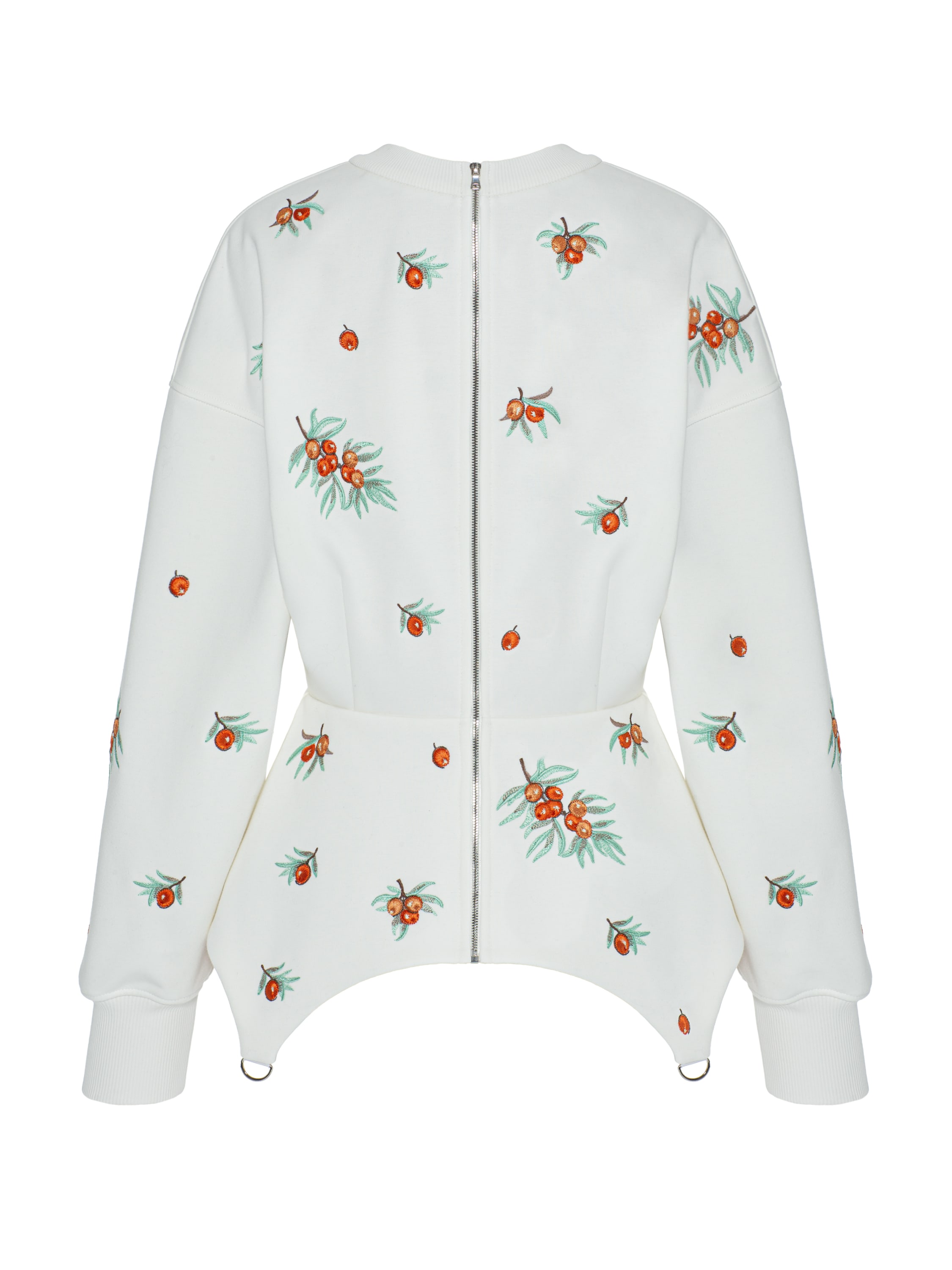 A sweatshirt made of milky footer with fleece will delight you with its softness and practicality. A stylish detail in the form of a shaped peplum and a zipper at the back make the model expressive, while the delicate embroidery depicting sea buckthorn gives a special accent to the look.