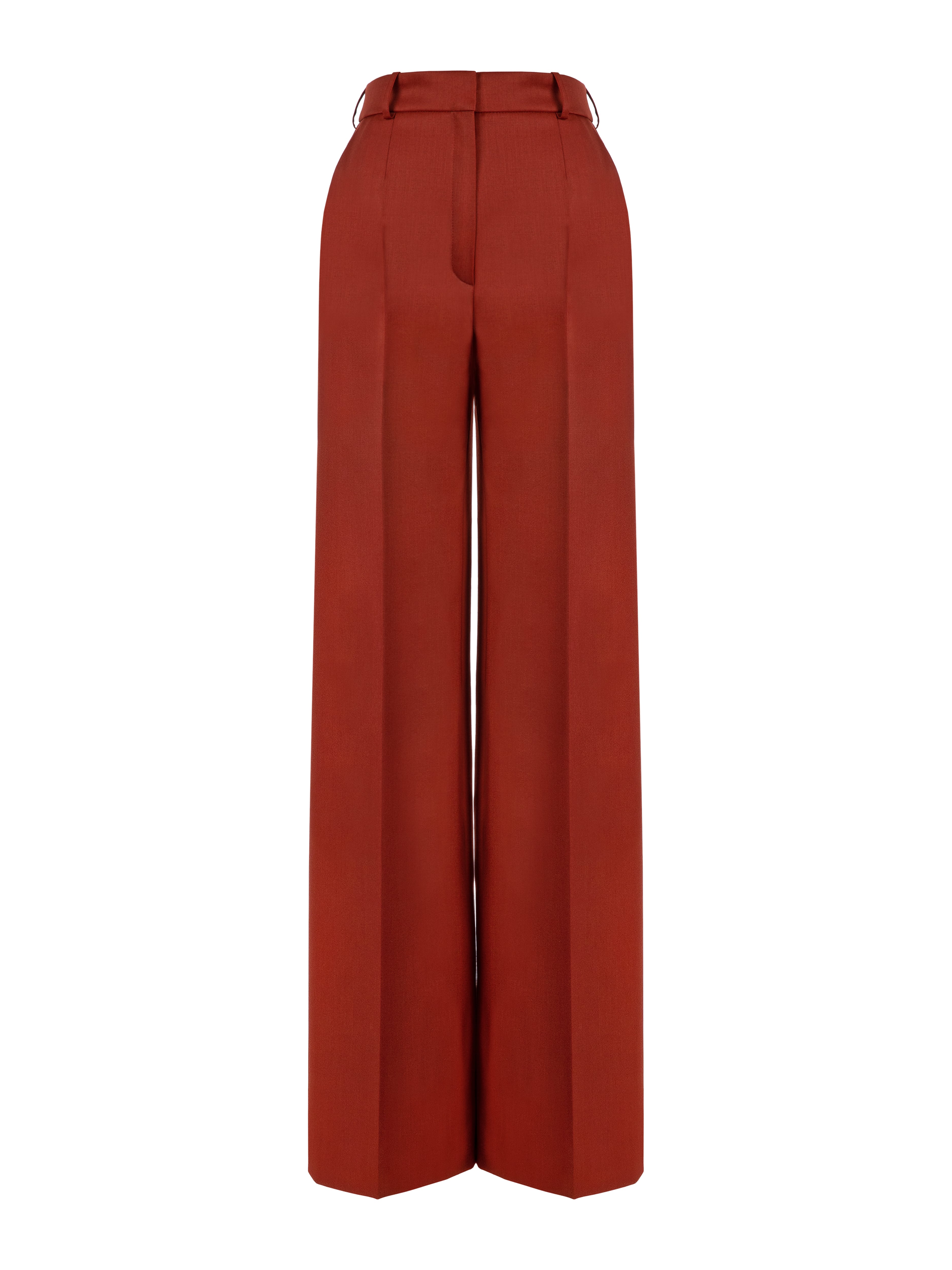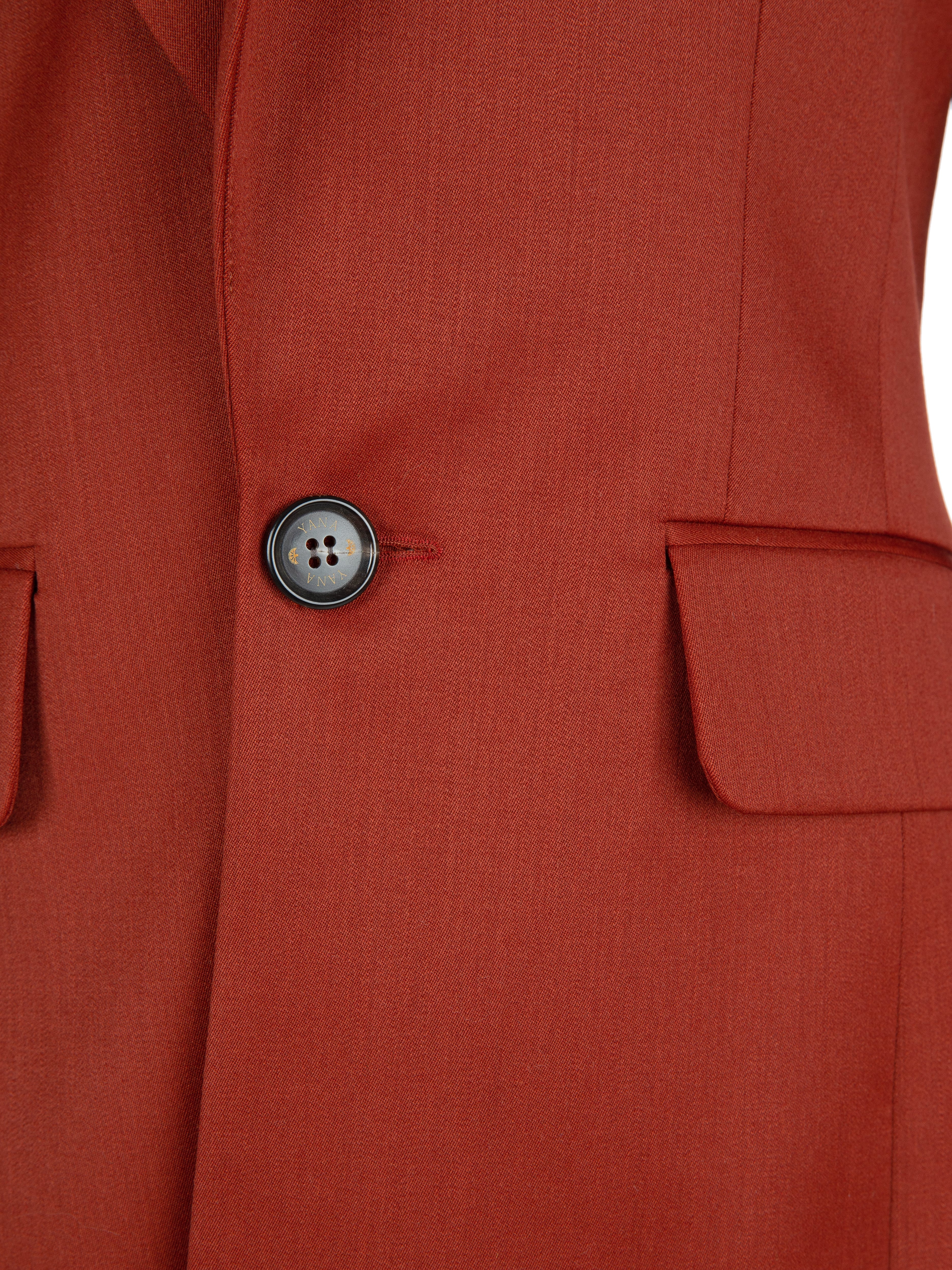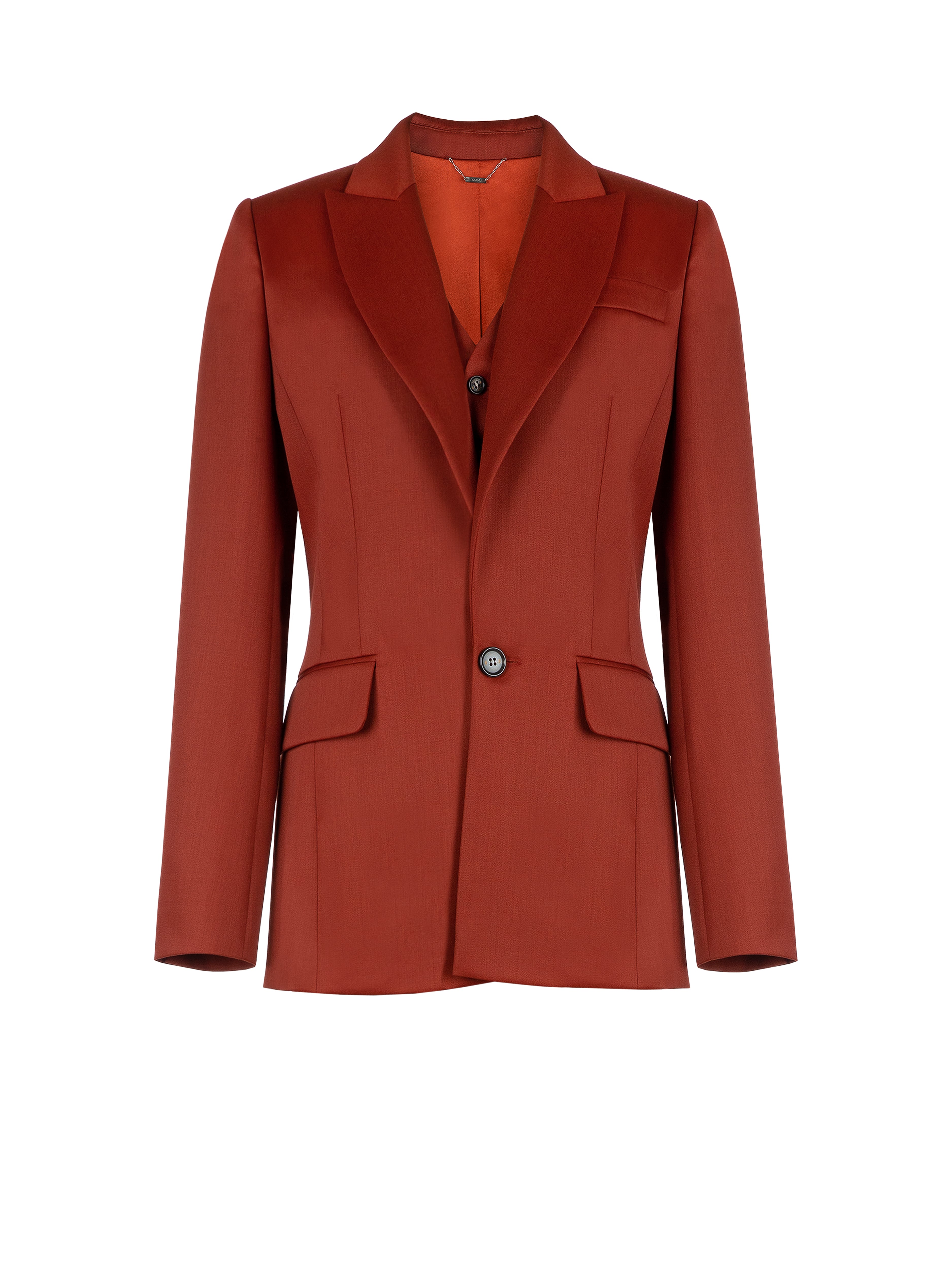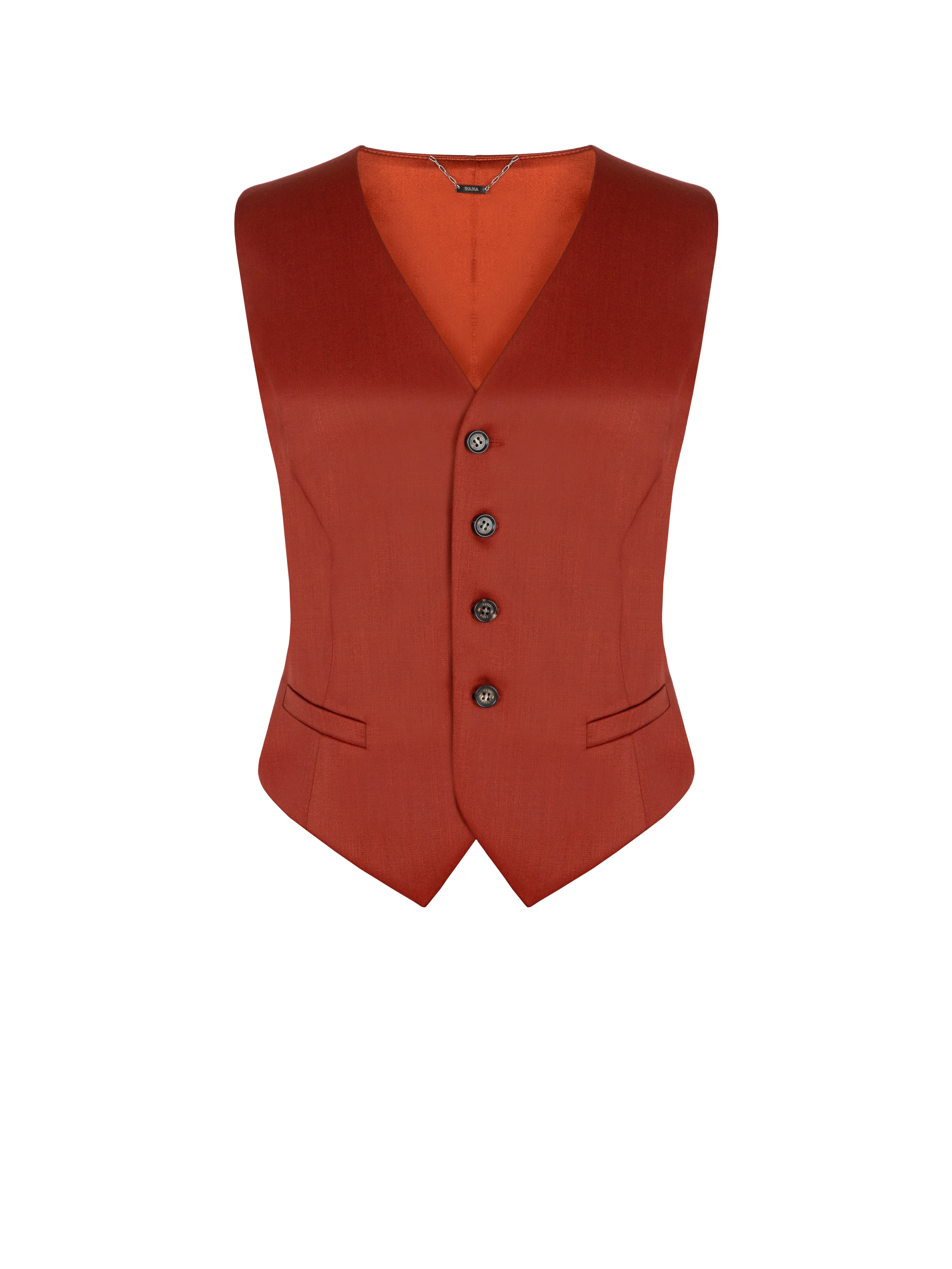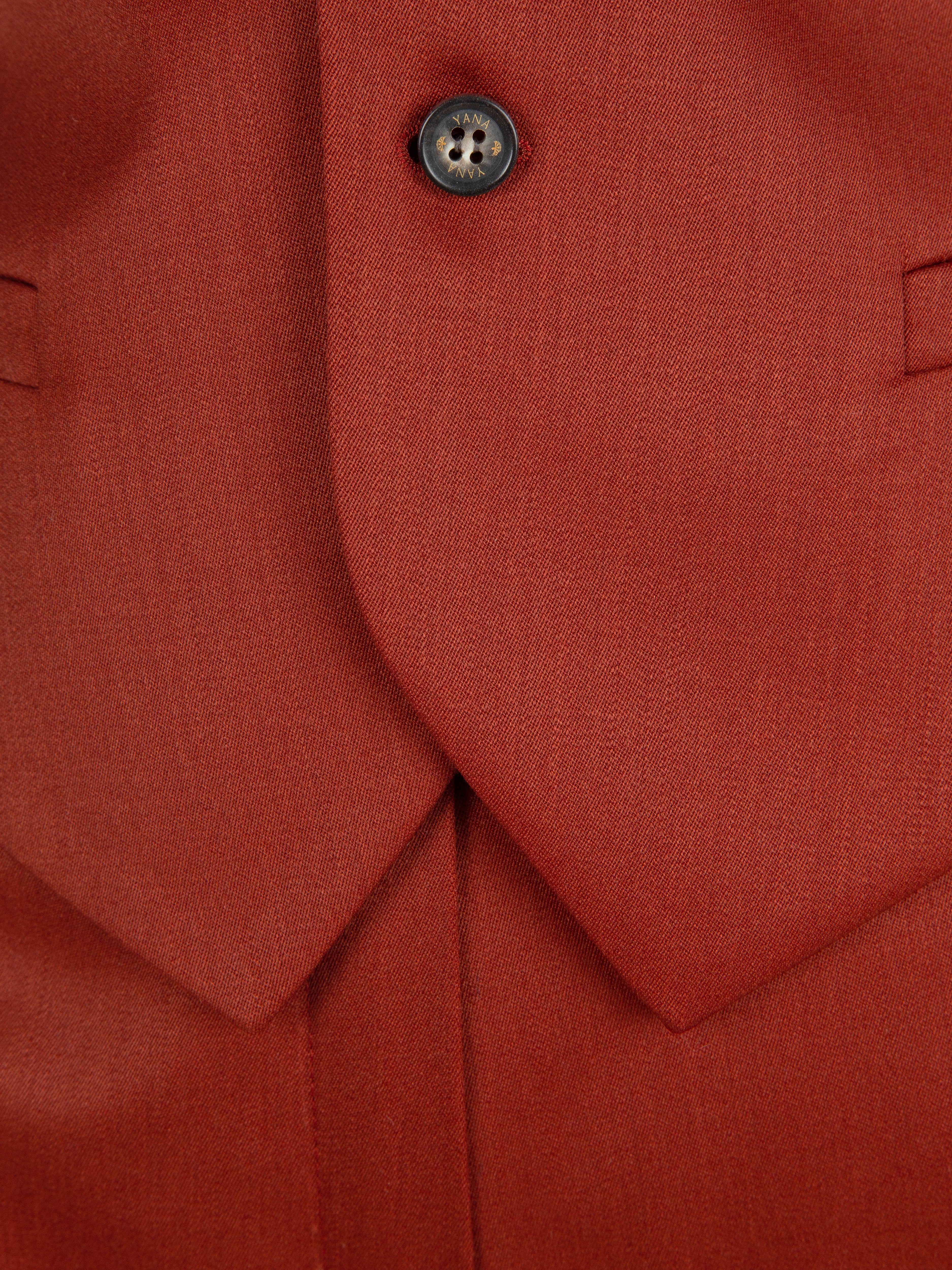 A terracotta three-piece suit consists of straight high-waisted trousers with creases, a vest, and a single-breasted straight-cut blazer with shaped lapels.