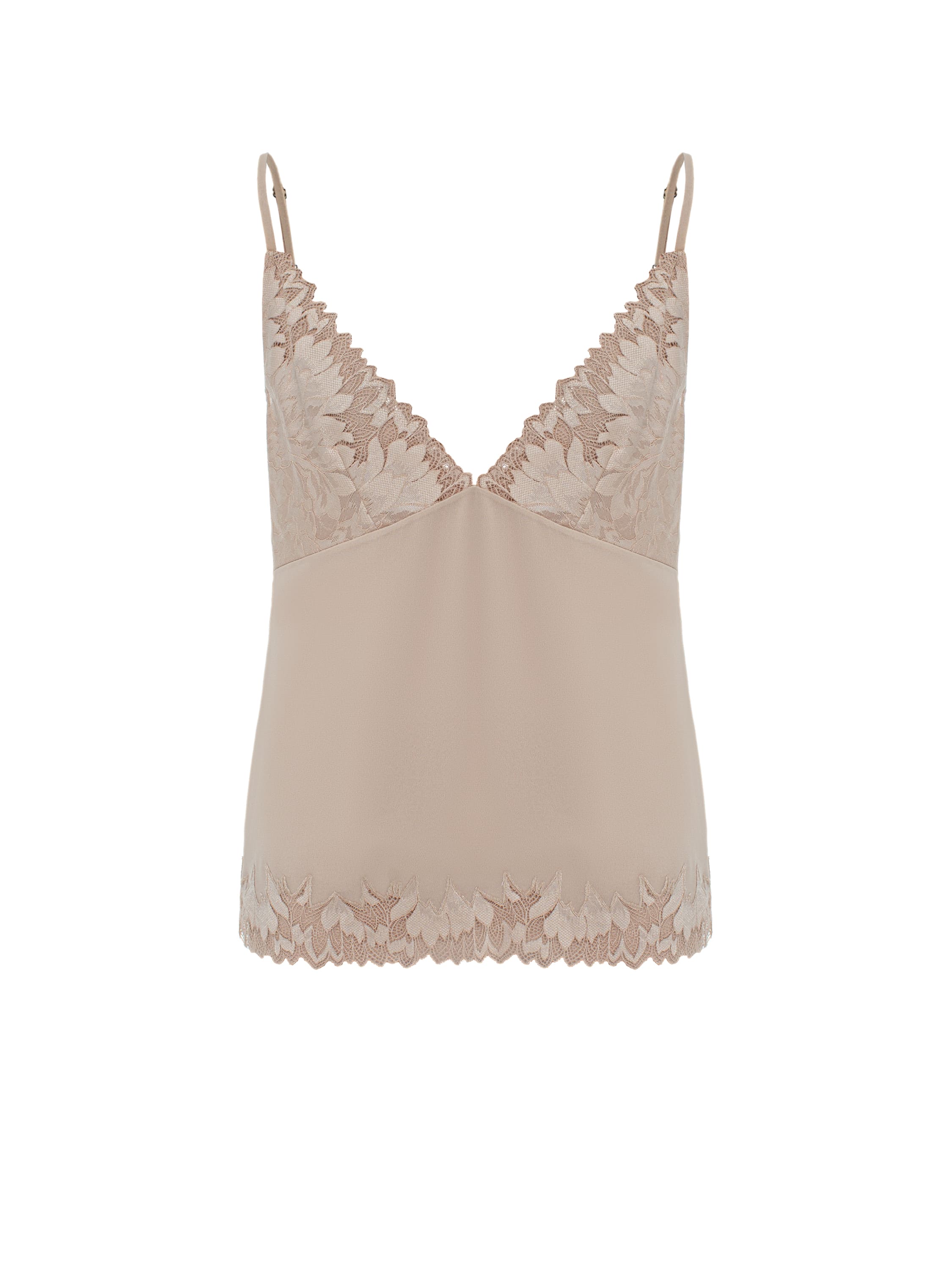 The beige top with thin straps is made of chiffon. The décolleté area and the hem of the piece are decorated with elegant lace.