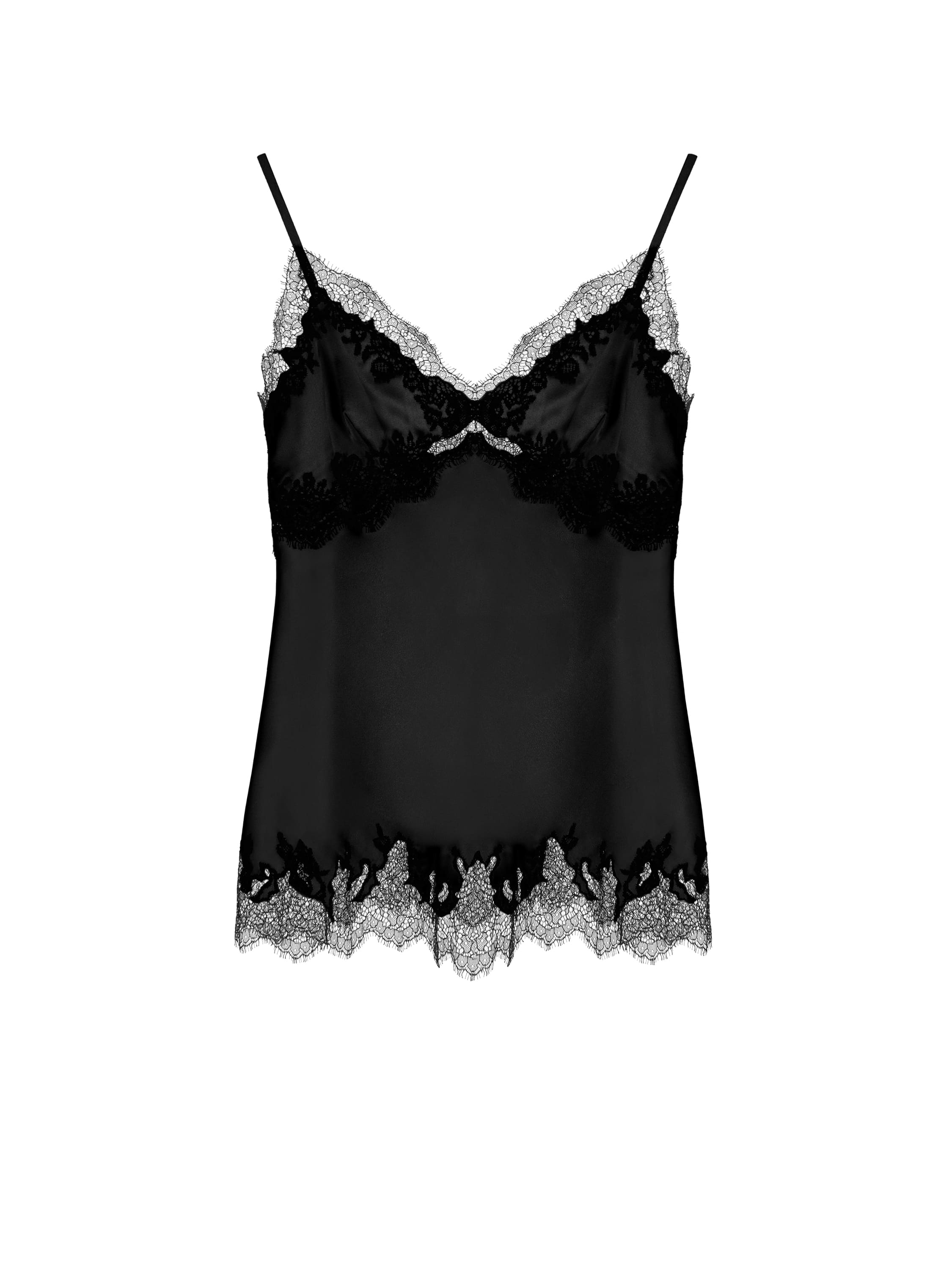 The black top with thin straps is made of silk fabric. The model is decorated with delicate lace trim along the cups and the bottom edge. The artisans of the YANA Fashion House spent 12 hours of handwork preparing the lace.