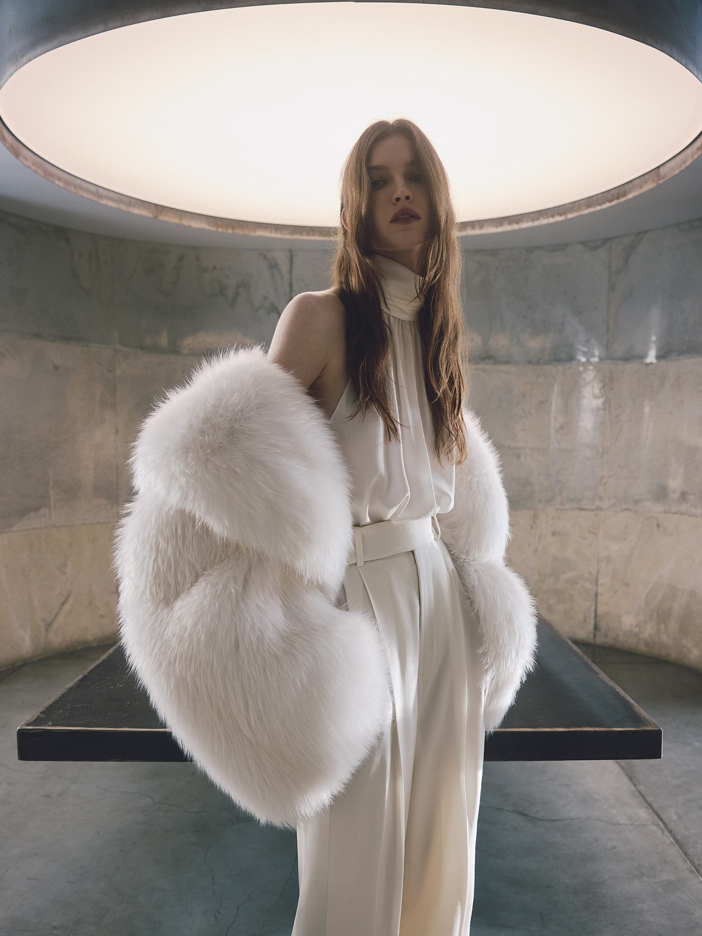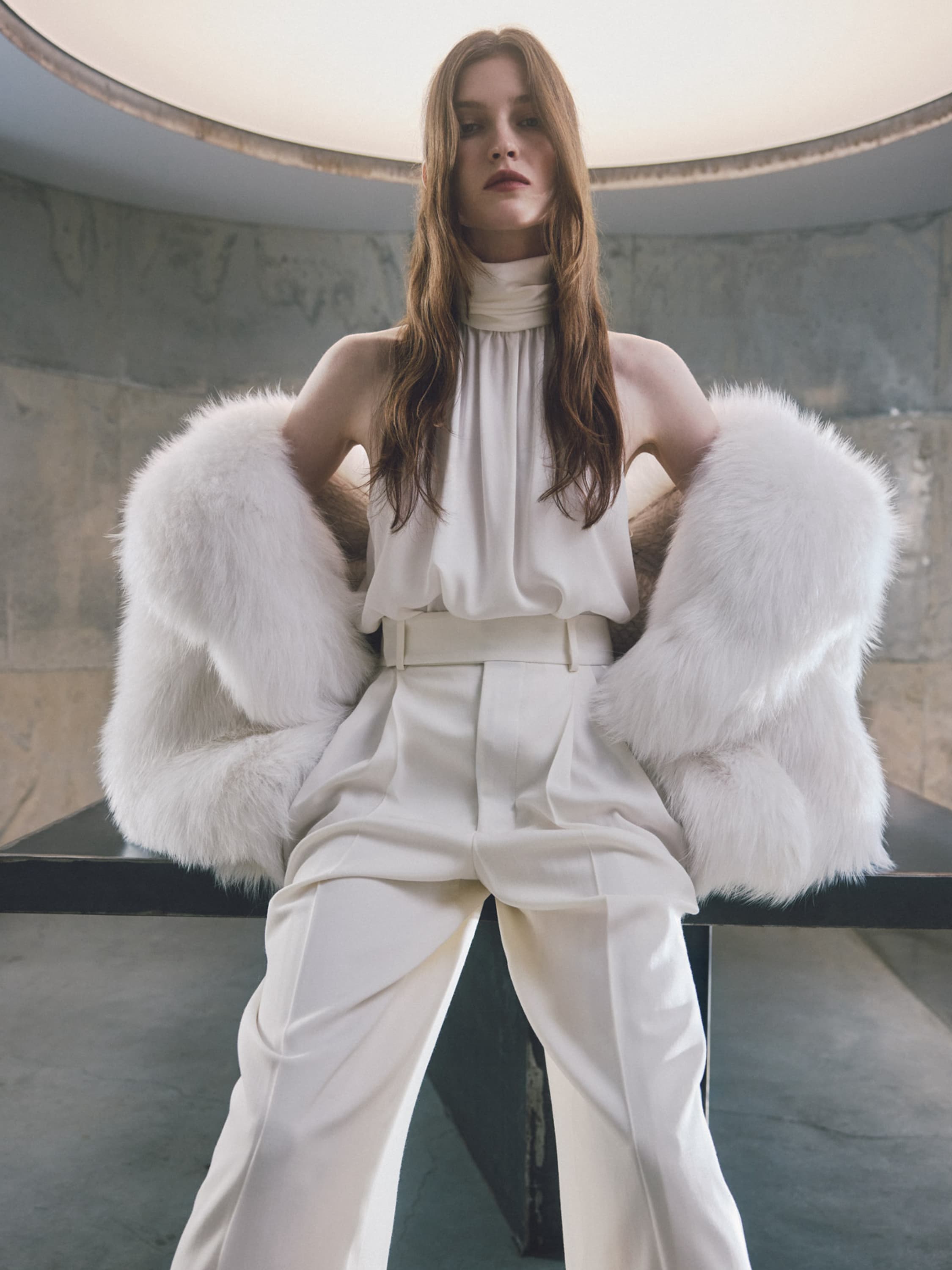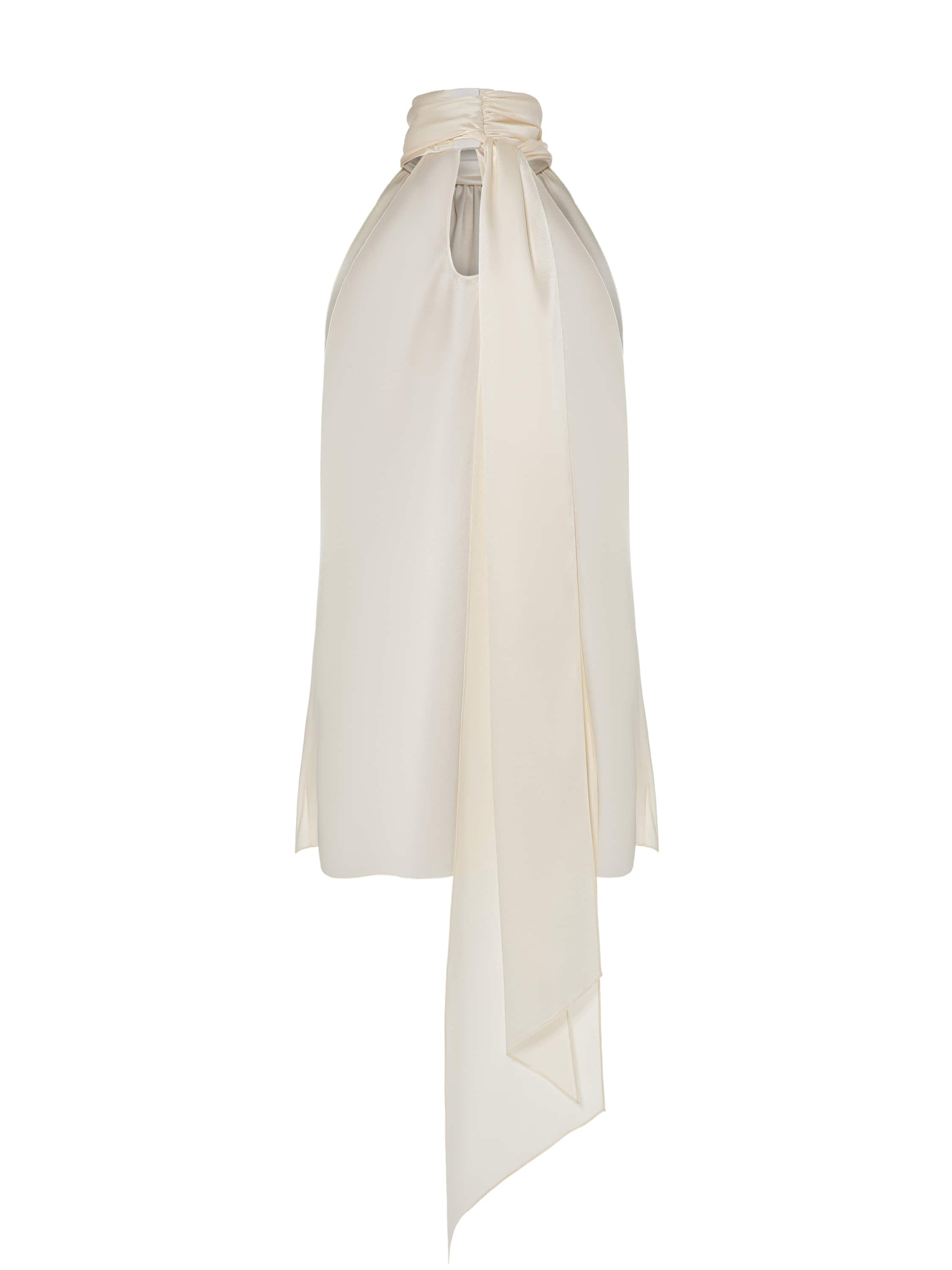 A top made of milky silk fabric is a perfect example of refined femininity: the light, flowing fabric creates delicate drapes and gives the look an airy feel. The strict stand-up collar is complemented by long ties that can be formed into an accent bow. The halter armhole gracefully bares the shoulders.