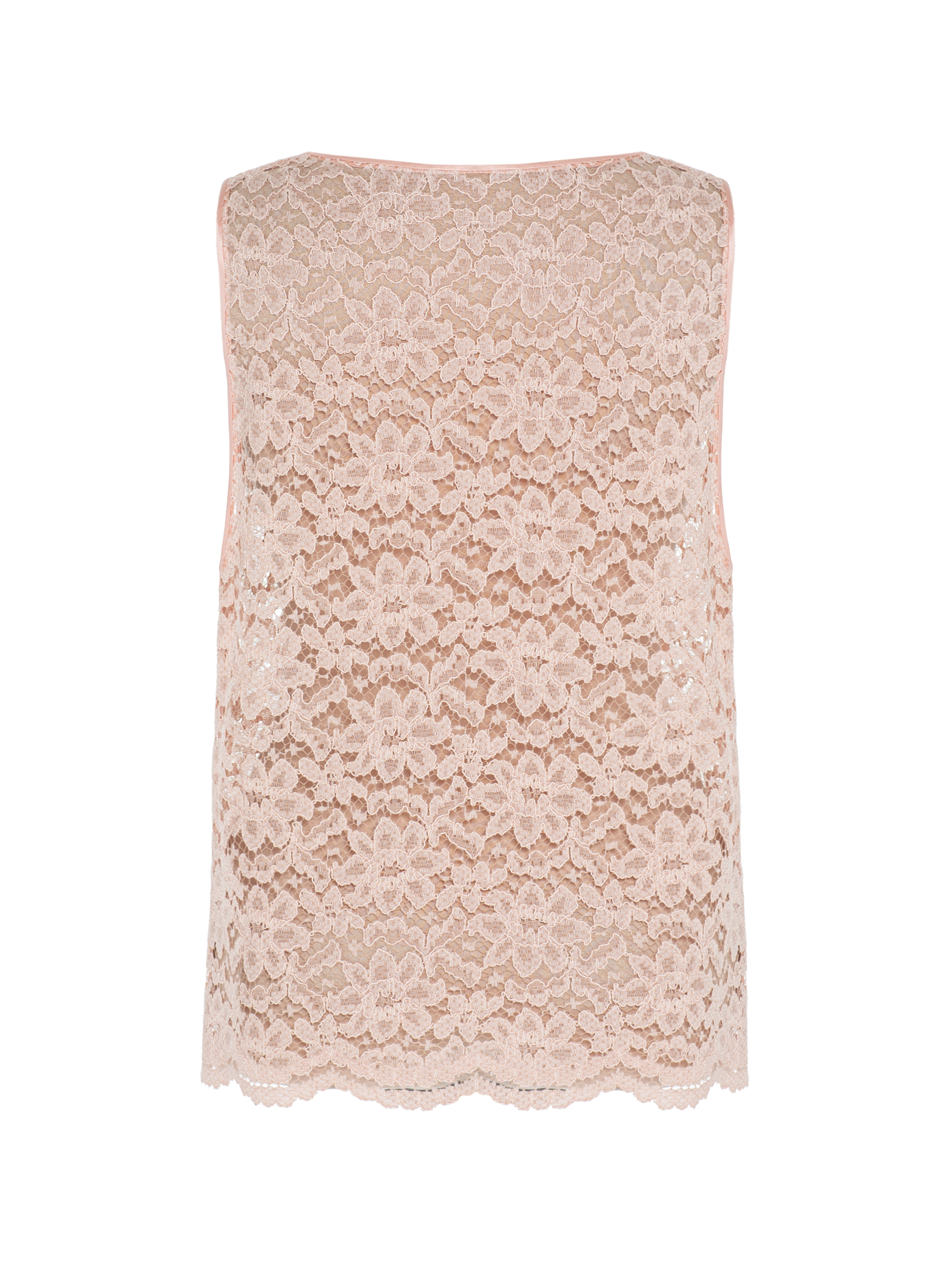 An elegant top made of peach lace will be a perfect foundation for any look. The piece is complemented by delicate scalloped trim along the hem.