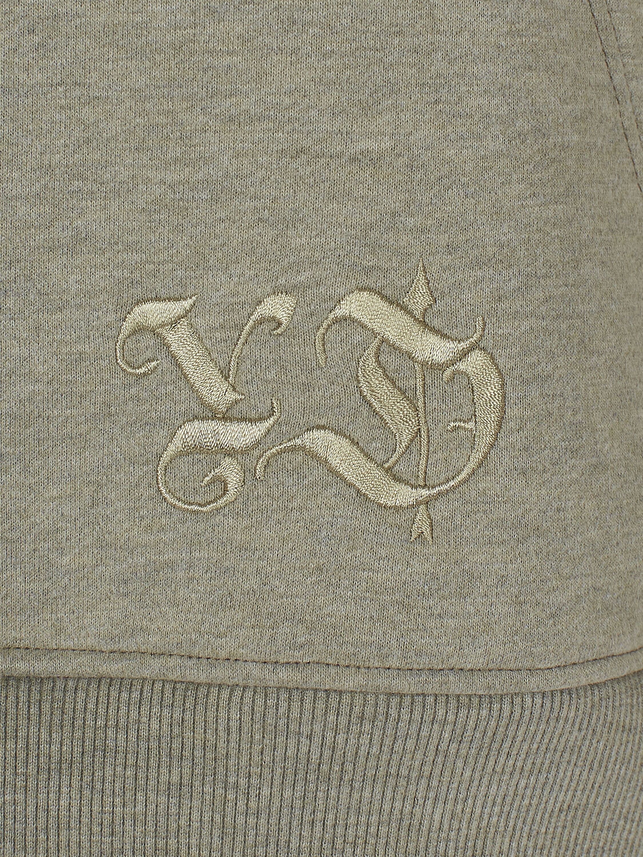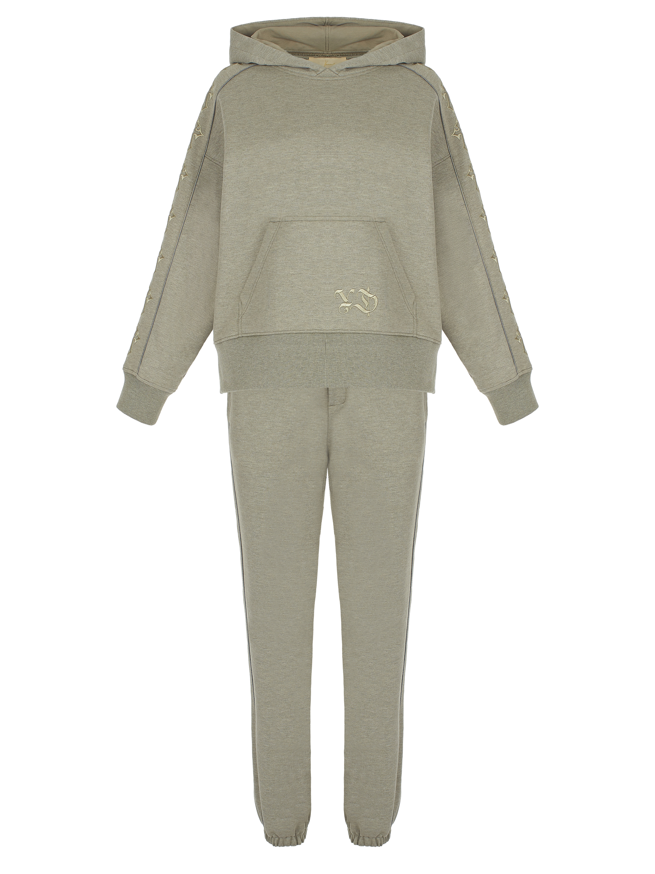 The knitted suit made of melange khaki jersey consists of a hoodie with tone-on-tone cross embroidery on the sleeves and track pants with side stripes and elasticated cuffs. Large kangaroo pocket with brand logo on the front.