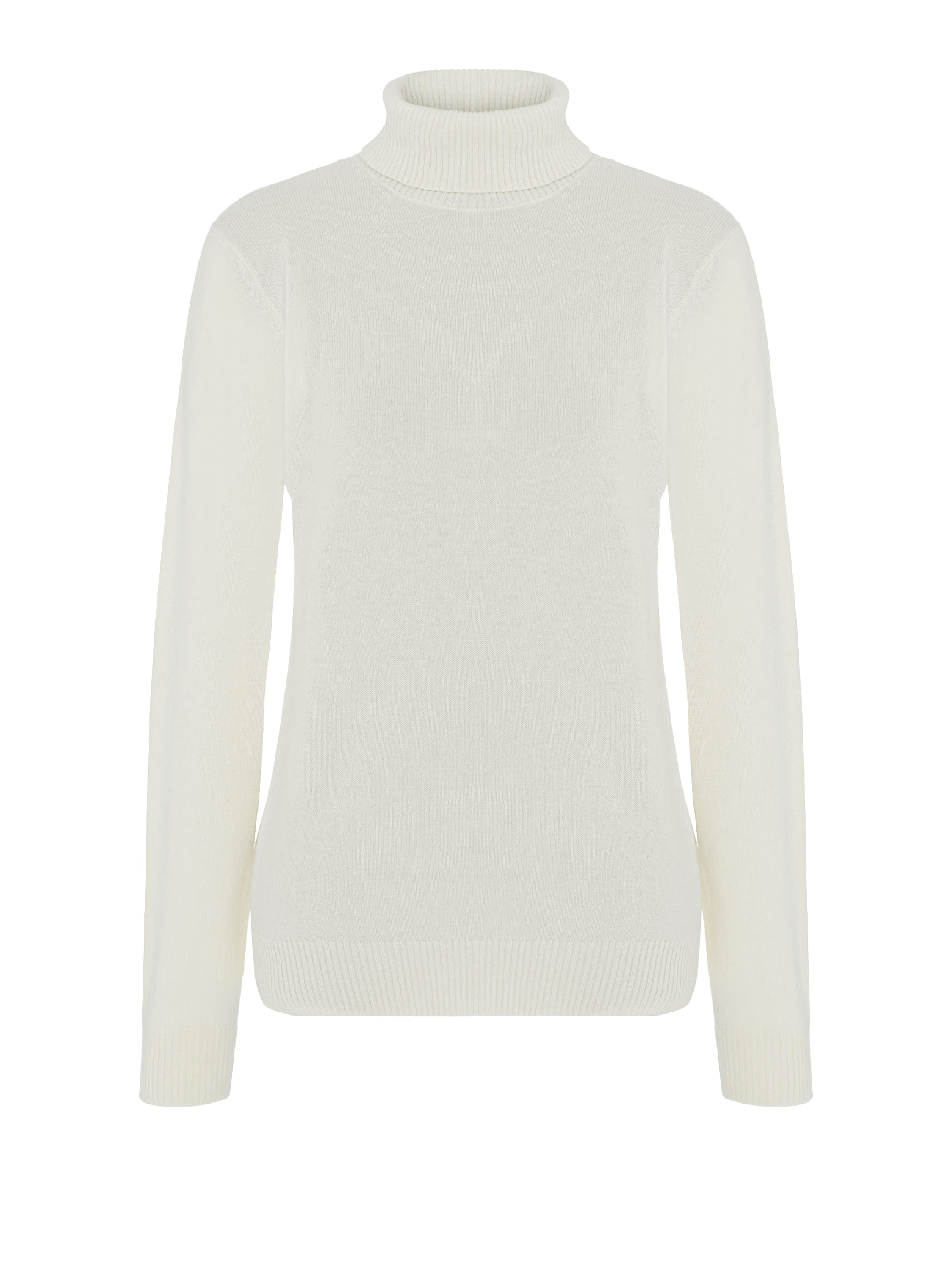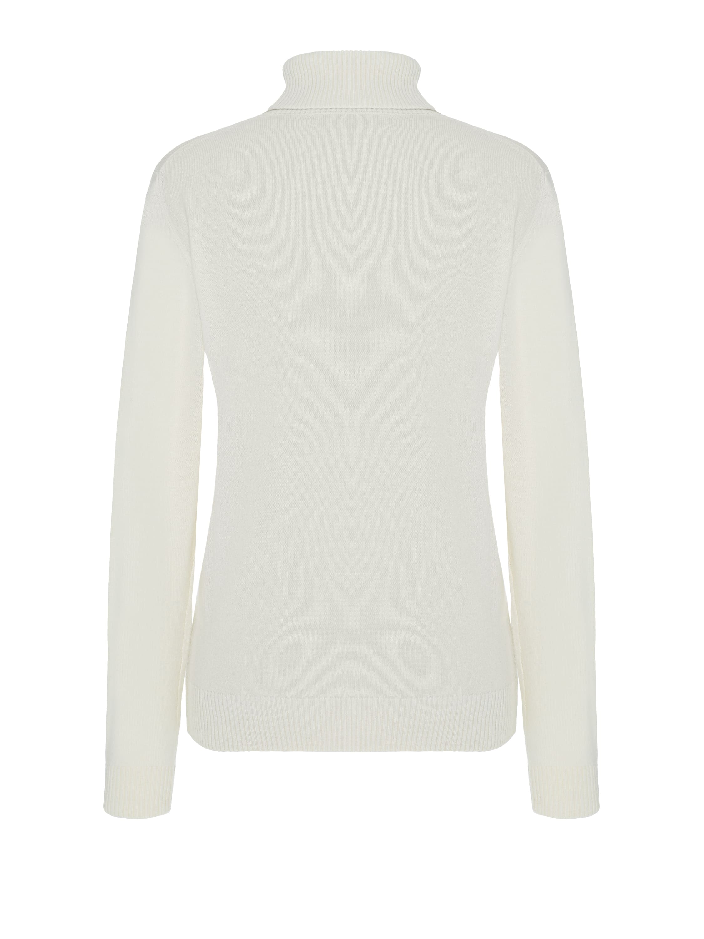 The solid milk-colored turtleneck is knitted from soft cashmere yarn. The design with a high neckline will be an ideal choice for an everyday look.