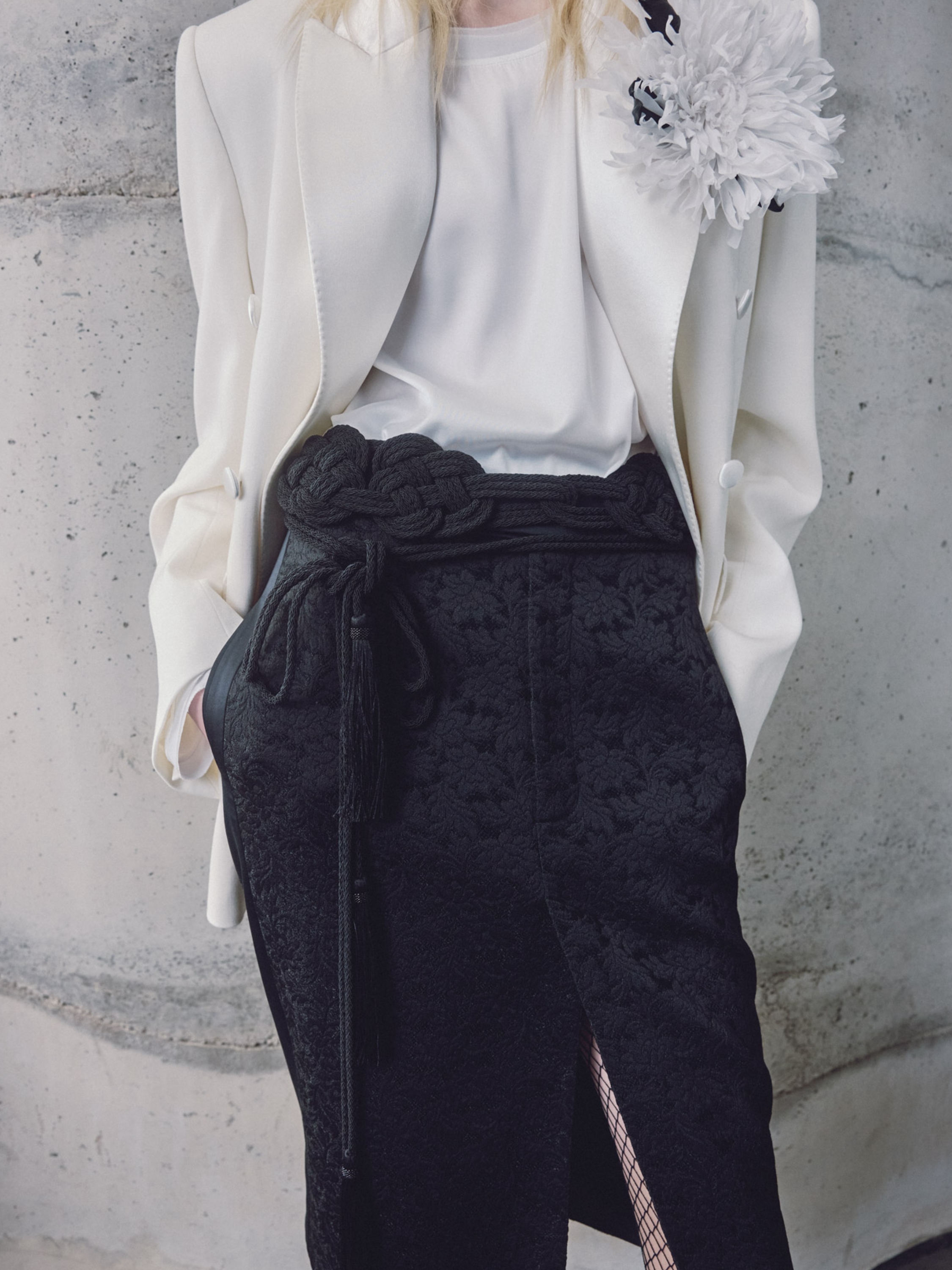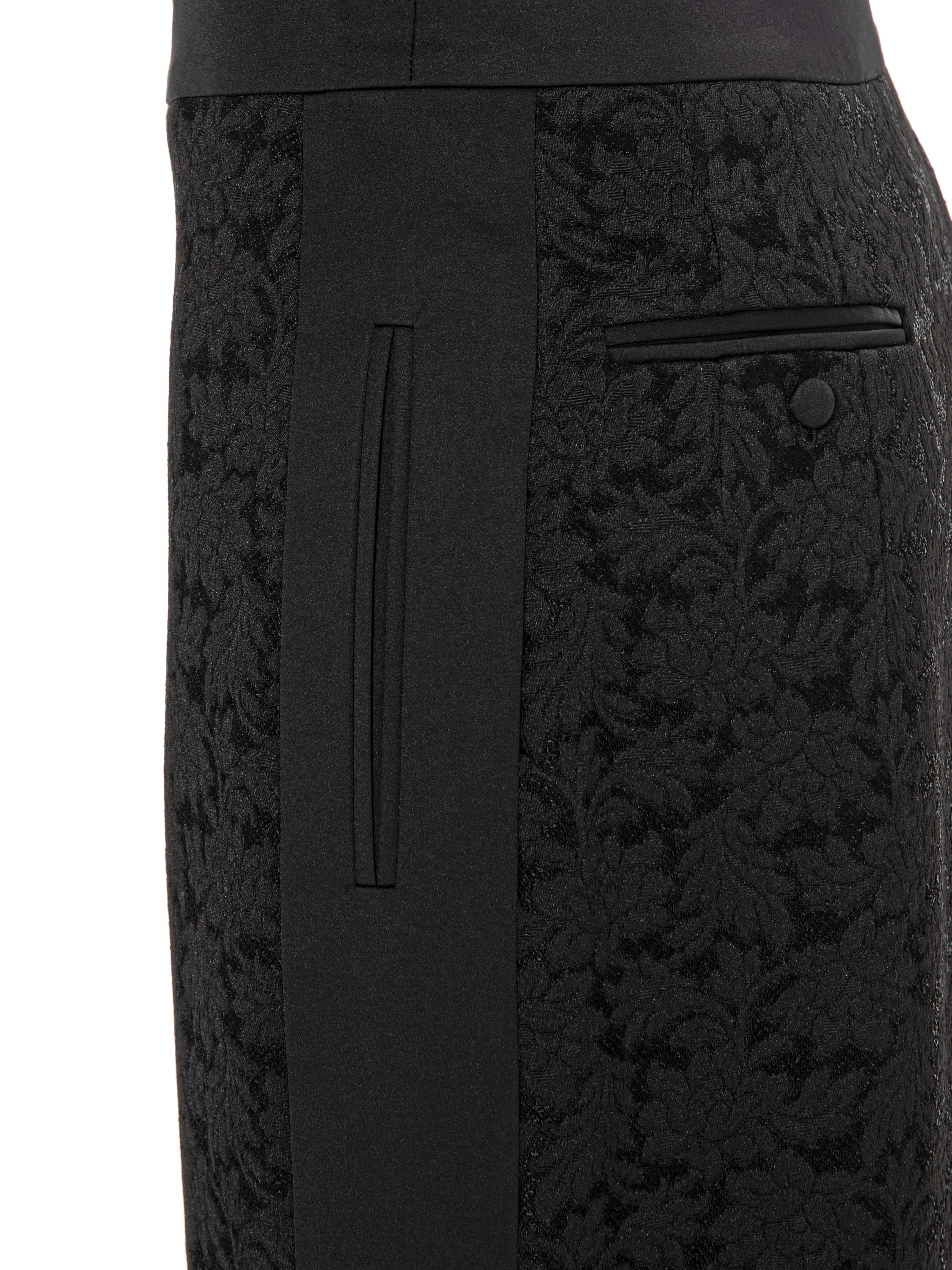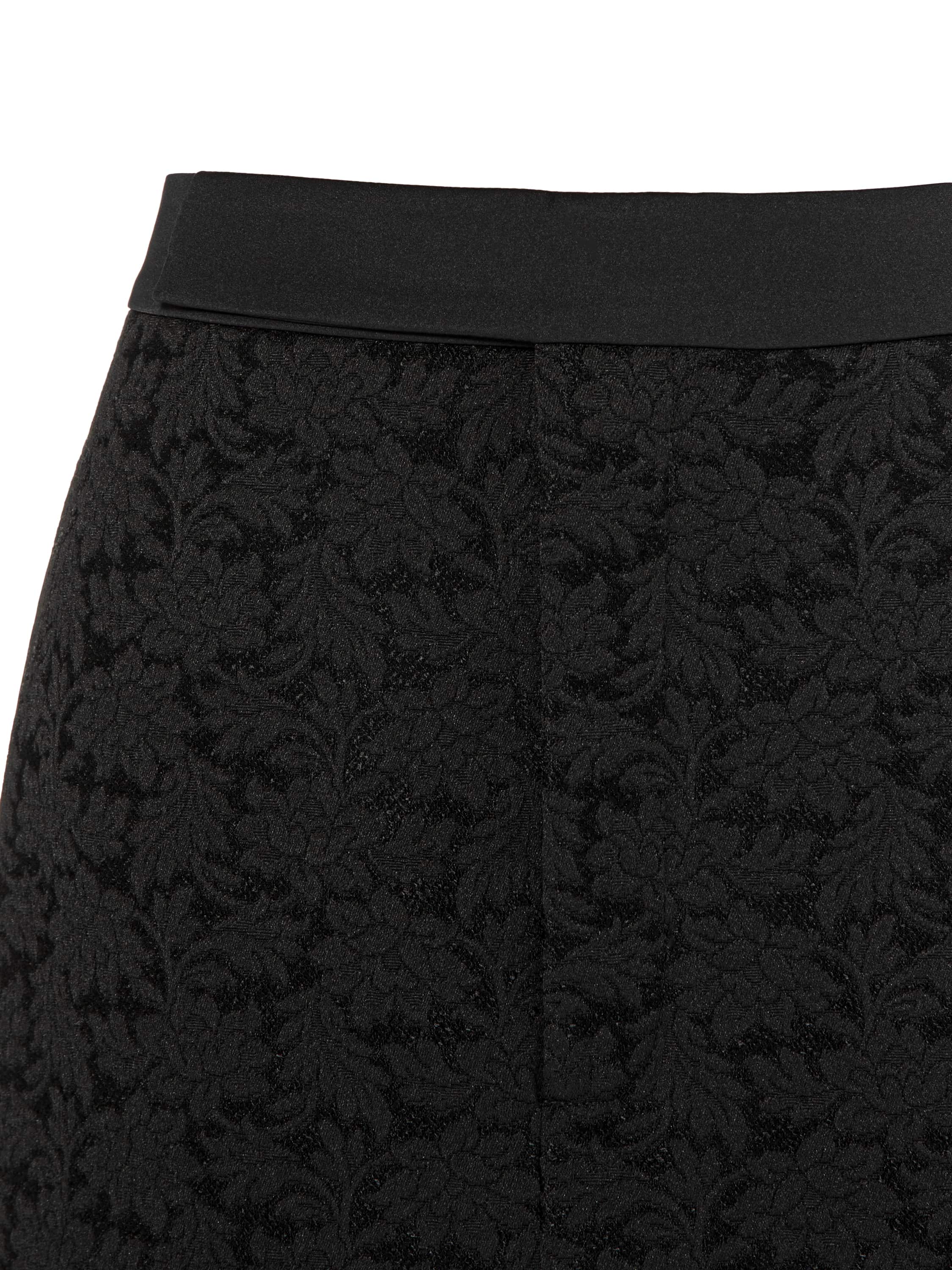 The black below-the-knee skirt is made of dense jacquard with a textured floral pattern. The model is complemented by a front slit and vertical side stripes that visually elongate the silhouette. Length of the item from the waistband: 61 cm.