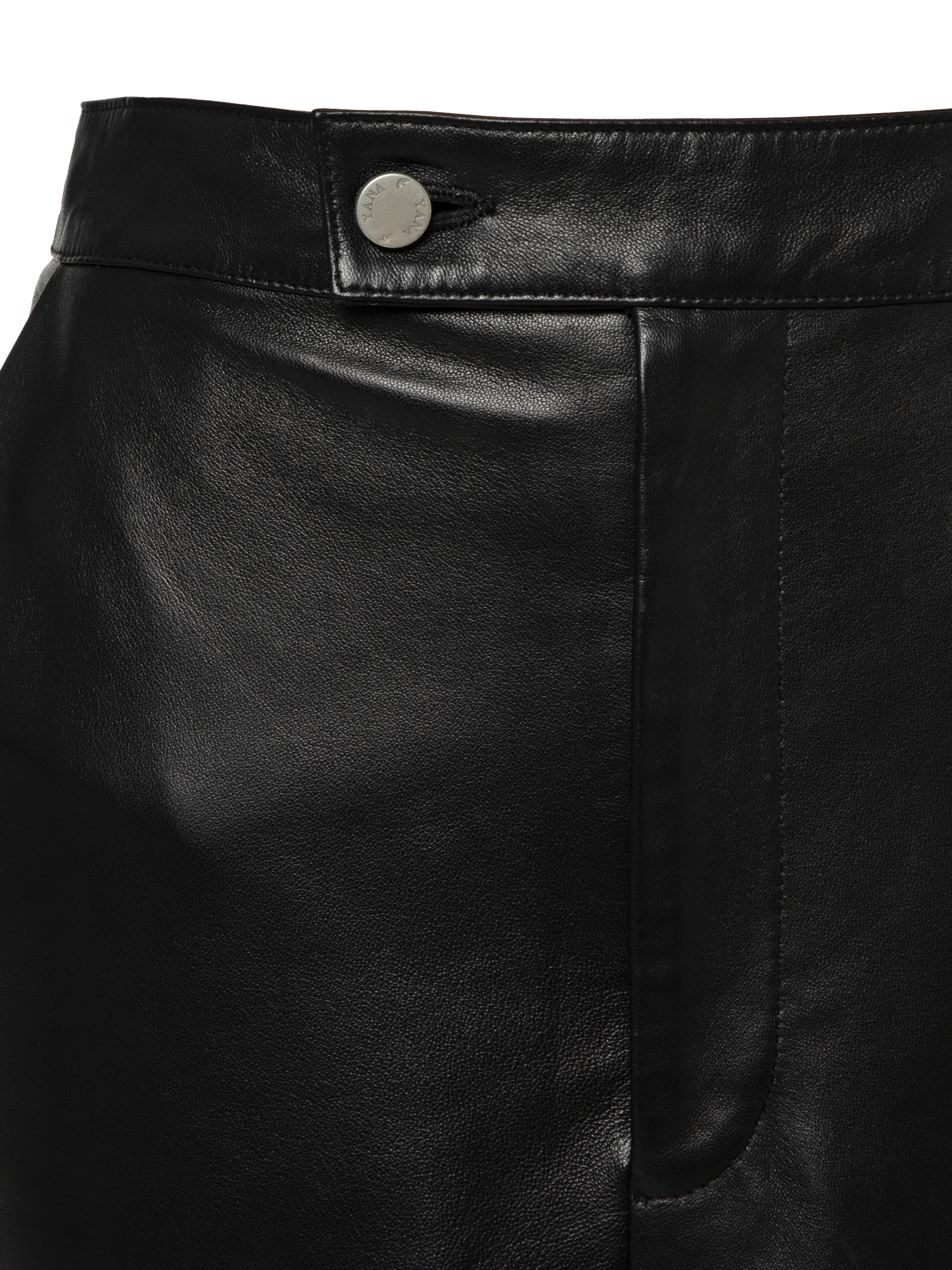 A black pencil skirt with a high front slit made of soft lambskin leather. The midi-length design will be a versatile option for creating an everyday look.