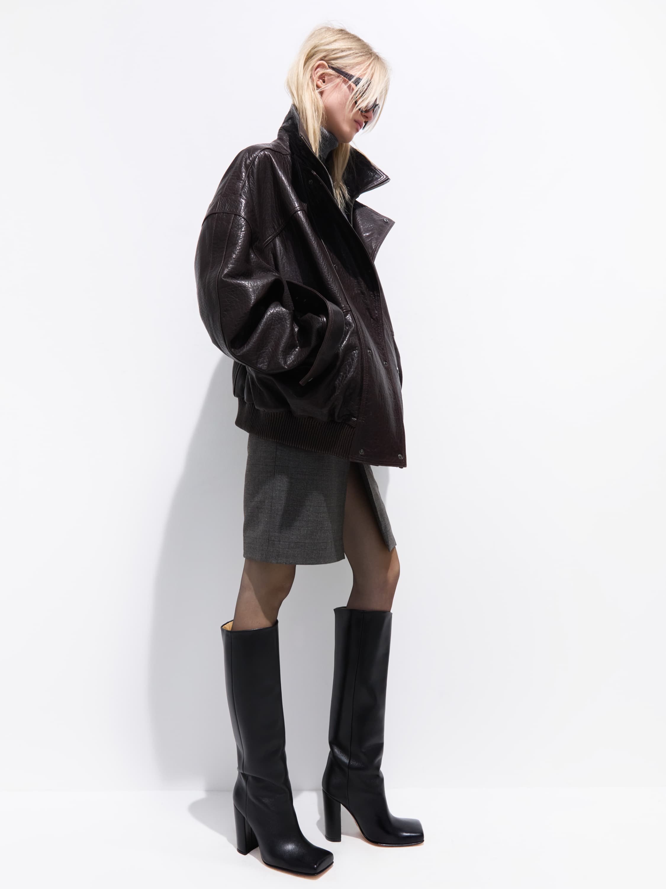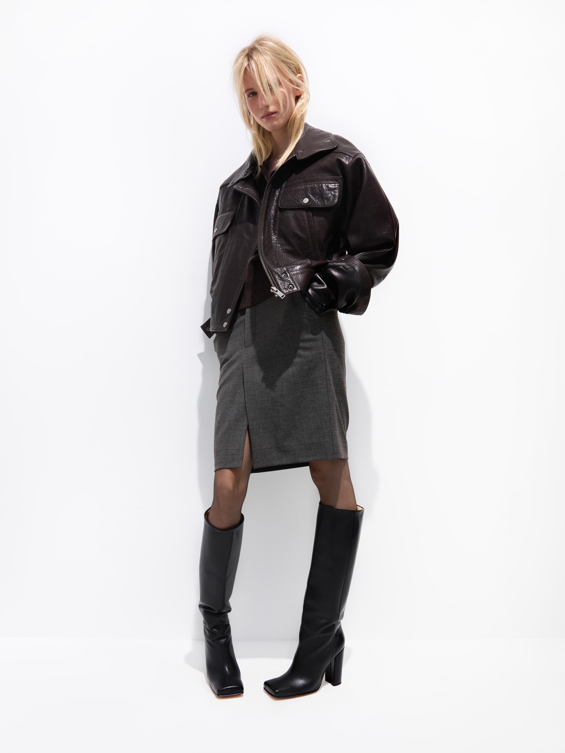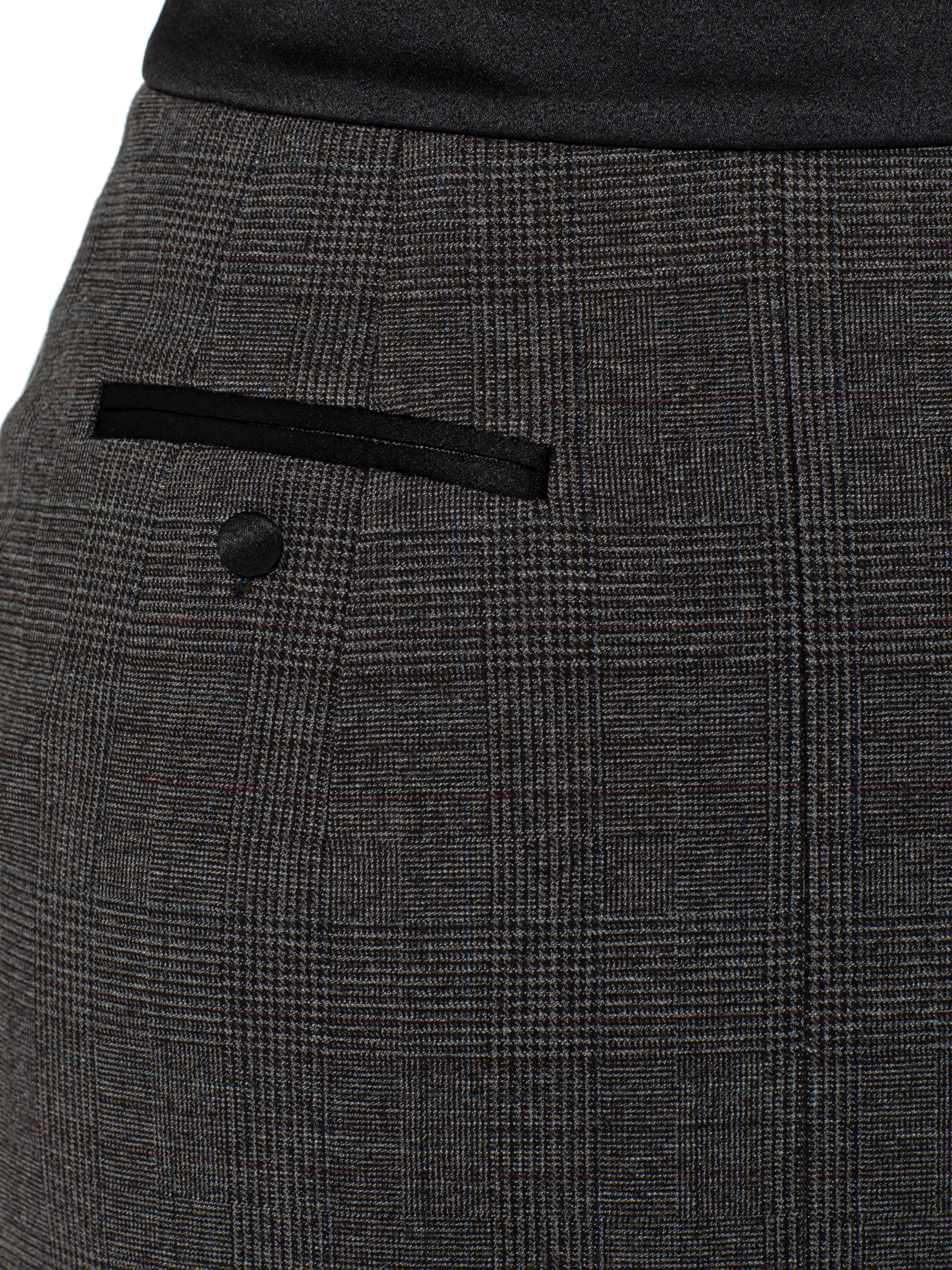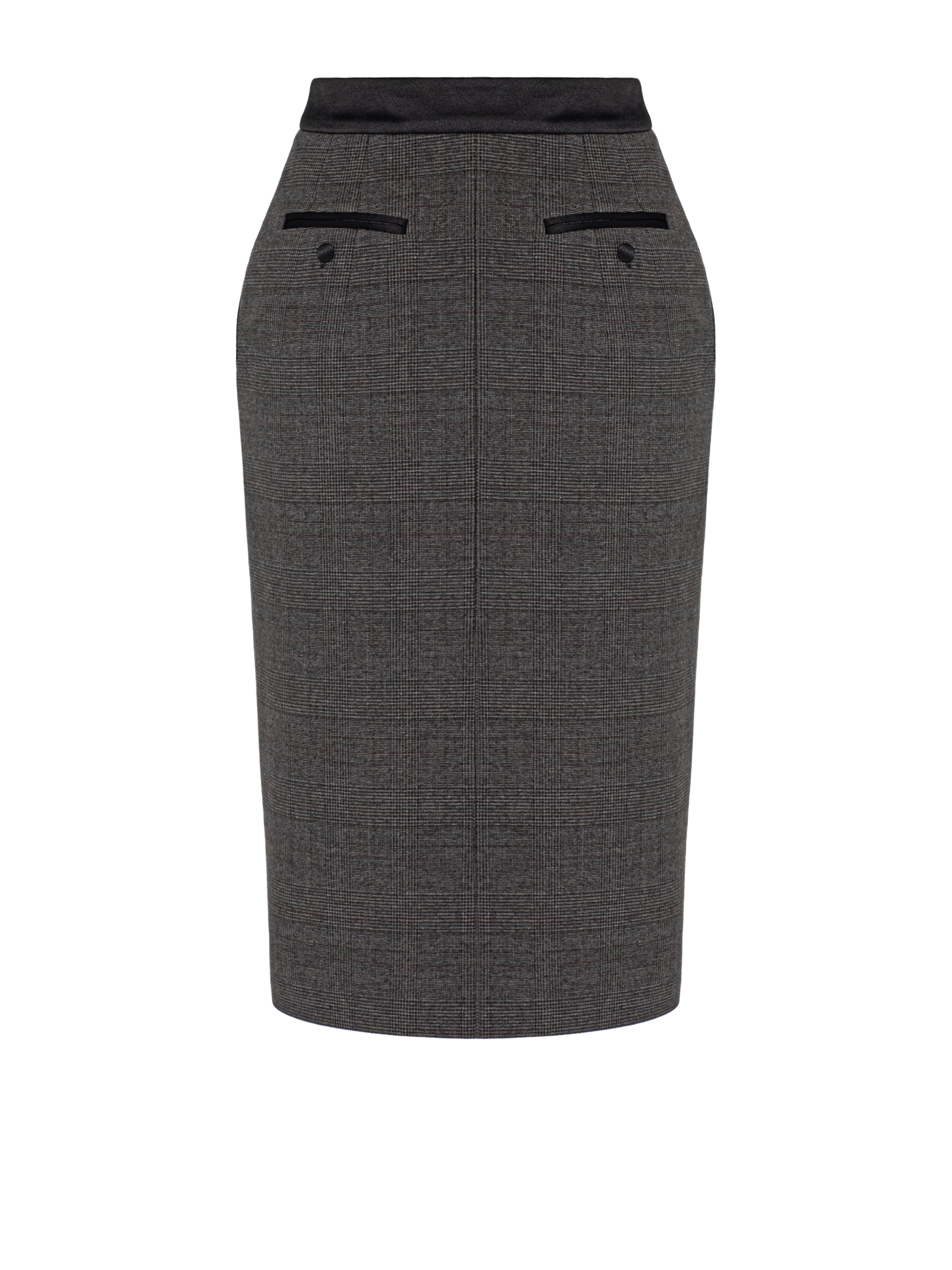 The below-the-knee pencil skirt is made of grey suiting fabric in a concise check pattern. The satin waistband delicately emphasizes the waist, while the practical front slit ensures freedom of movement. A double-breasted blazer with statement shoulders from the new Yana collection will be the perfect complement to the strict yet incredibly feminine look.