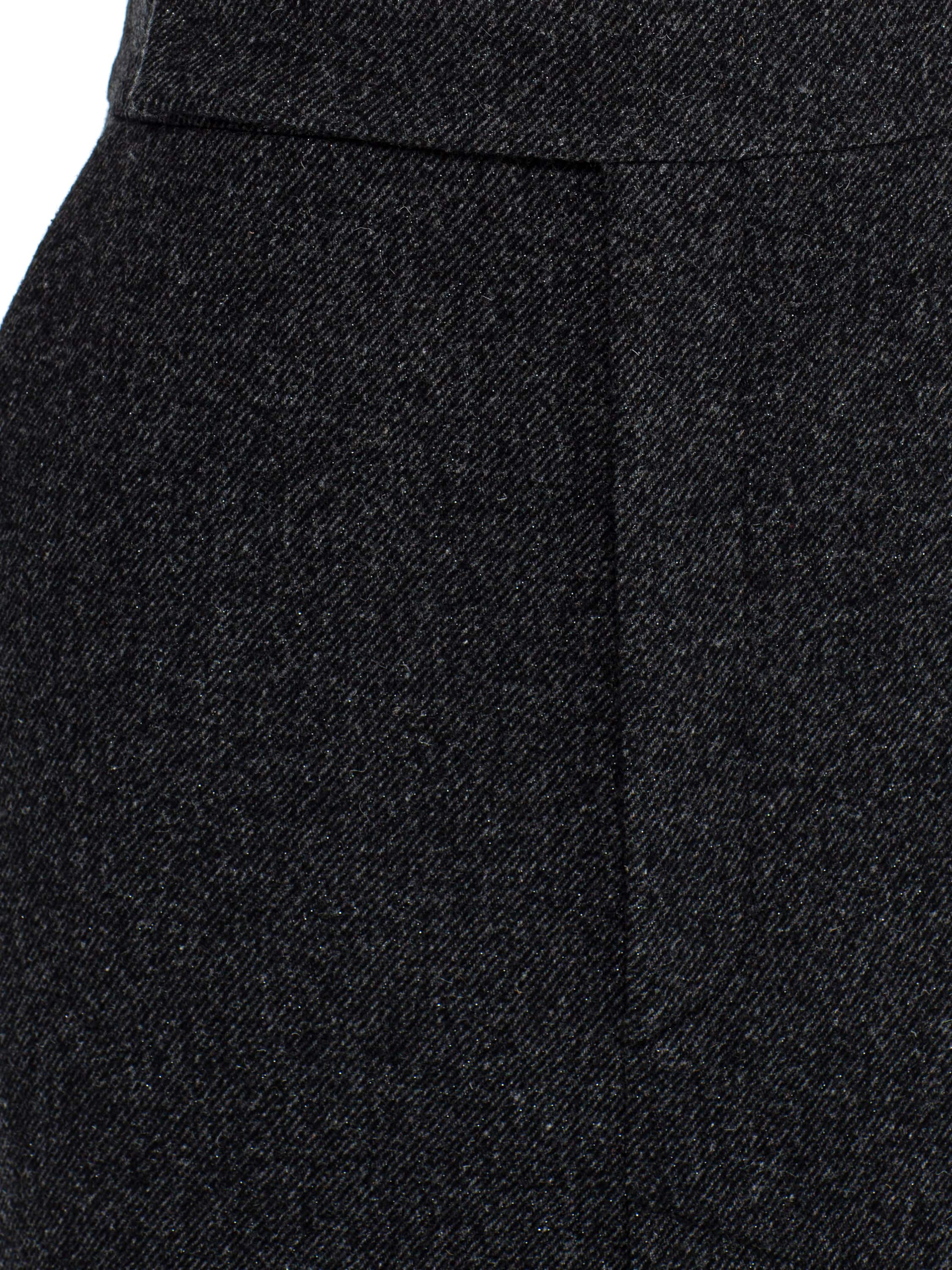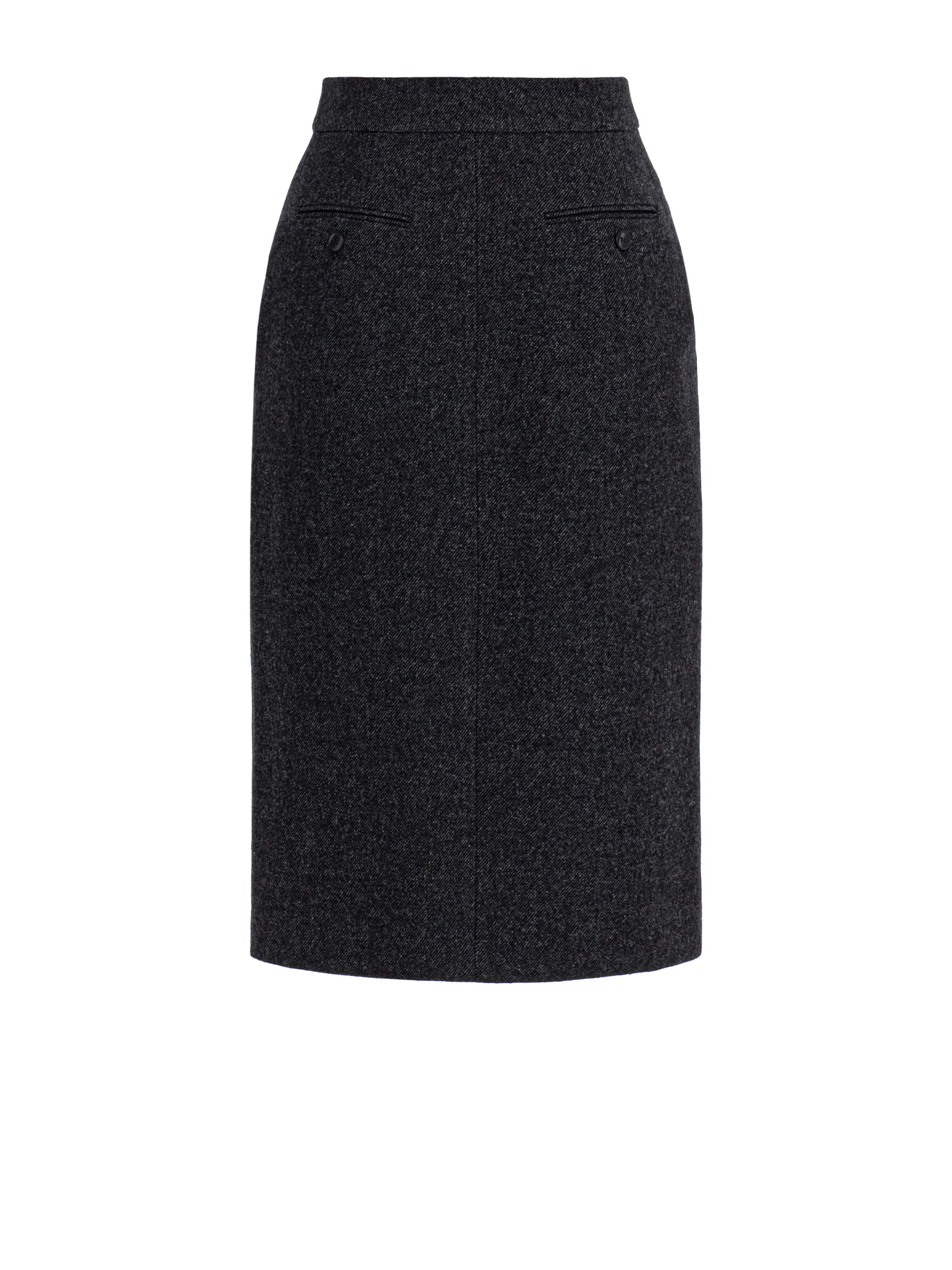 A black below-the-knee skirt is made of wool fabric. The design is complemented by a front slit. Garment length along the side seam: 64.7 cm.