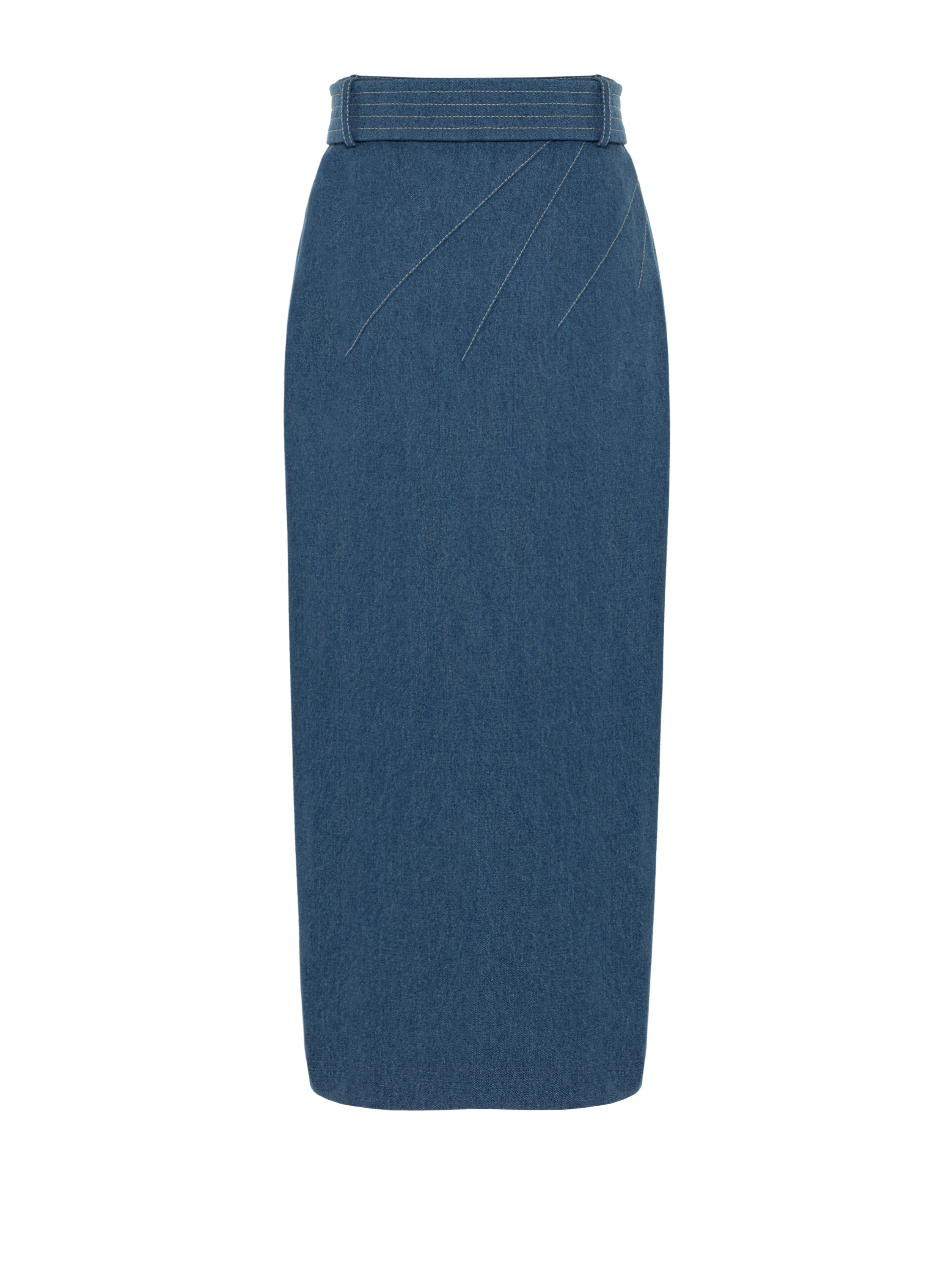 A solid-color high-rise pencil skirt made of denim. The classic style is complemented with contoured seams and a waistband at the waist.