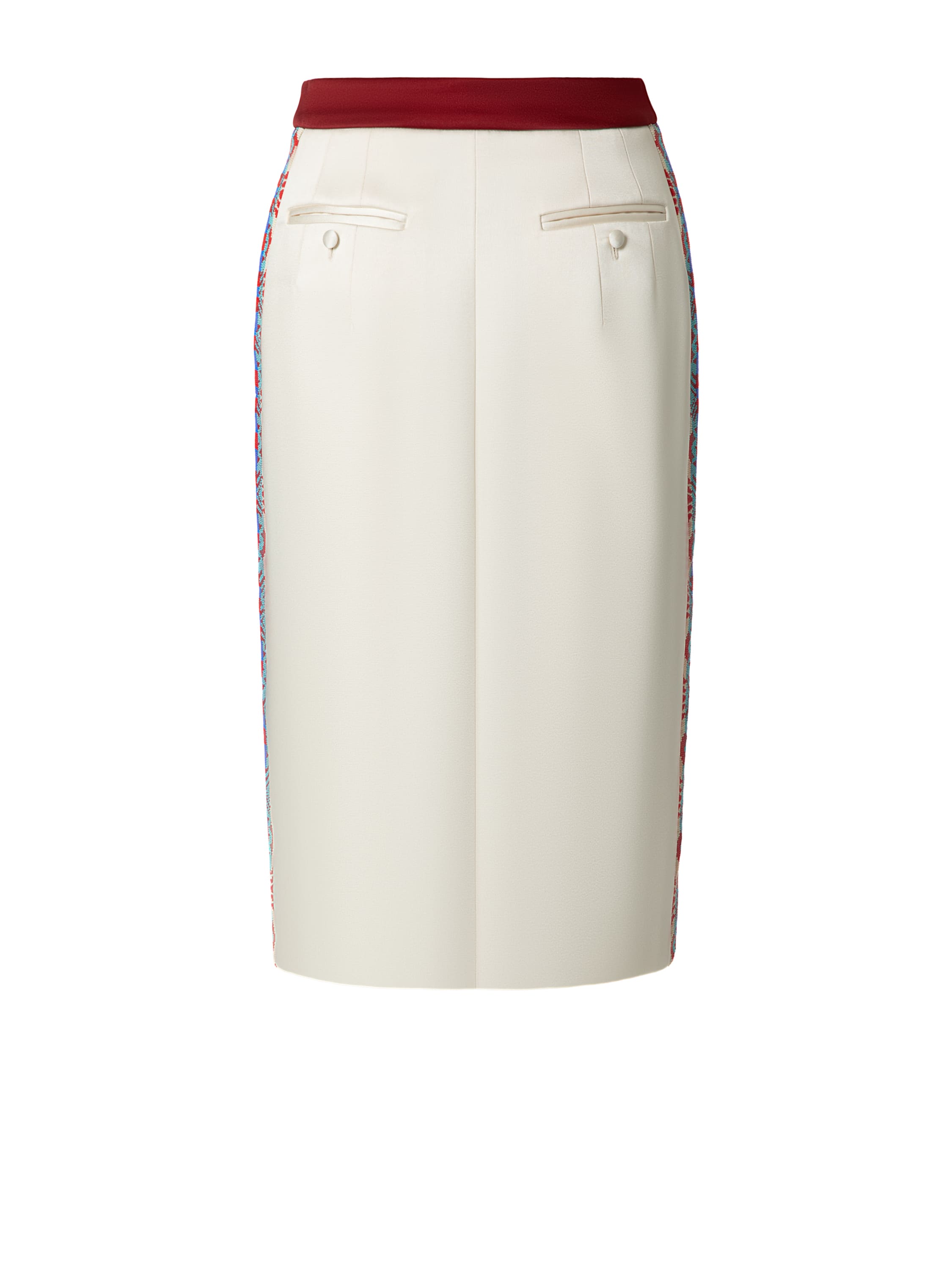 A two‑tone midi skirt with pockets, made of burgundy and milk‑coloured viscose‑based fabric. The model is decorated with bead embroidery featuring ethnic motifs along the side stripes (lambrequins).