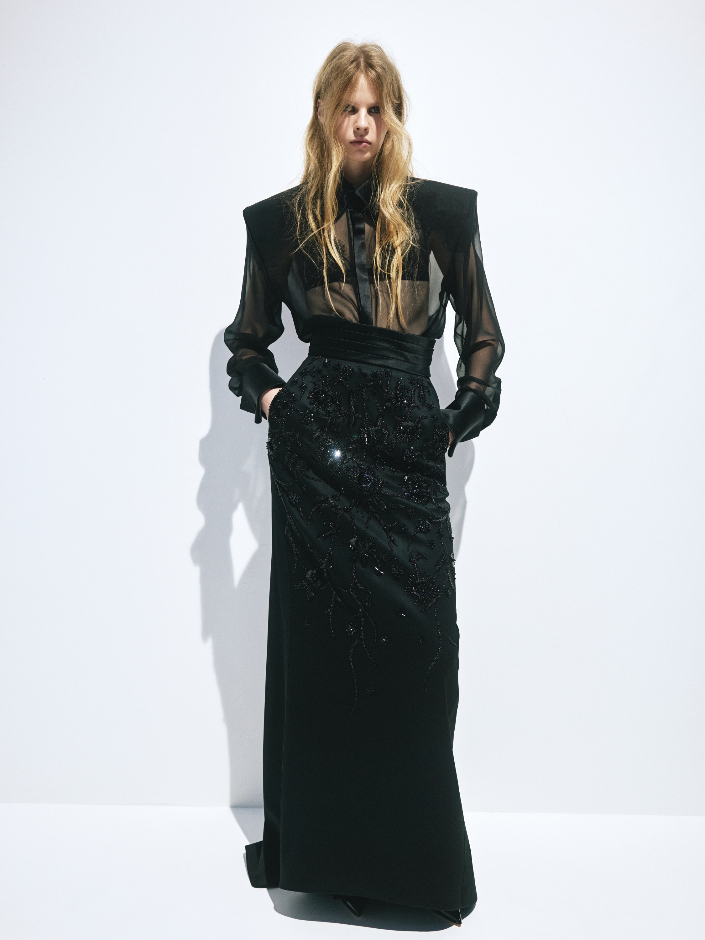The black skirt with a hem is made of suiting wool fabric. The model with a wide waistband and grosgrain side stripes is decorated with floral embroidery using beads, bugle beads, bicone beads and sequins in the Lunéville technique. The craftsmen of the Yana Fashion House spent 116 hours of handwork decorating the piece.
