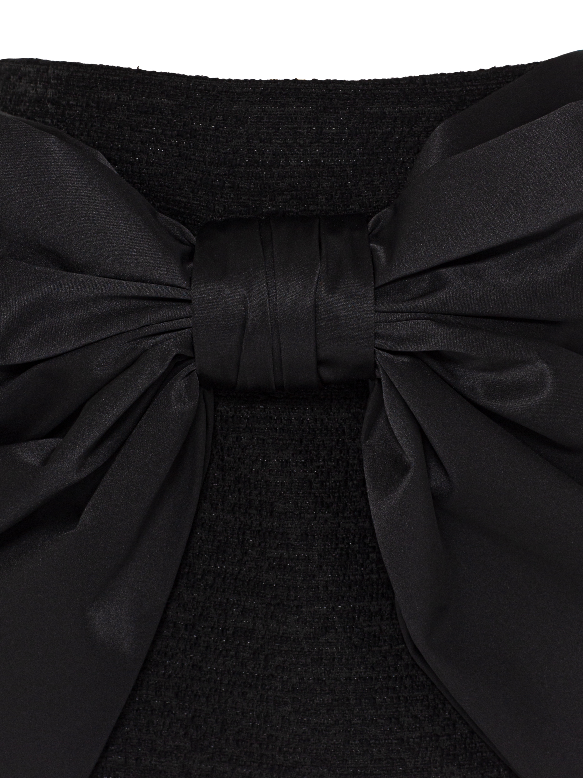 The black mini skirt with an accent bow is an example of impeccable composition. The contrast of dense cotton tweed and delicate silk makes the piece both strict and feminine.