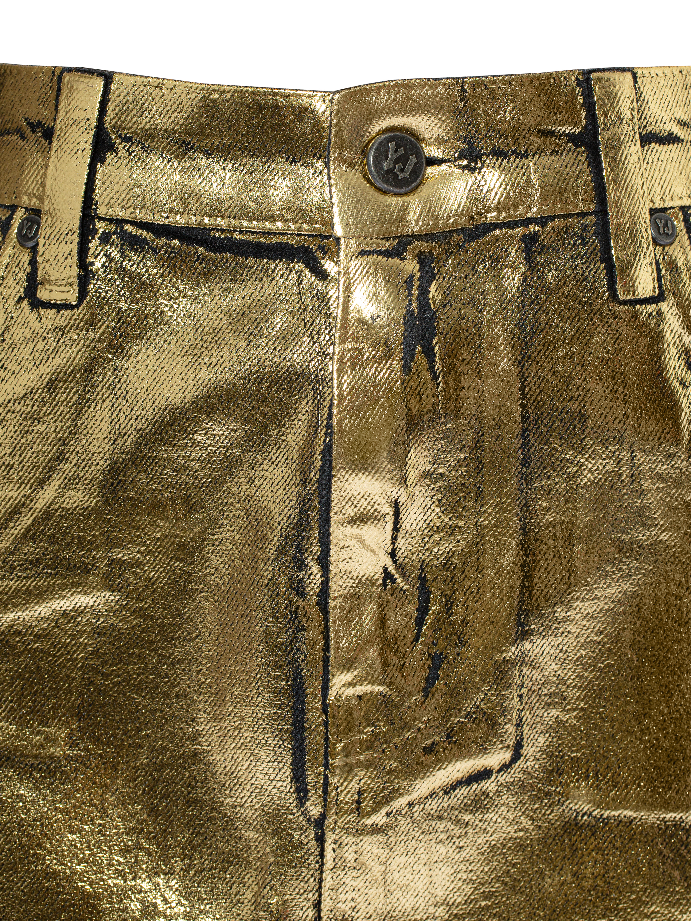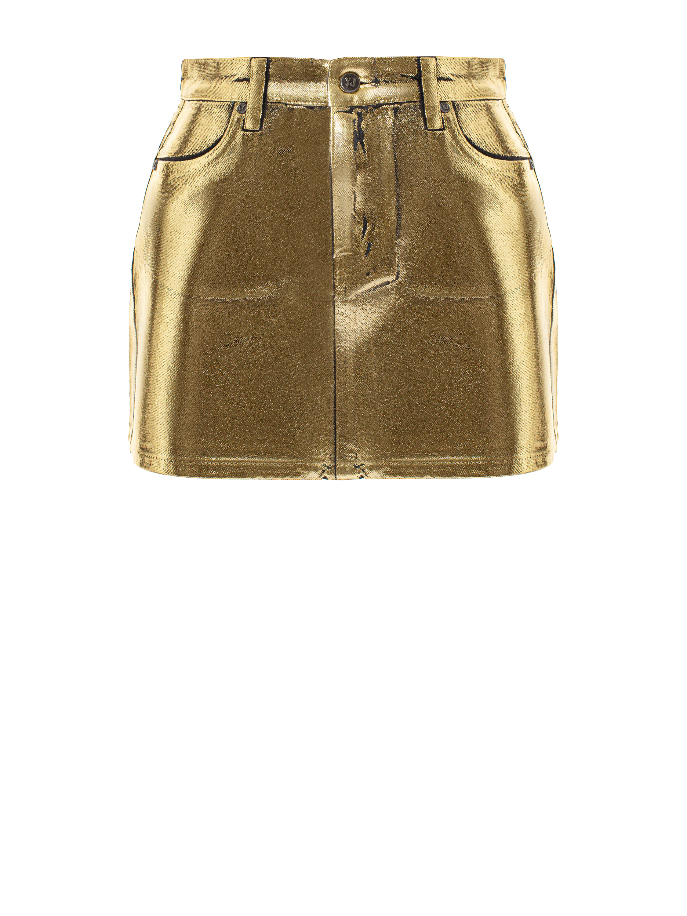 Mini skirt made of black denim with a gold coating. The design is complemented by two side welt pockets and two patch pockets at the back.