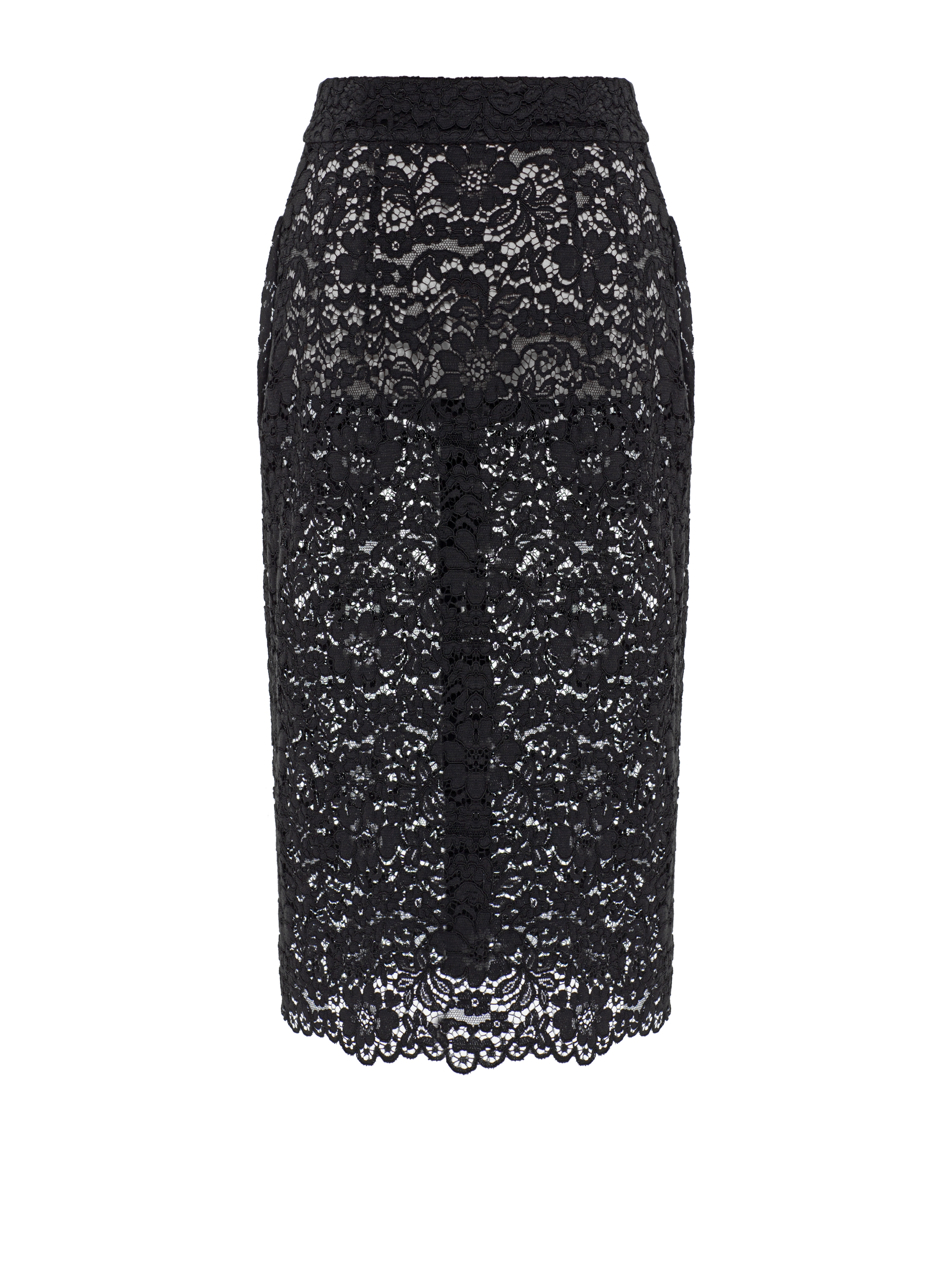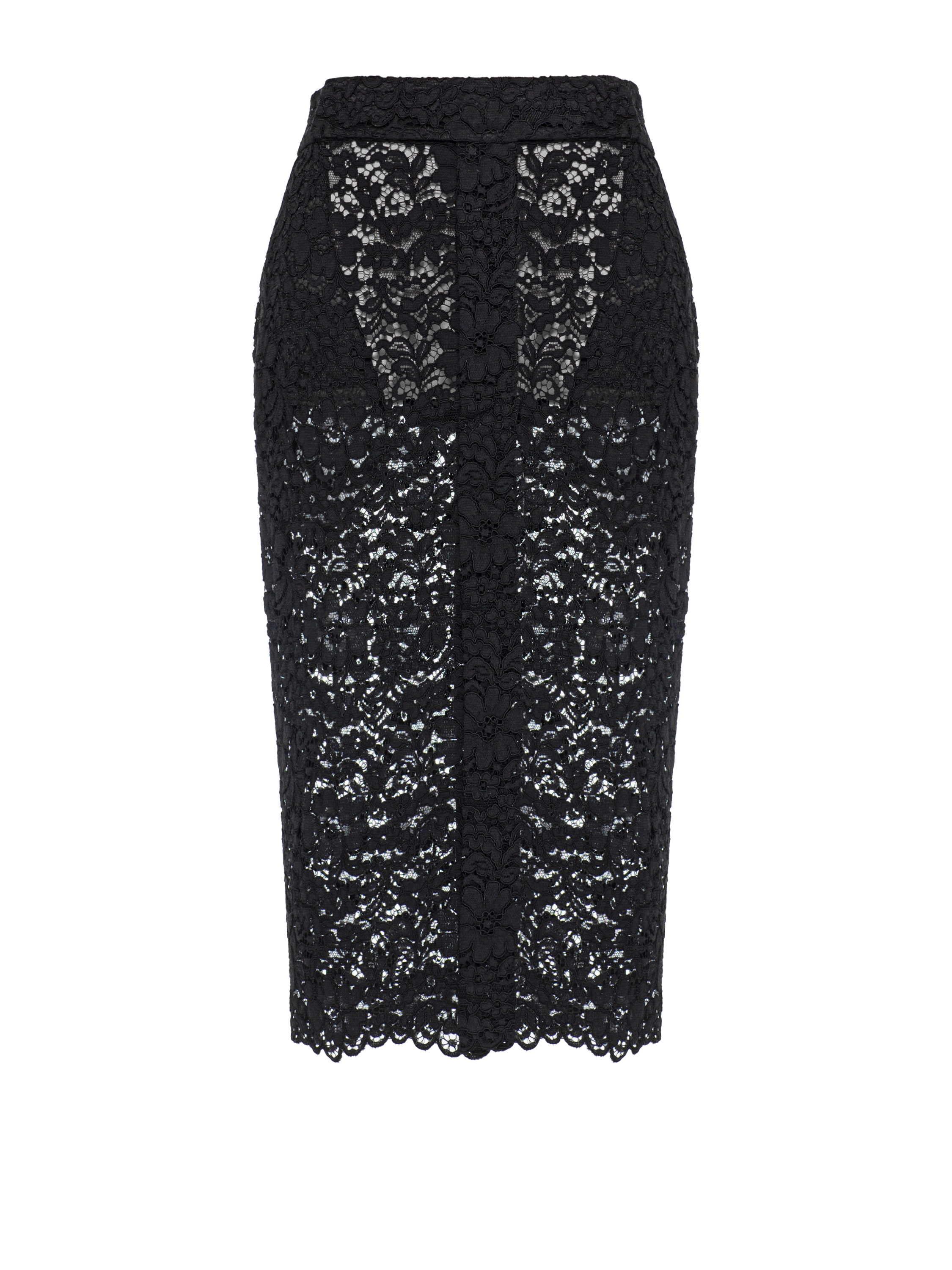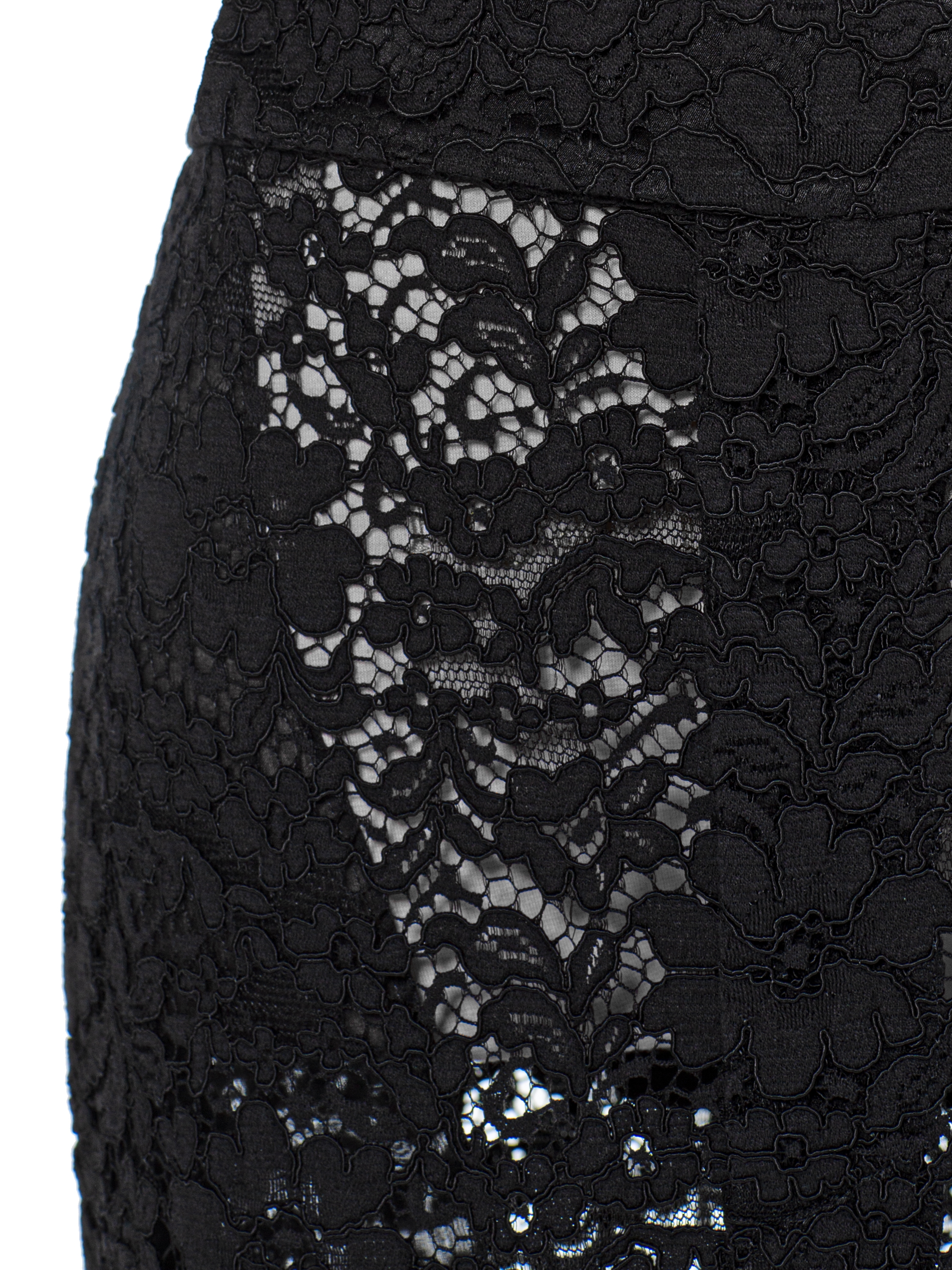 The semi-sheer black lace midi skirt is a true find for creating feminine looks. The lingerie-inspired design is entirely made of lace fabric that gracefully hugs the figure, creating a seductive silhouette. The front slit allows you to show off your legs.