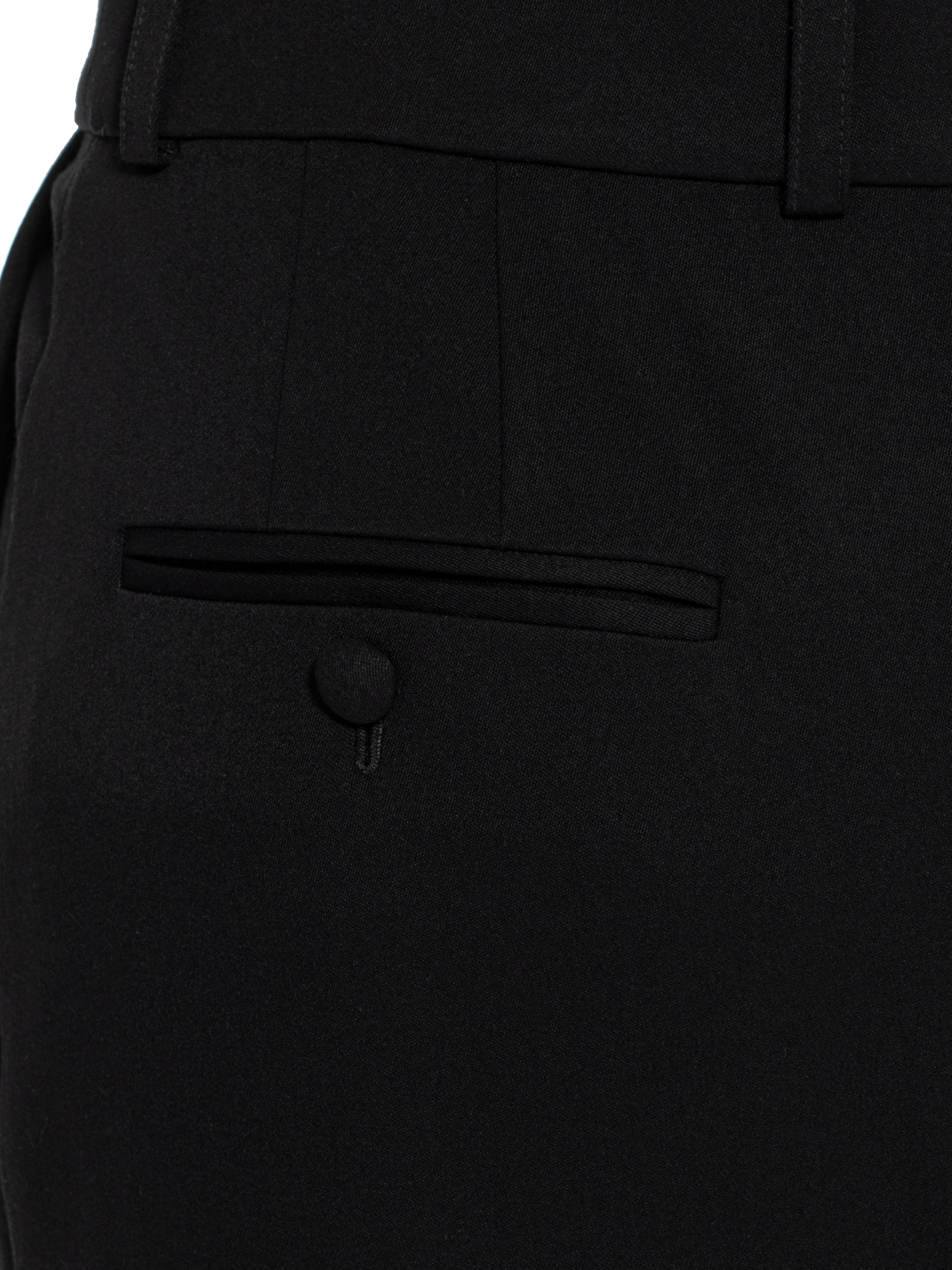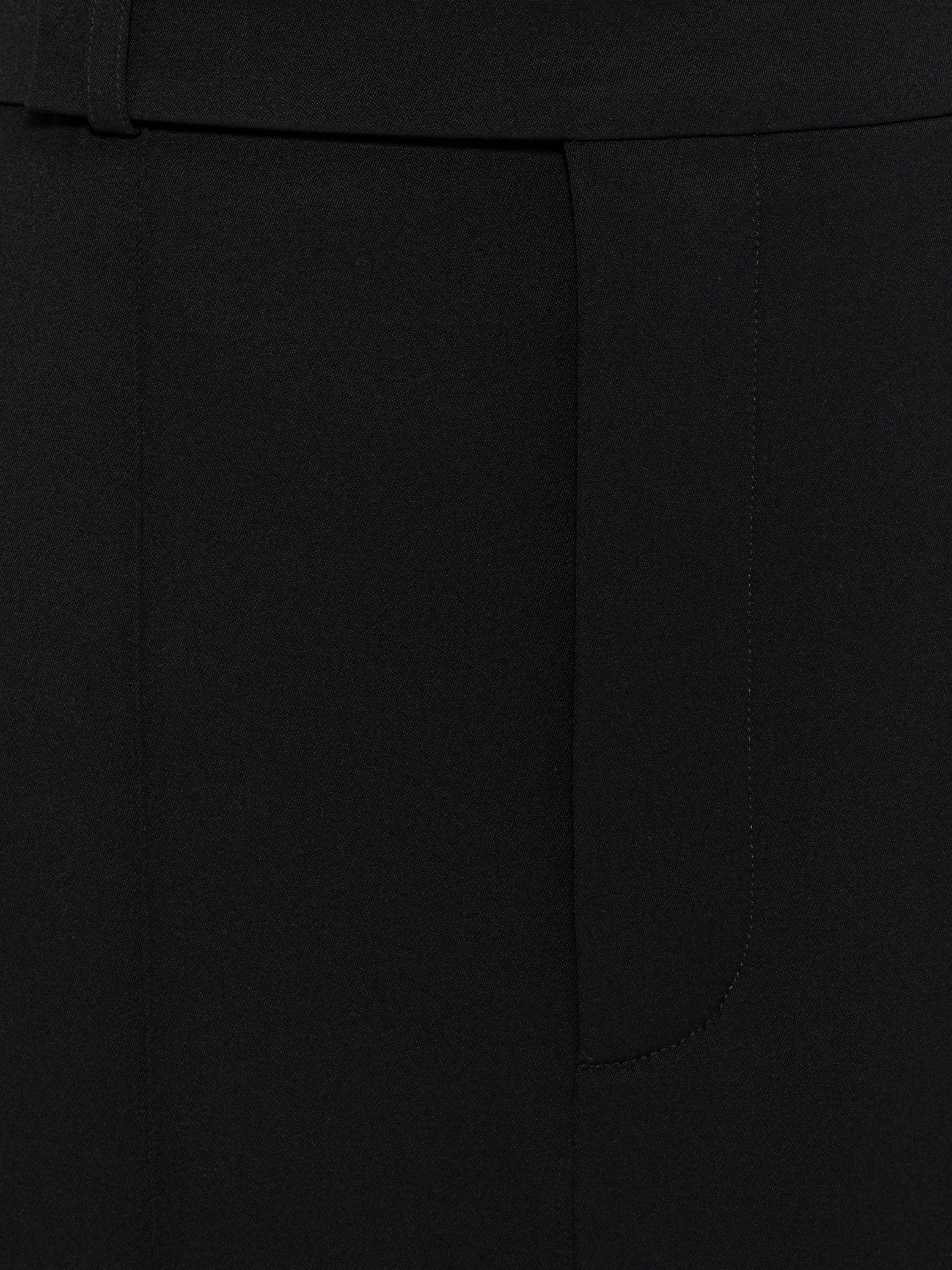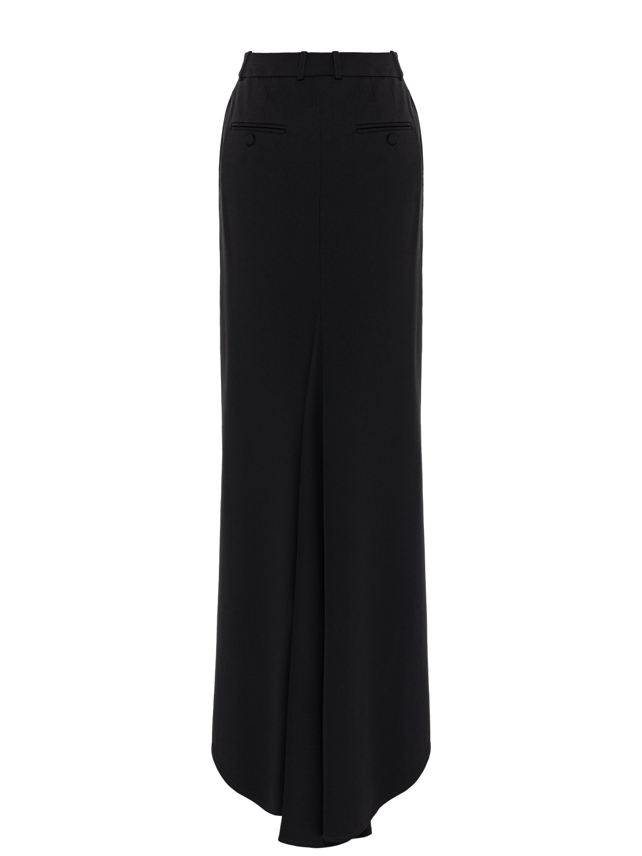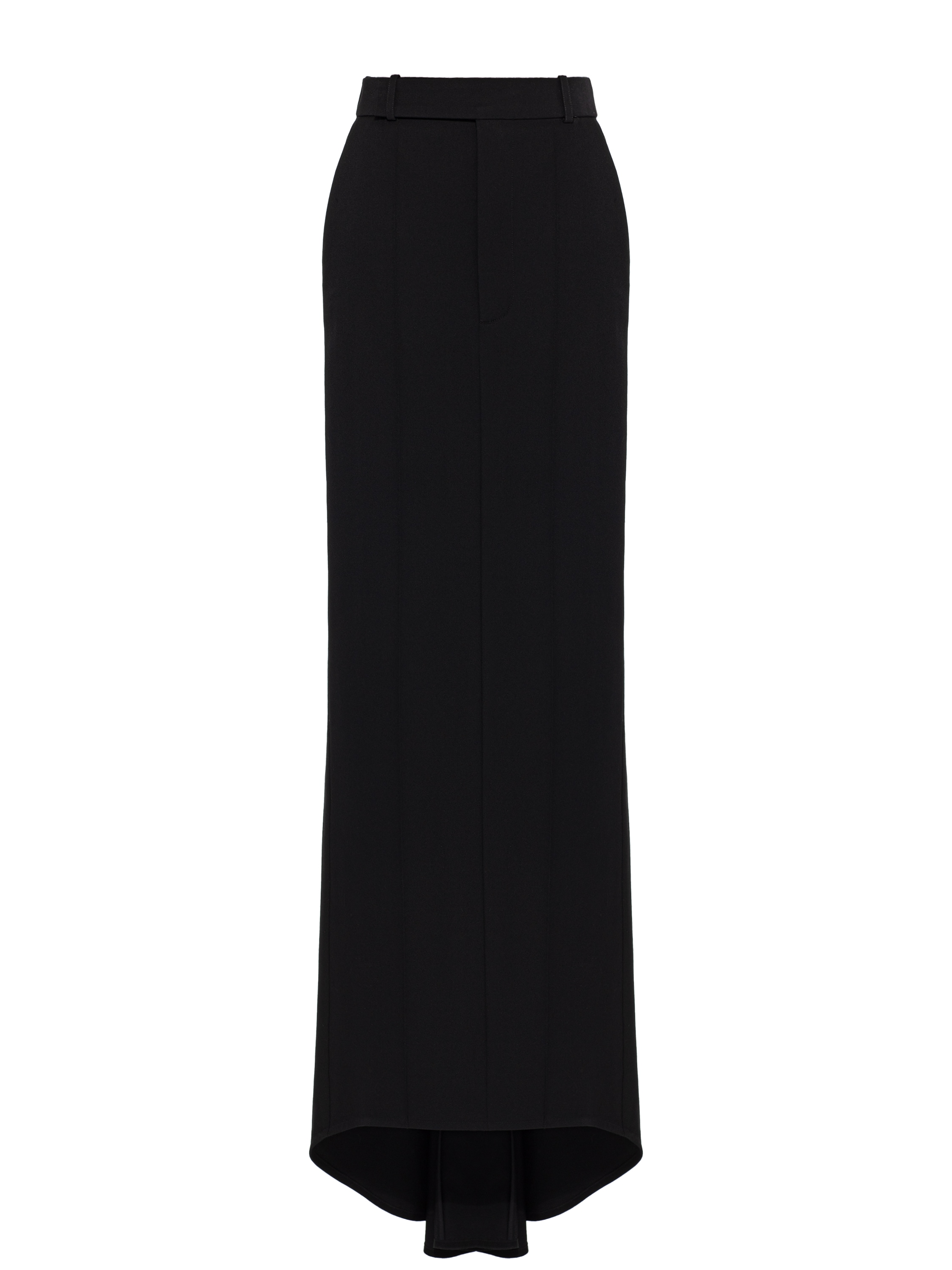 A solid black A‑line skirt with a long train is made of wool suiting fabric. The low‑waist model is complemented by pressed creases.