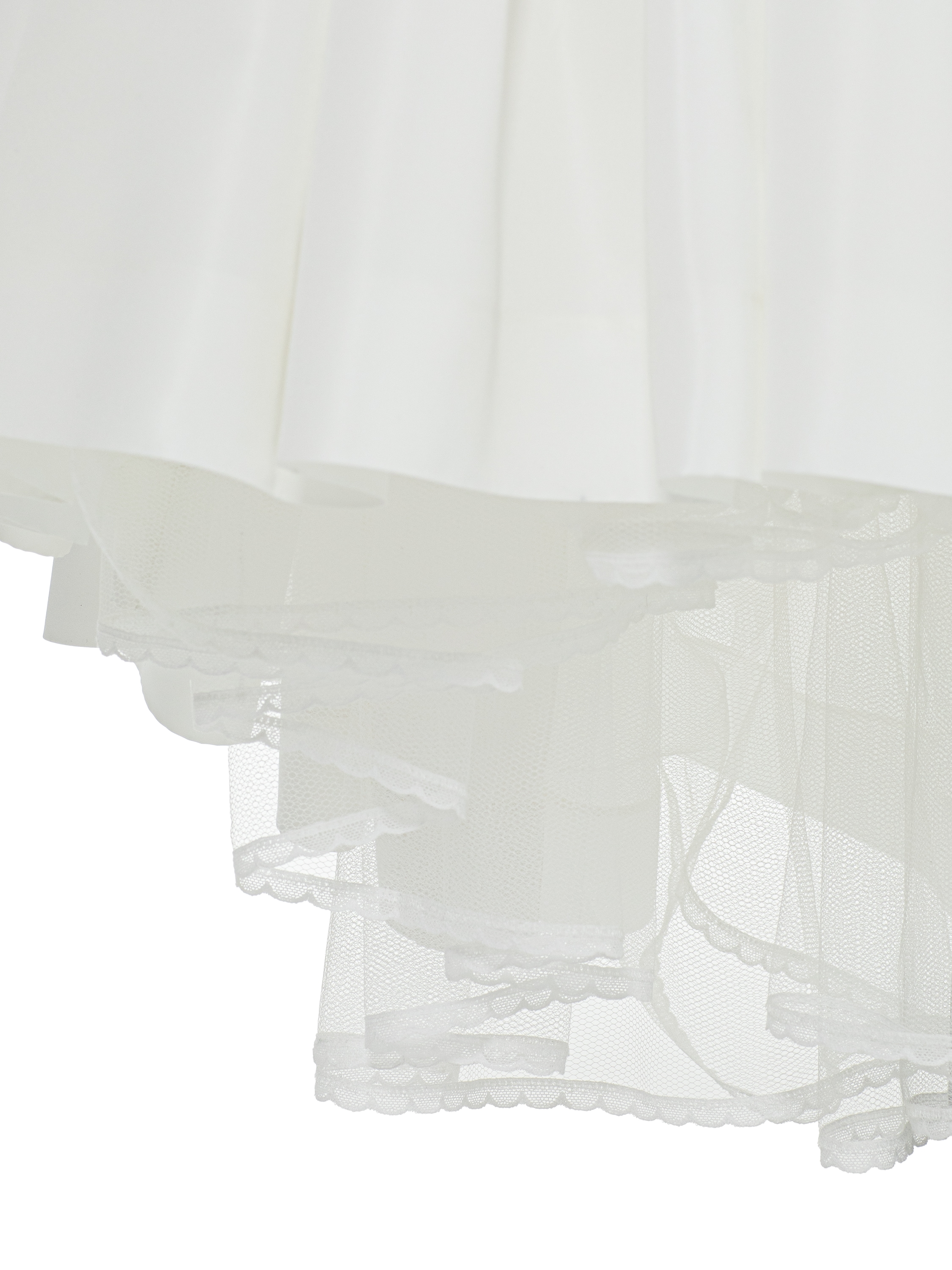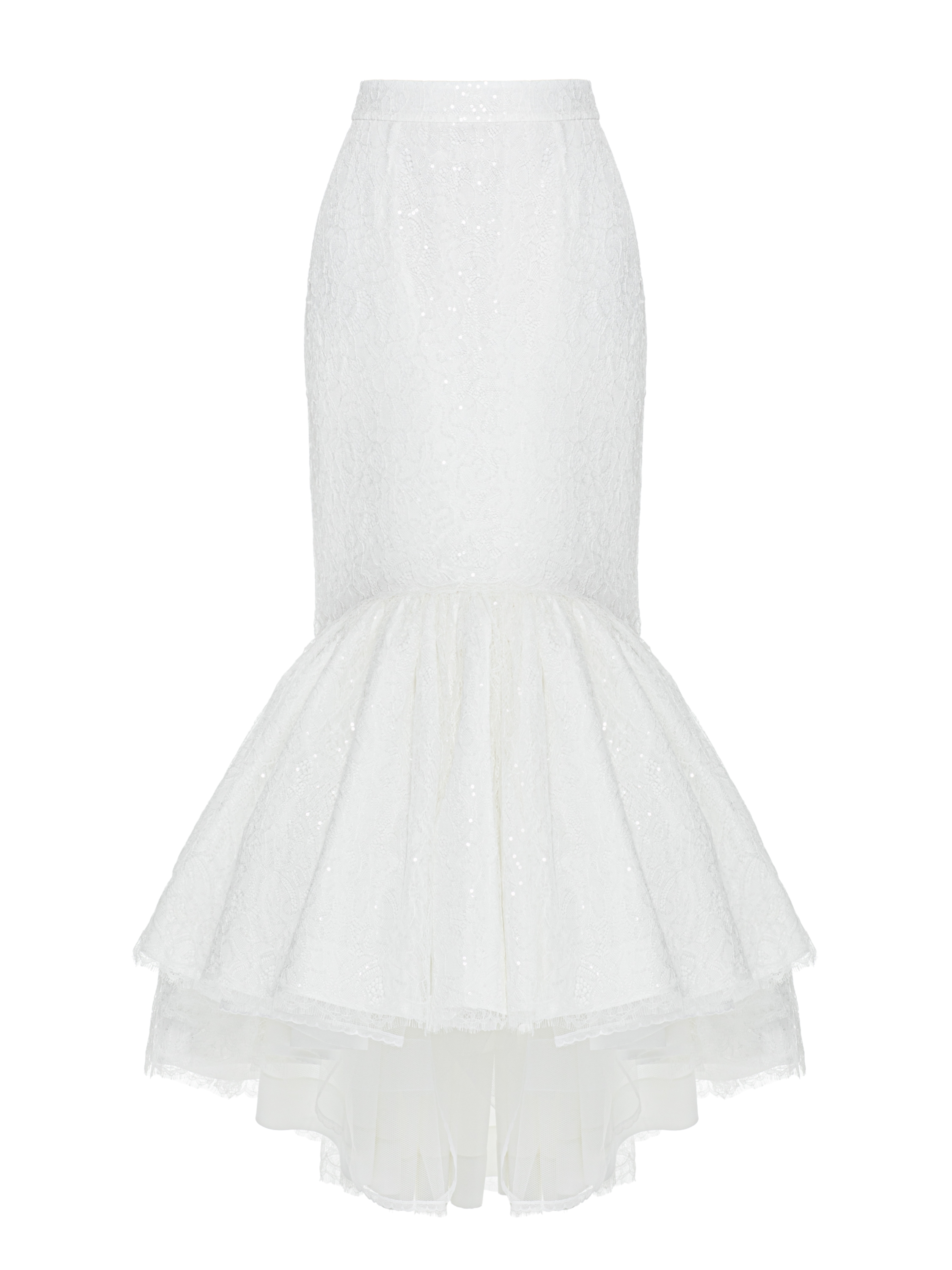The elegant floor‑length skirt in white taffeta creates a flawless mermaid silhouette that gracefully emphasizes the figure. The model is hand‑decorated with lace, adding special refinement to the look.