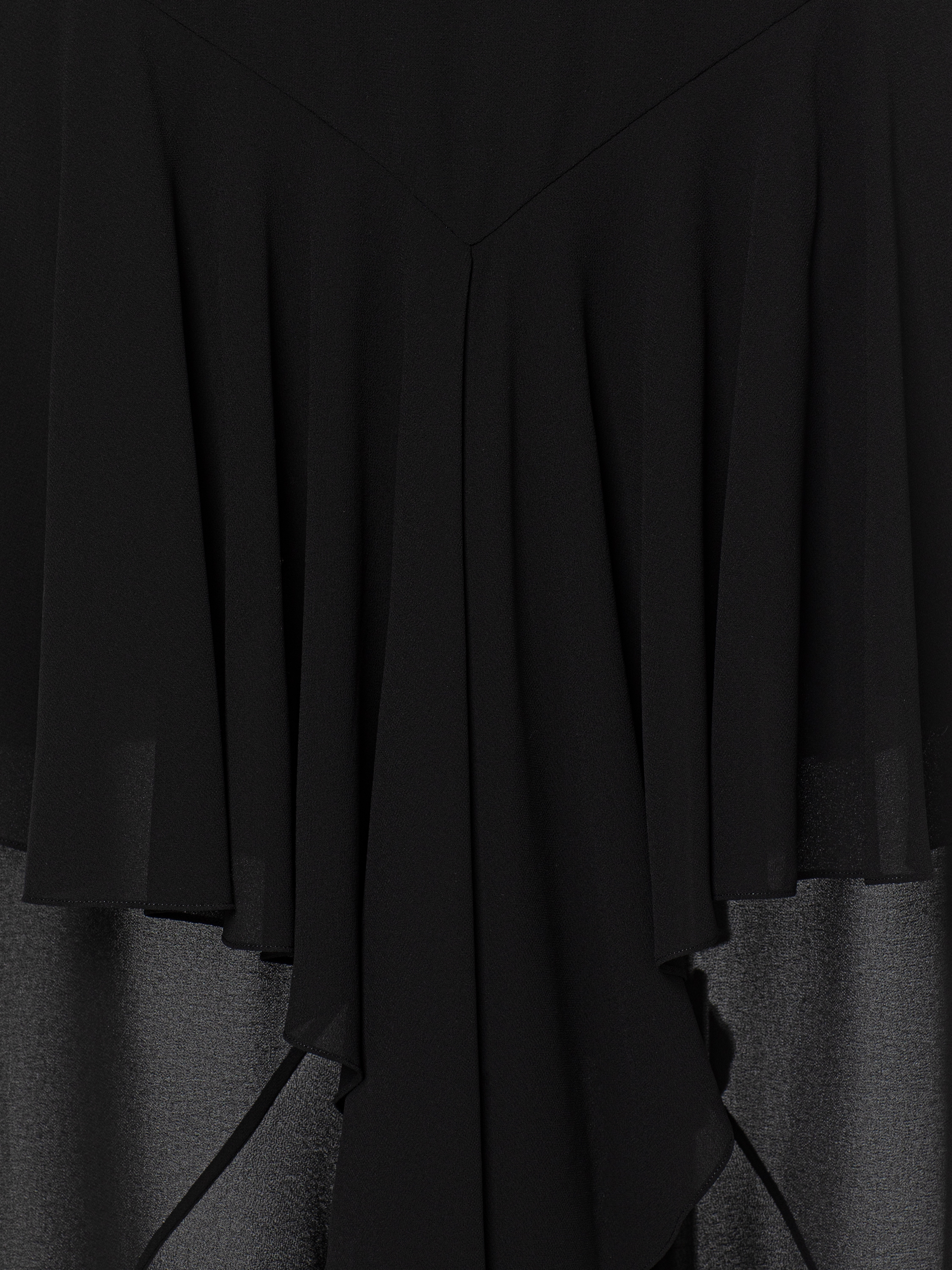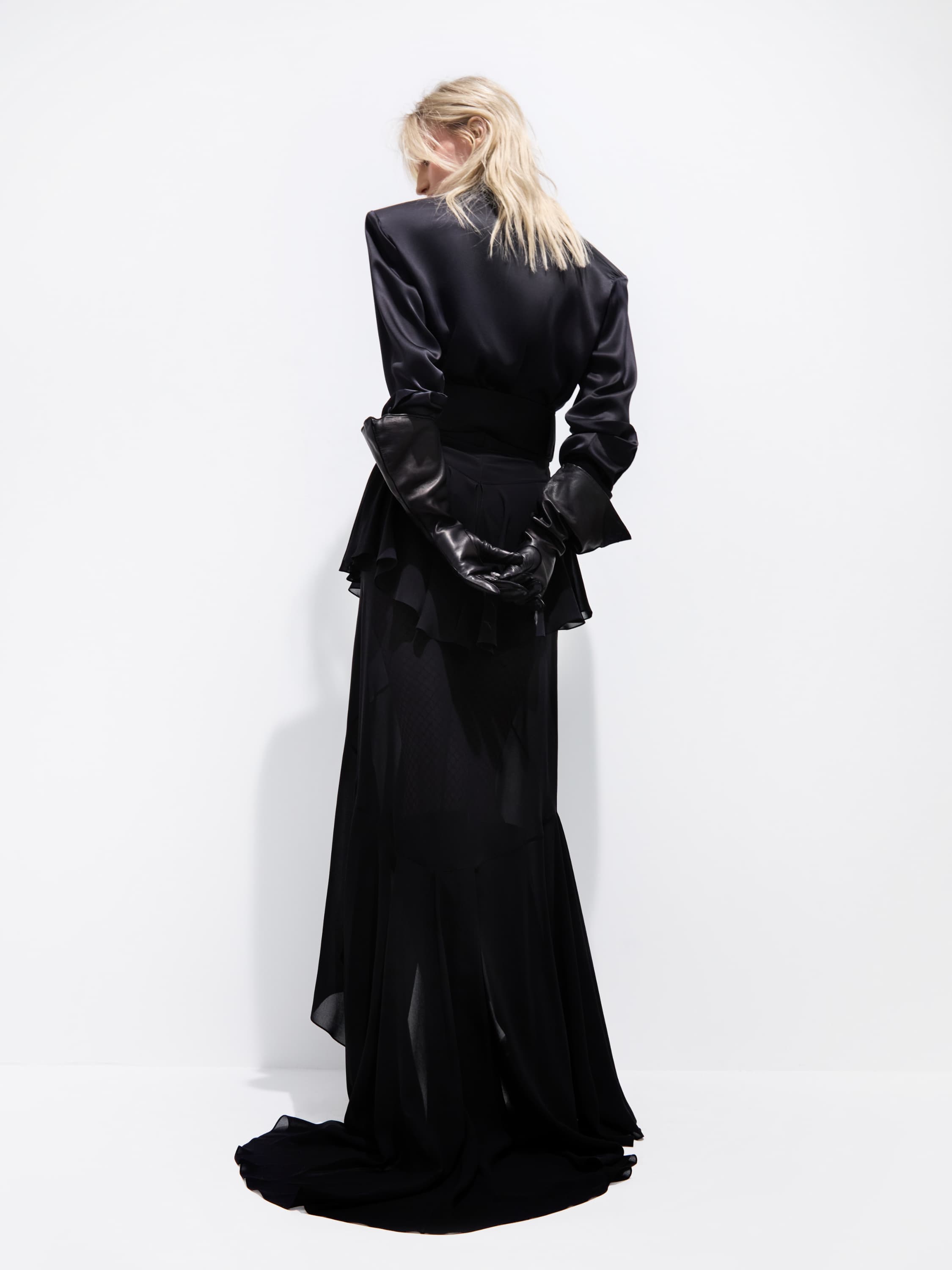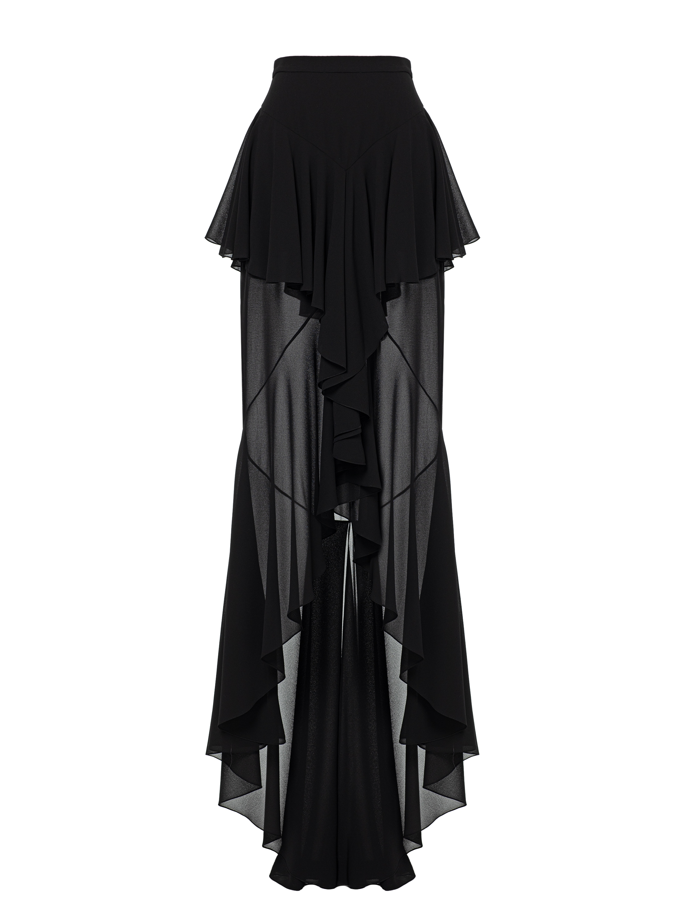 For this textured maxi skirt with flounces, lightweight black chiffon was used. The model gracefully accentuates the silhouette and makes the look dynamic and striking.