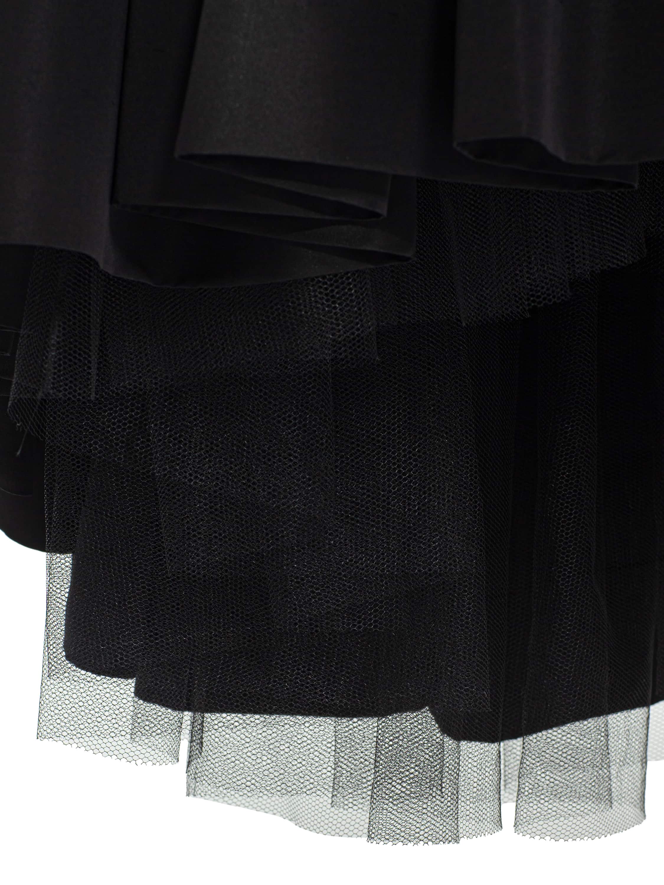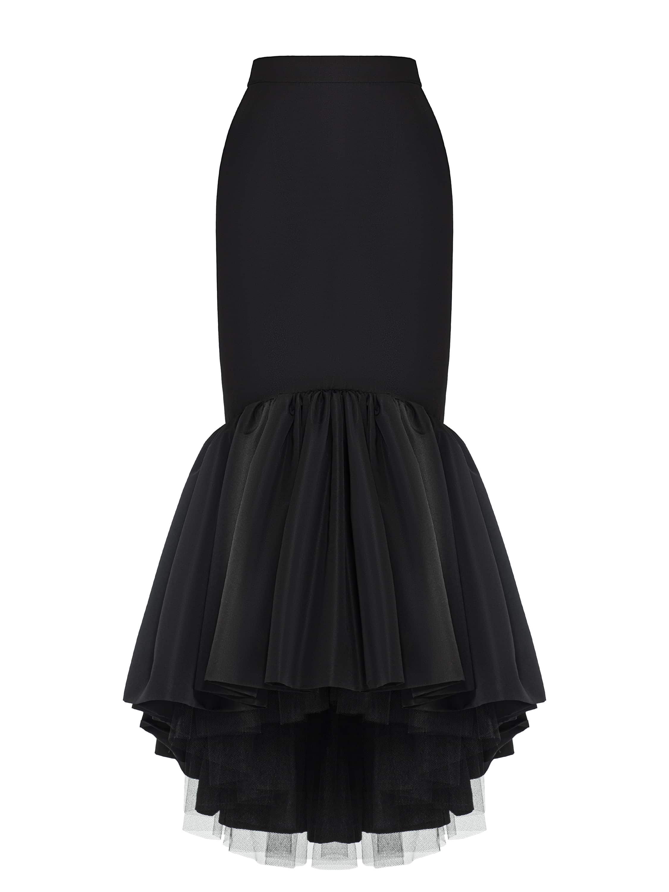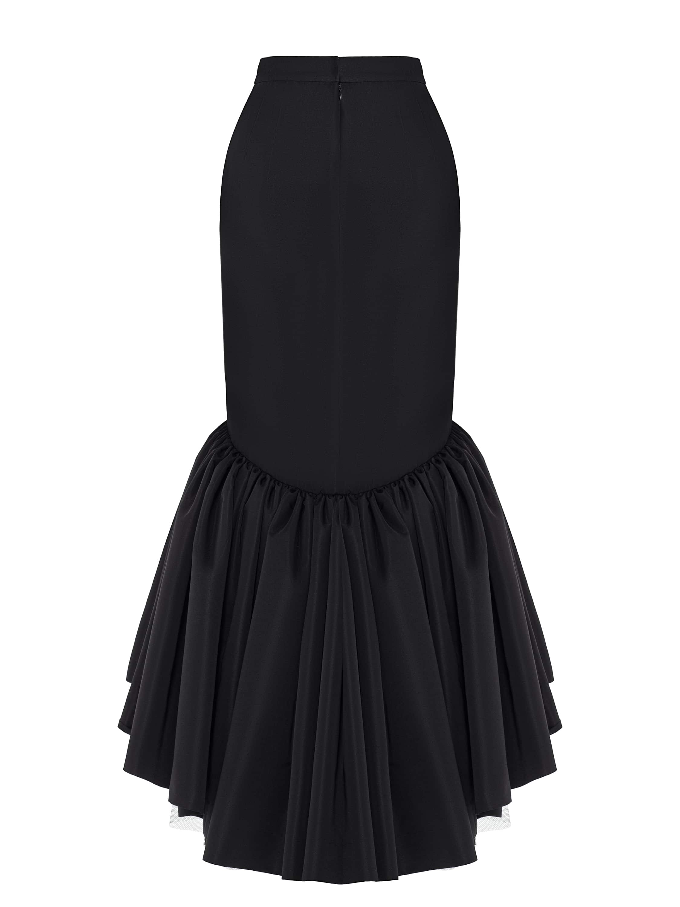 The elegant floor-length skirt in black taffeta creates a flawless mermaid silhouette that gracefully accentuates the figure. A voluminous flared ruffle adds a special refinement to the look.