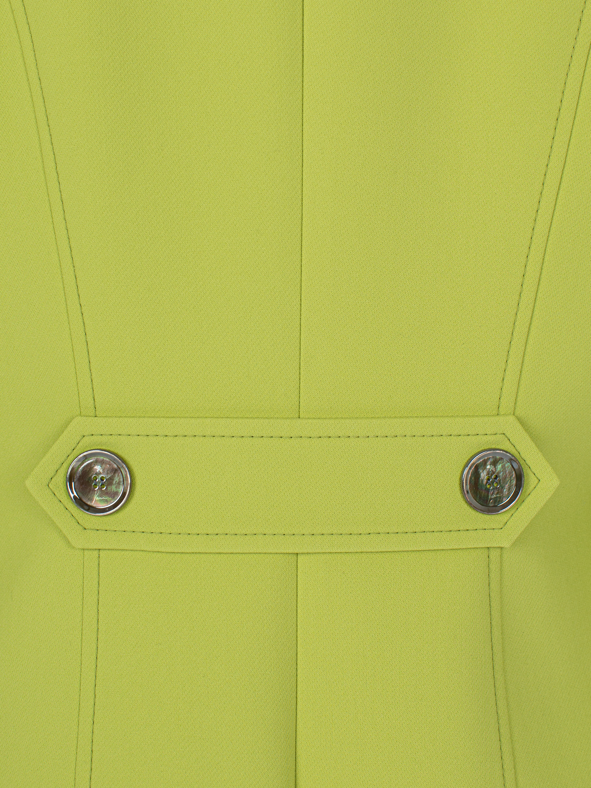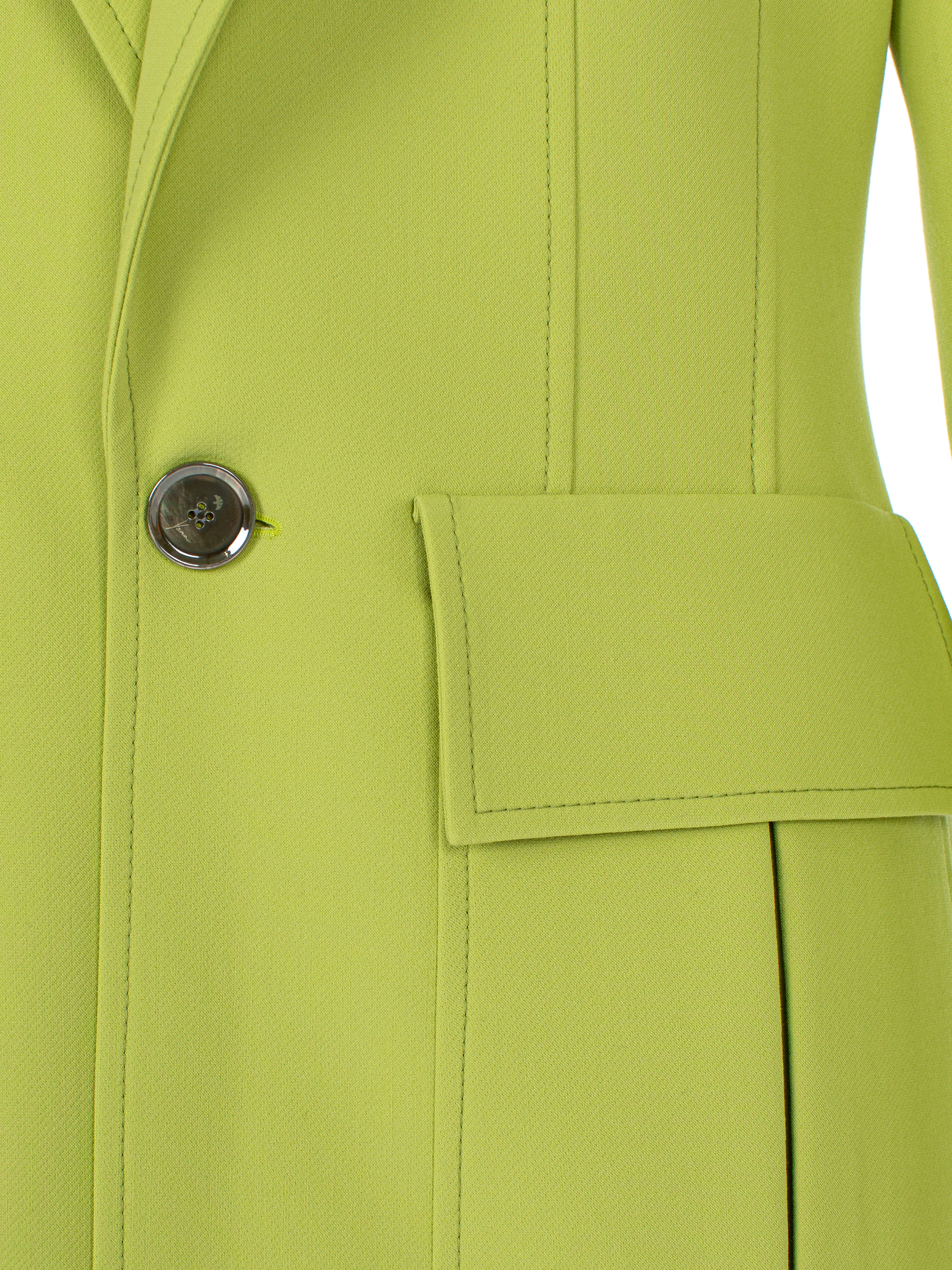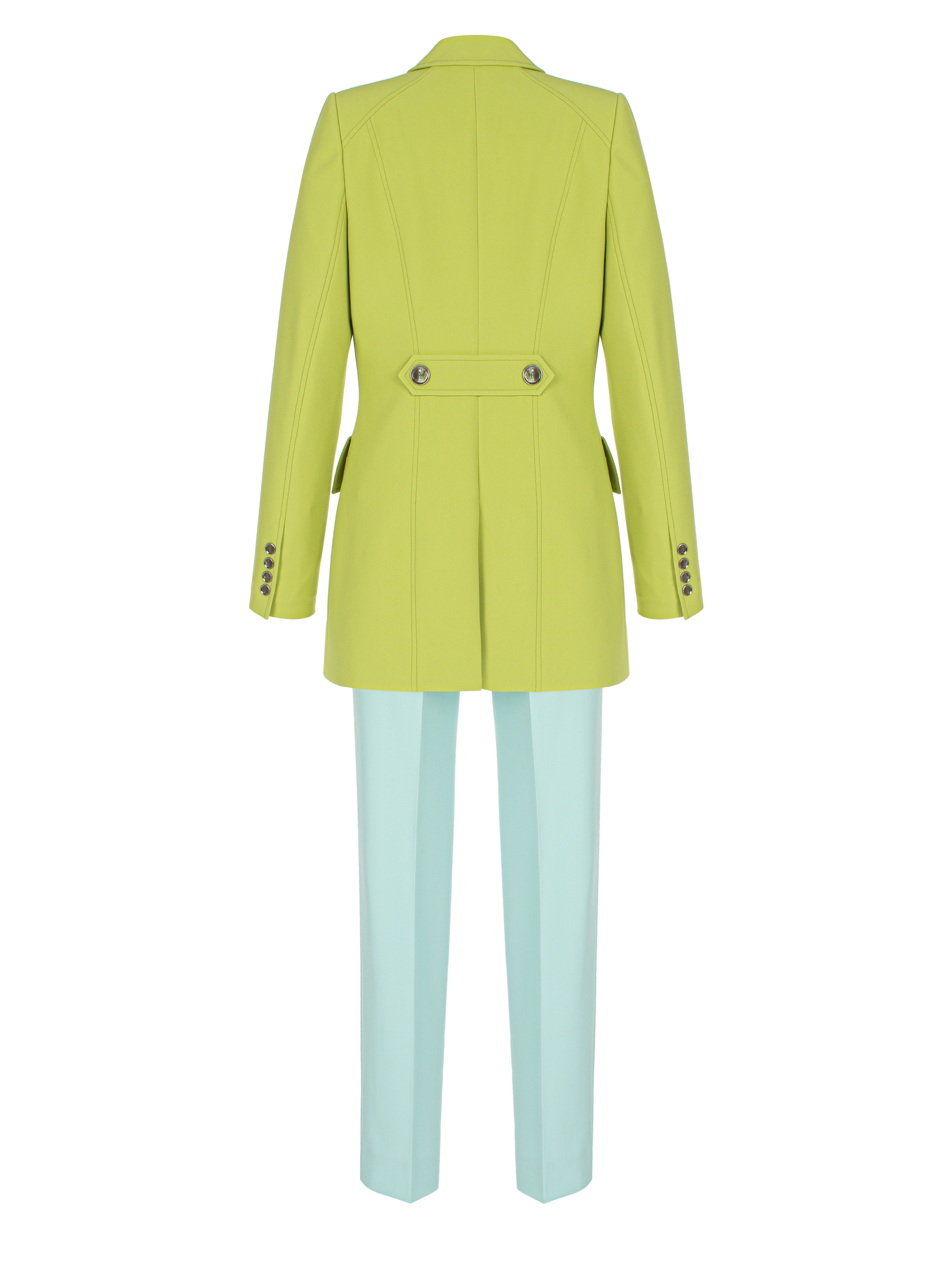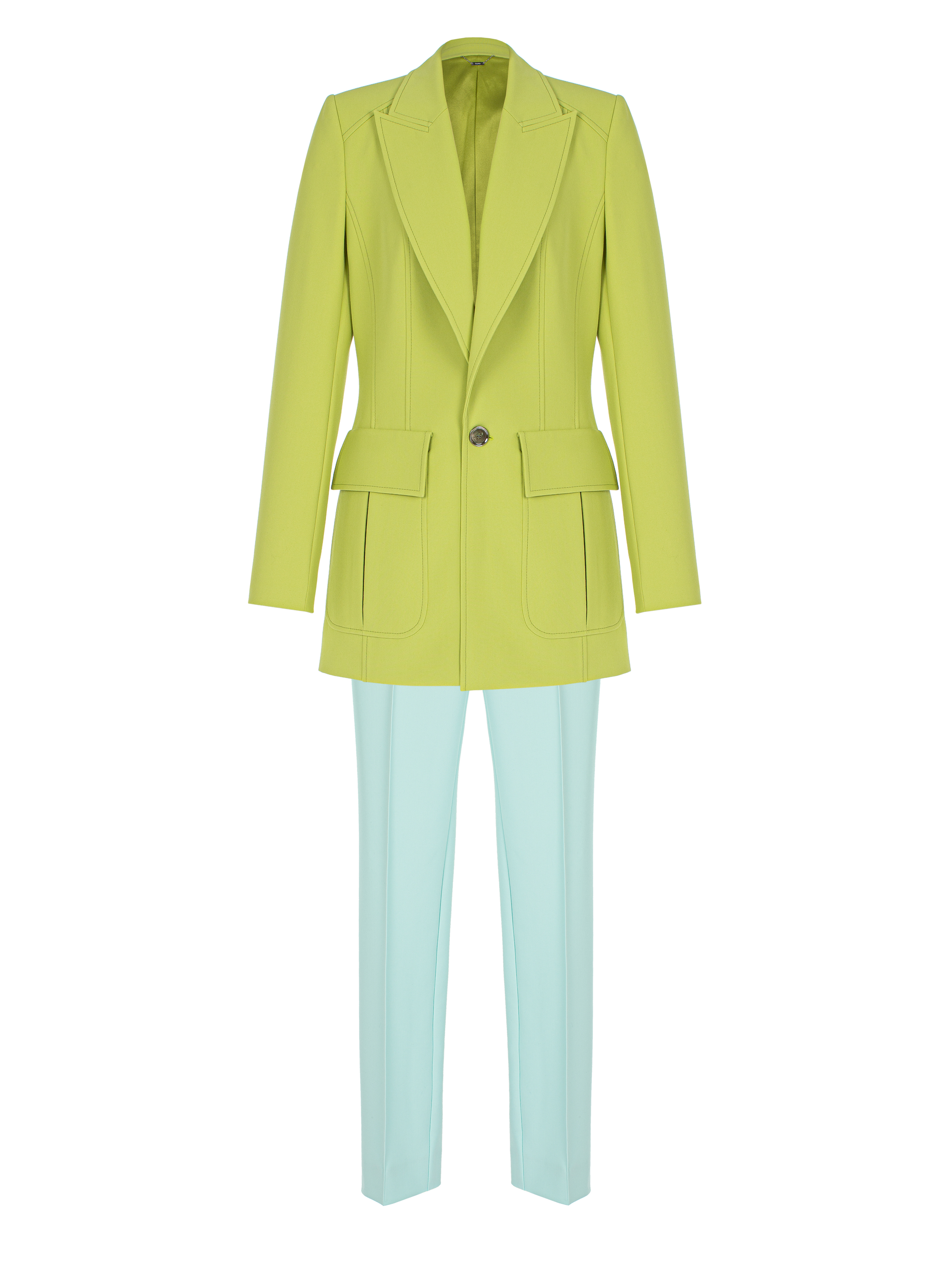 The two-piece suit consists of a bright green single-breasted fitted jacket and cropped blue high-waisted trousers. The jacket is complemented with sharp shaped lapels and two large patch pockets with flaps.