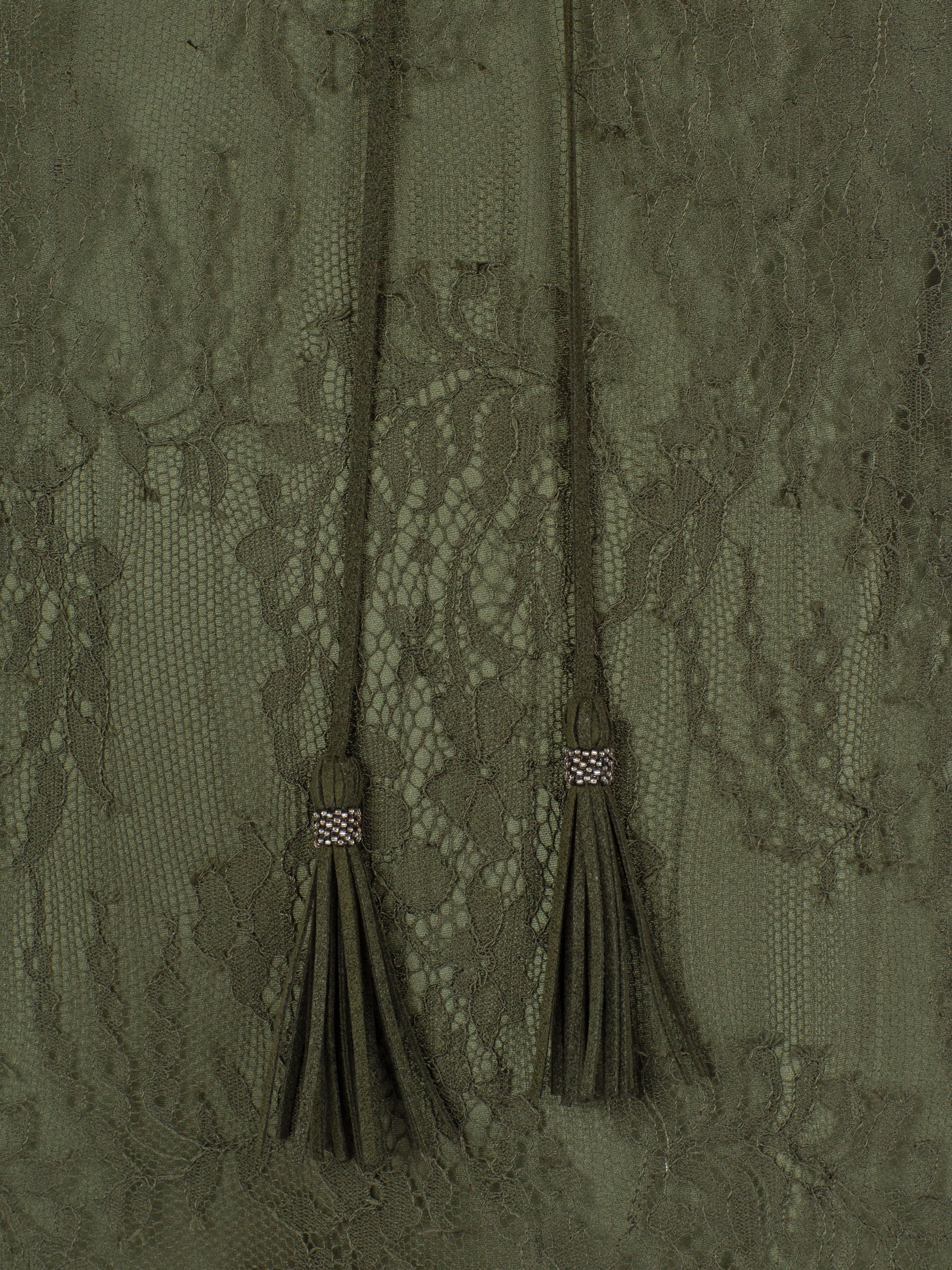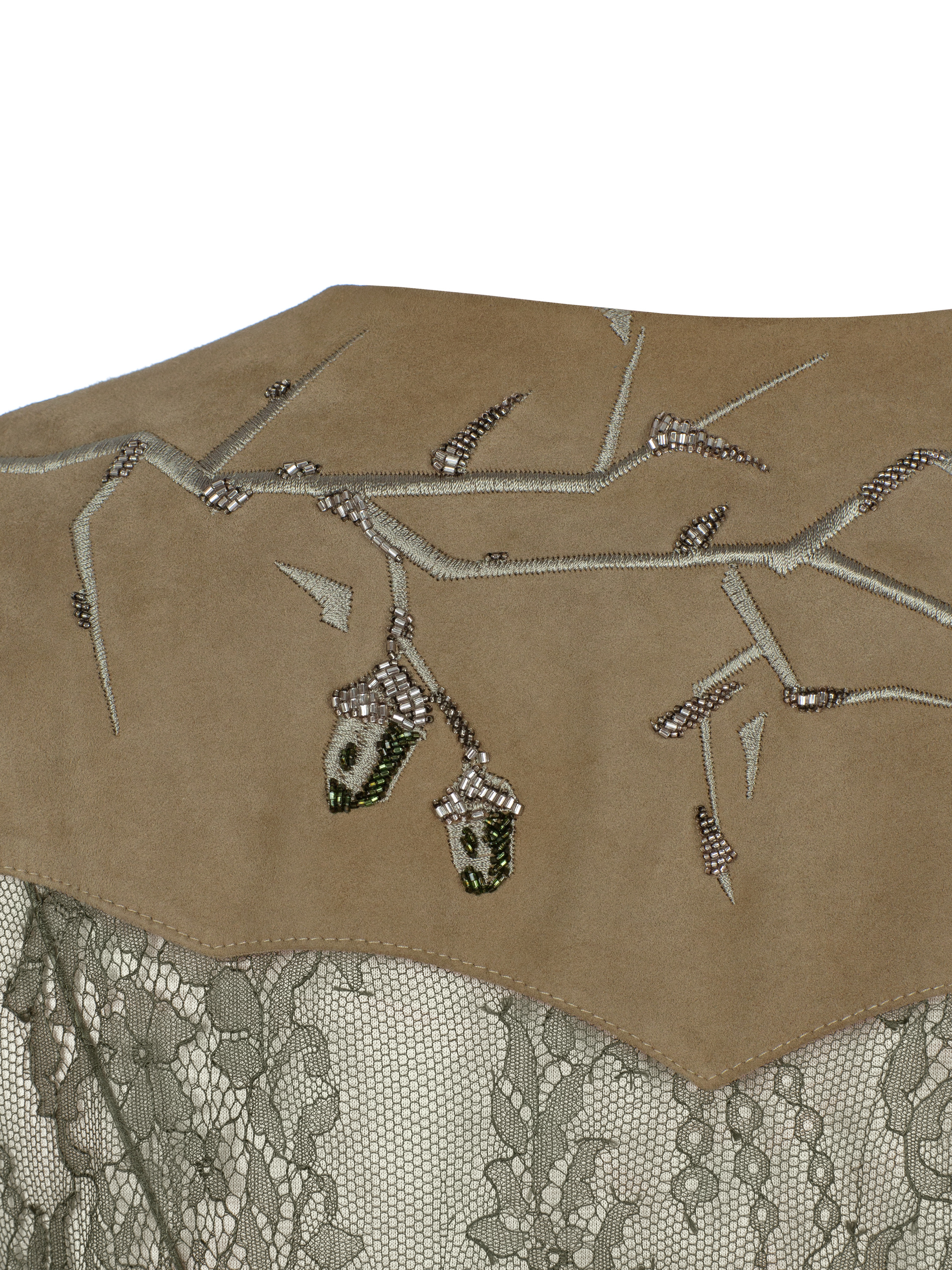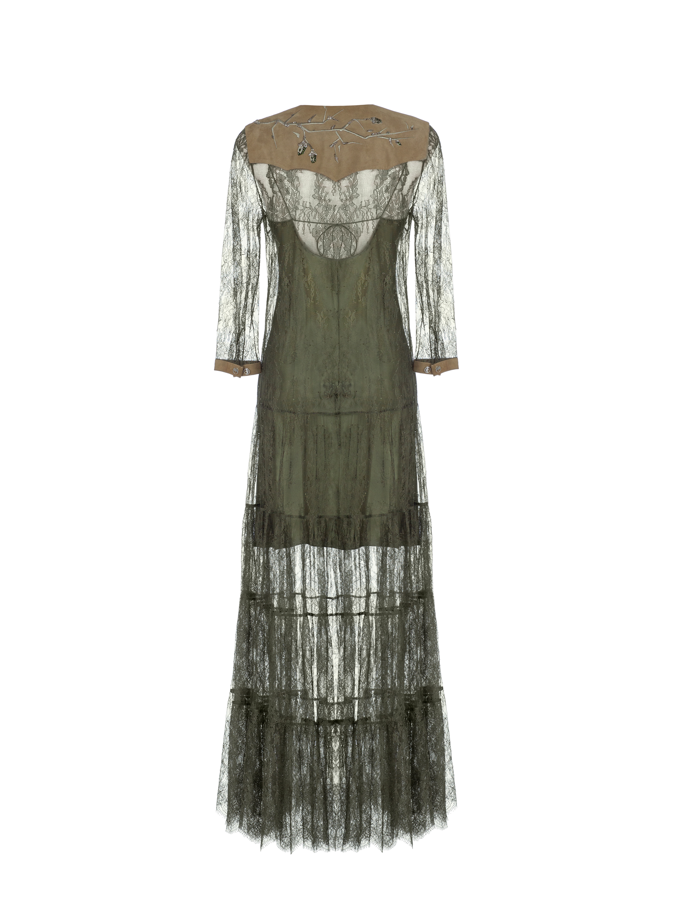 The green midi dress with 3/4 sleeves is made of semi-sheer lace. The model is complemented by brown genuine suede inserts on the shoulders and sleeves, bead embroidery, and tasseled ties at the chest. The dress comes with a matching silk slip.