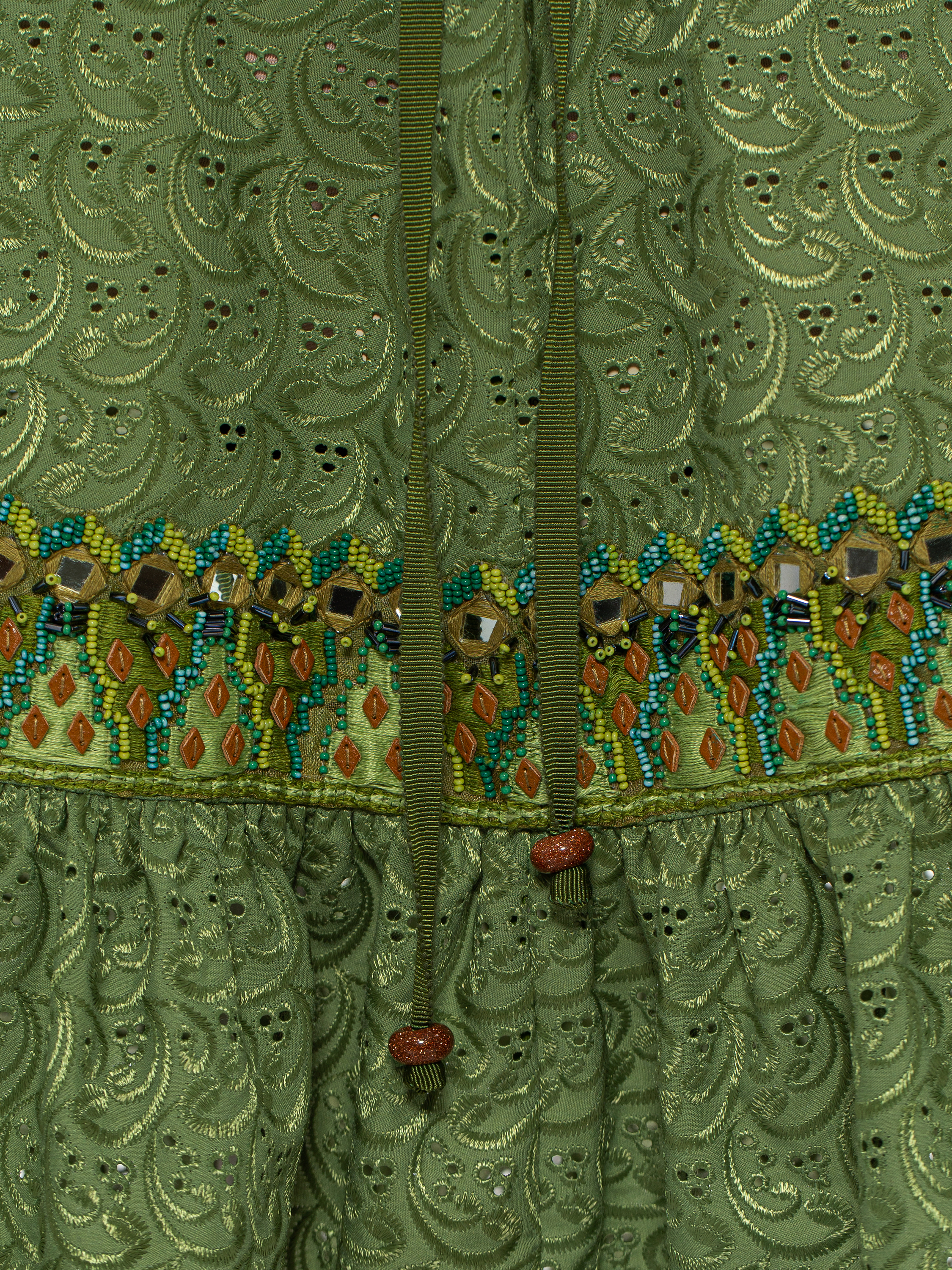 The green mini dress with an open back is made of broderie anglaise cotton and decorated with stone and bead embroidery. The model is complemented by ties at the back and a flounce along the hem.