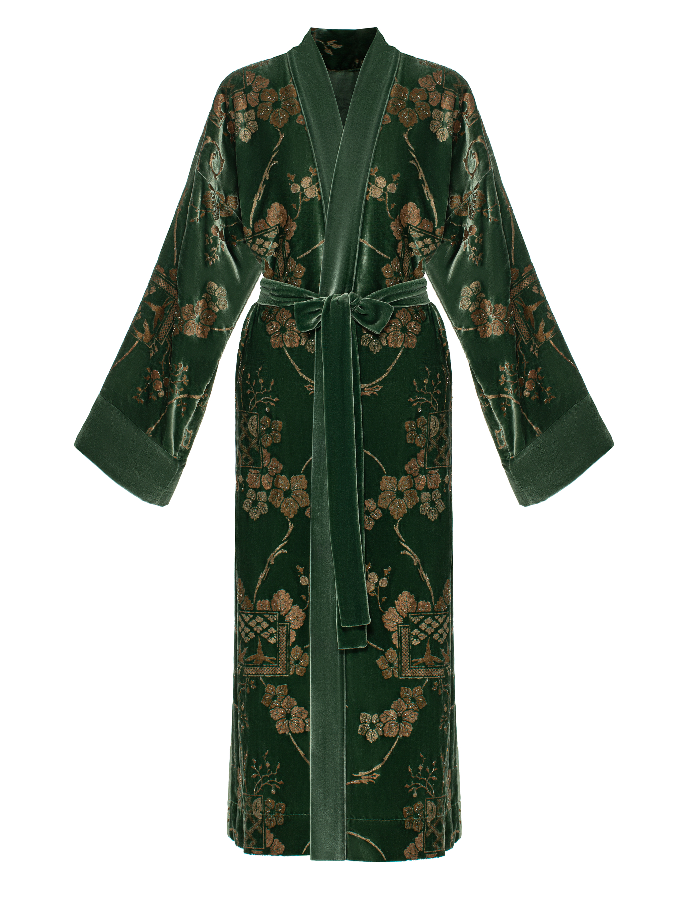 Green midi-length robe with wide long sleeves and a belt, made of soft velvet and embellished with a golden floral pattern and shimmering bead embroidery.
