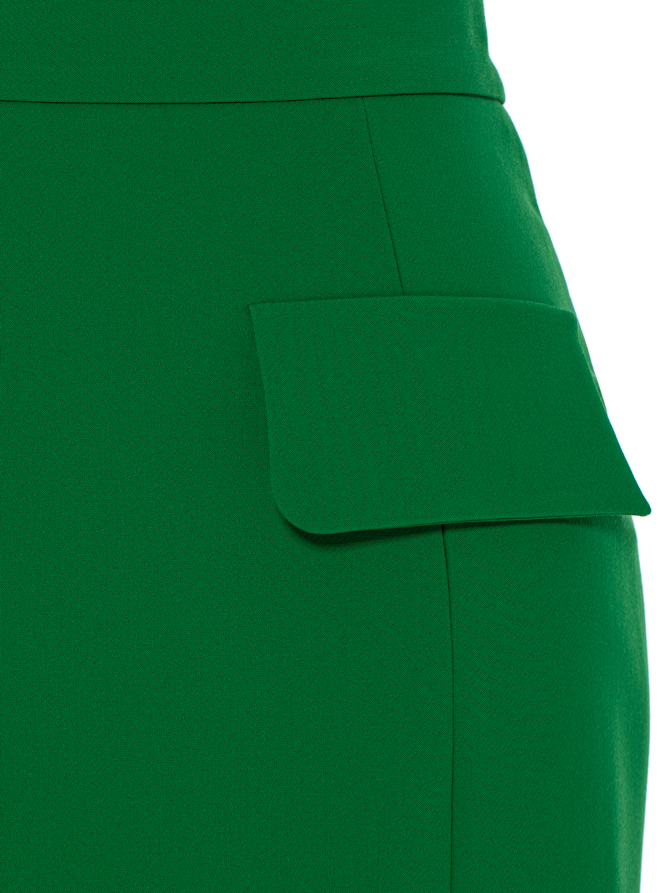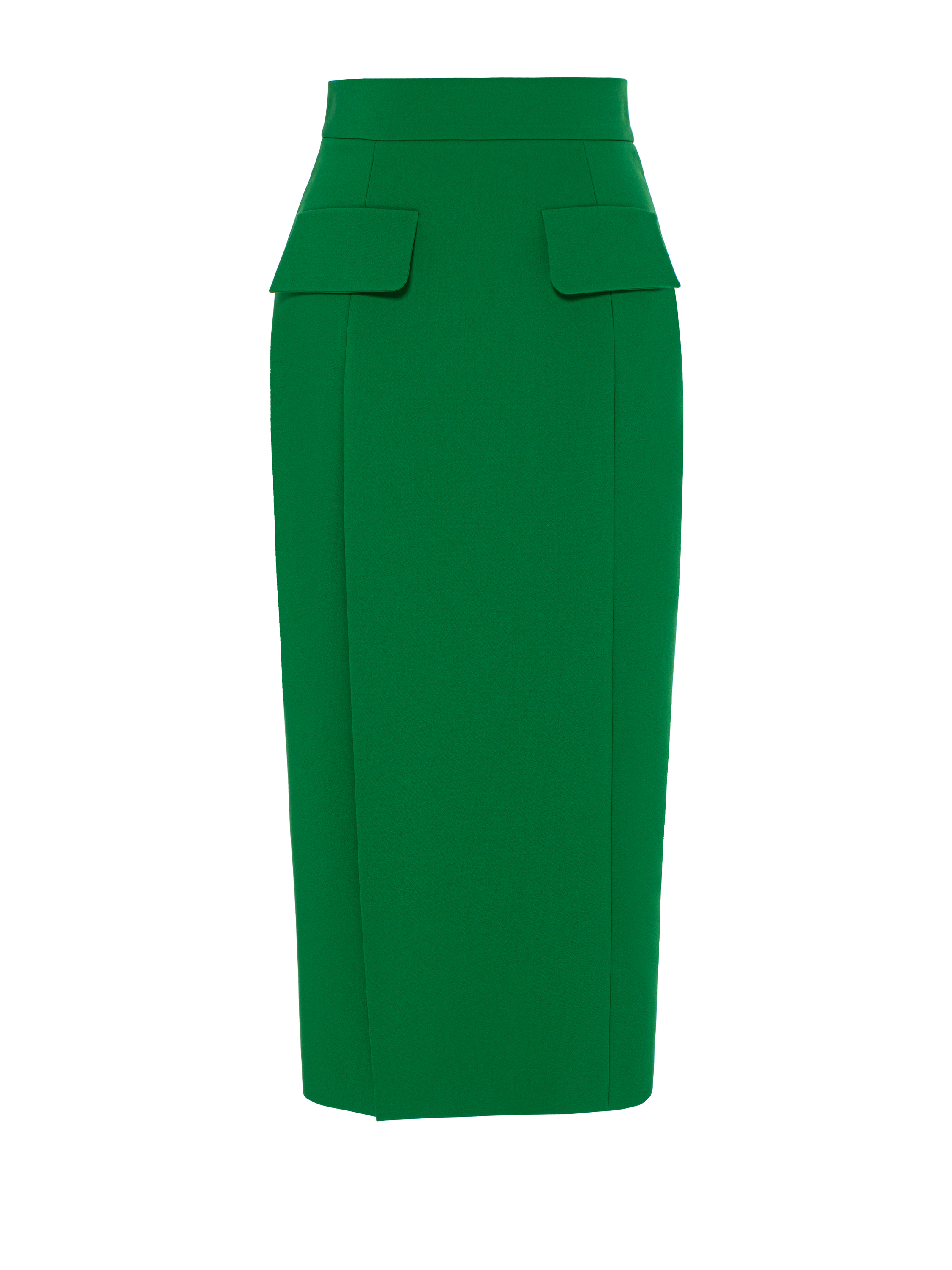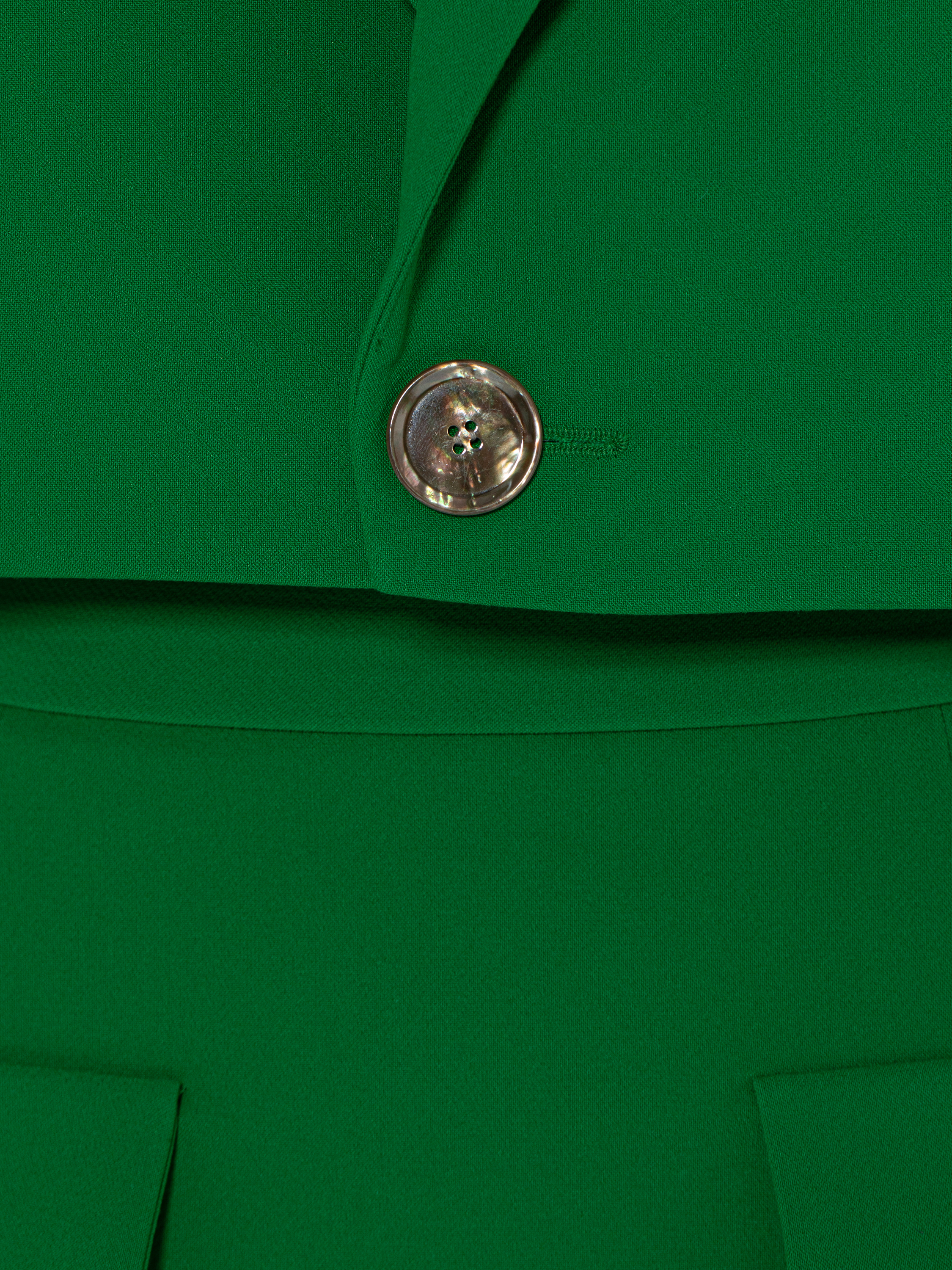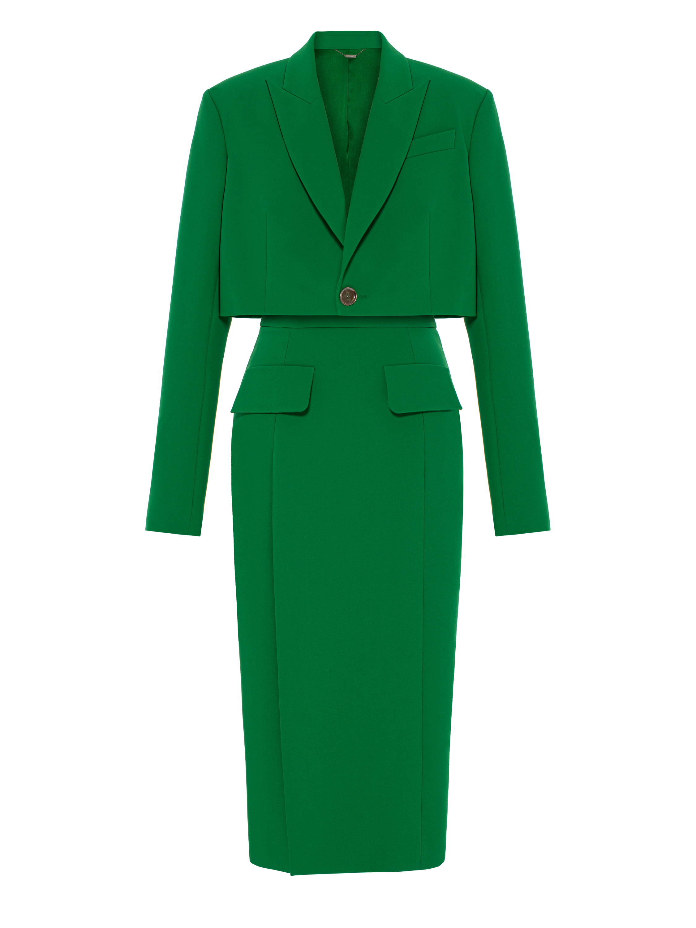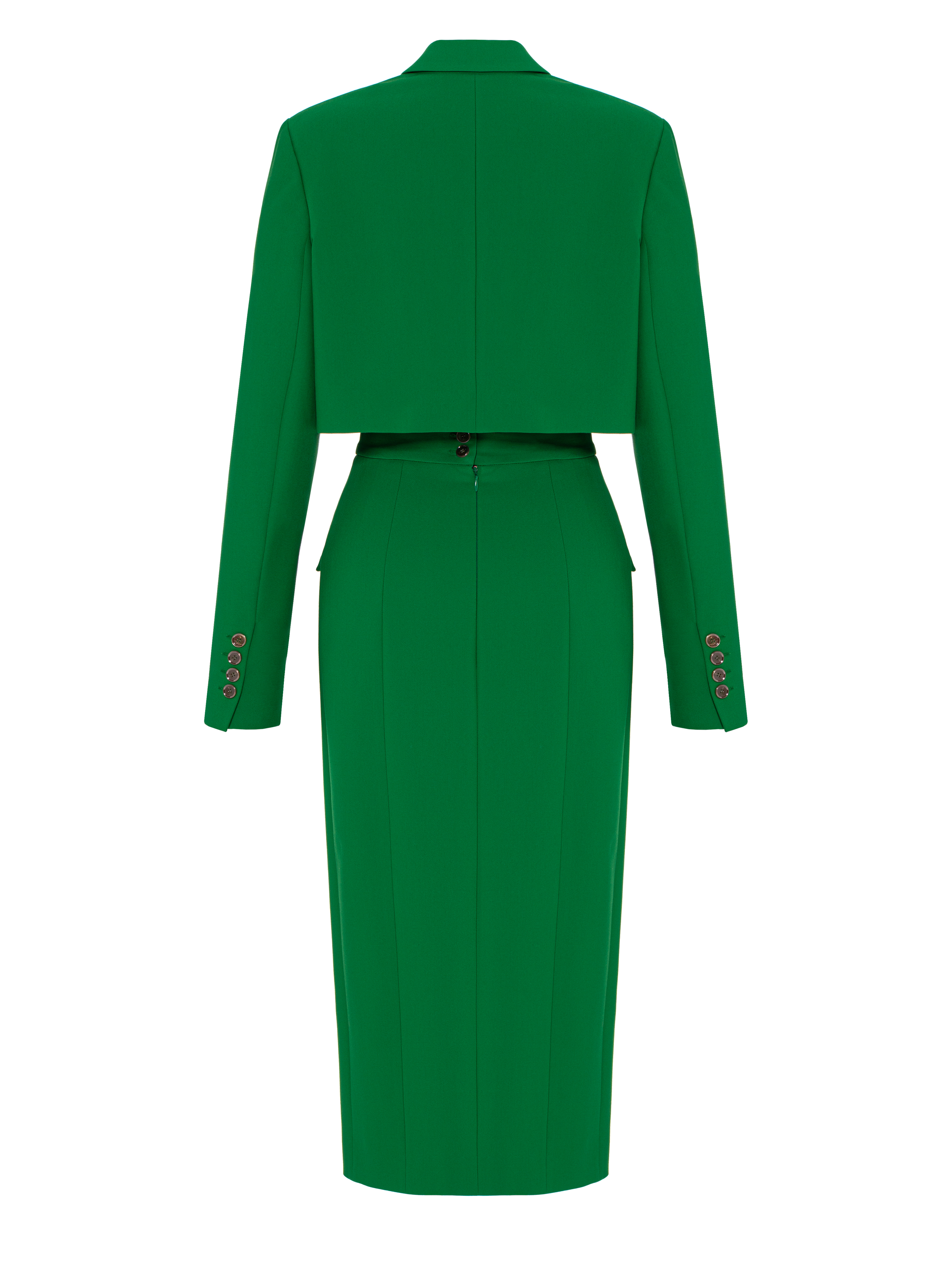 The bright green wool two-piece suit consists of a cropped single-breasted jacket and a midi skirt with a high front slit. The jacket is complemented by a turn-down collar with shaped lapels, a welt chest pocket, a tone-on-tone natural silk lining and mother-of-pearl buttons with the brand logo on the front and cuffs. Two welt flap pockets on the skirt and a button-and-zip fastening at the back.