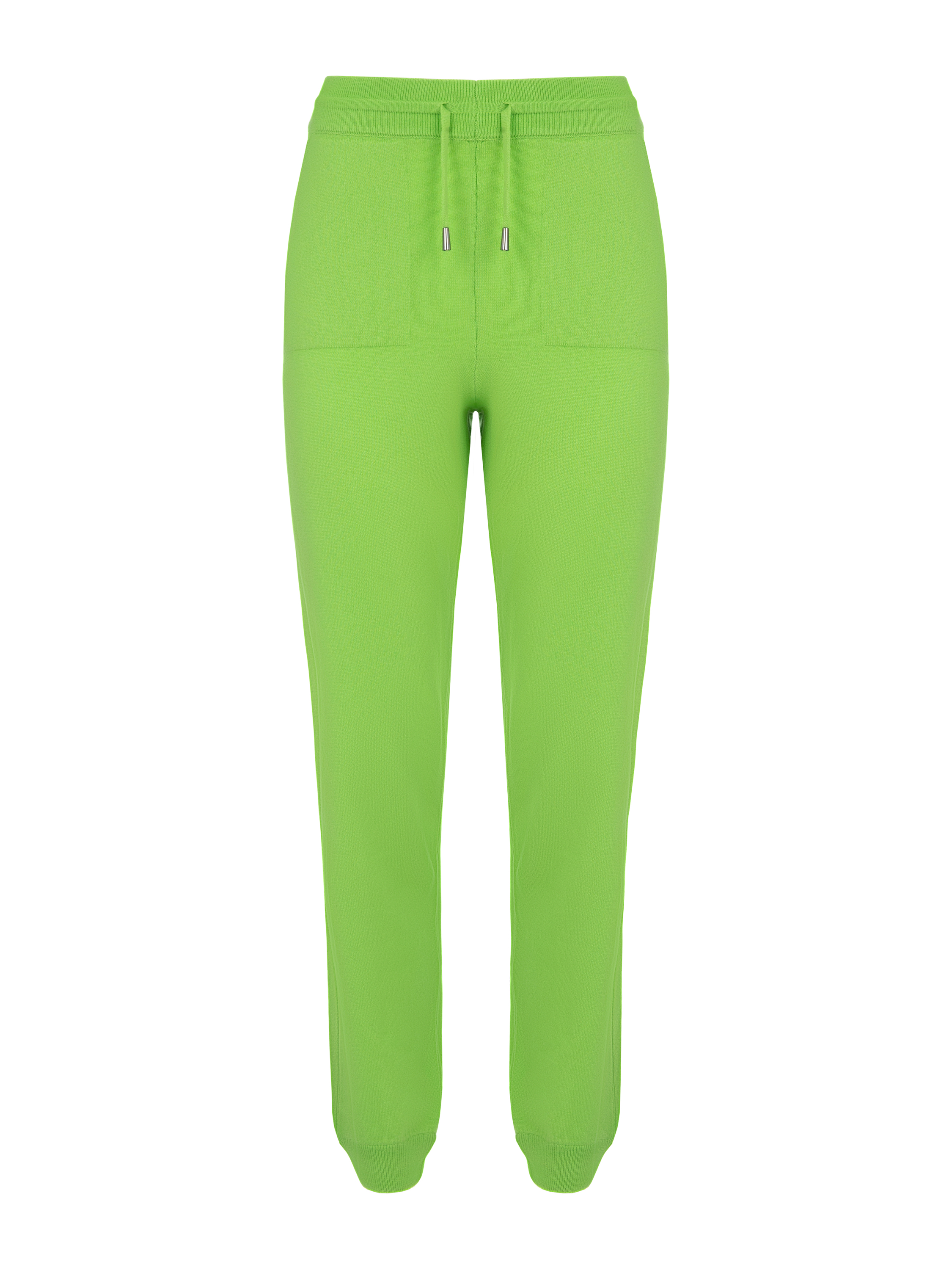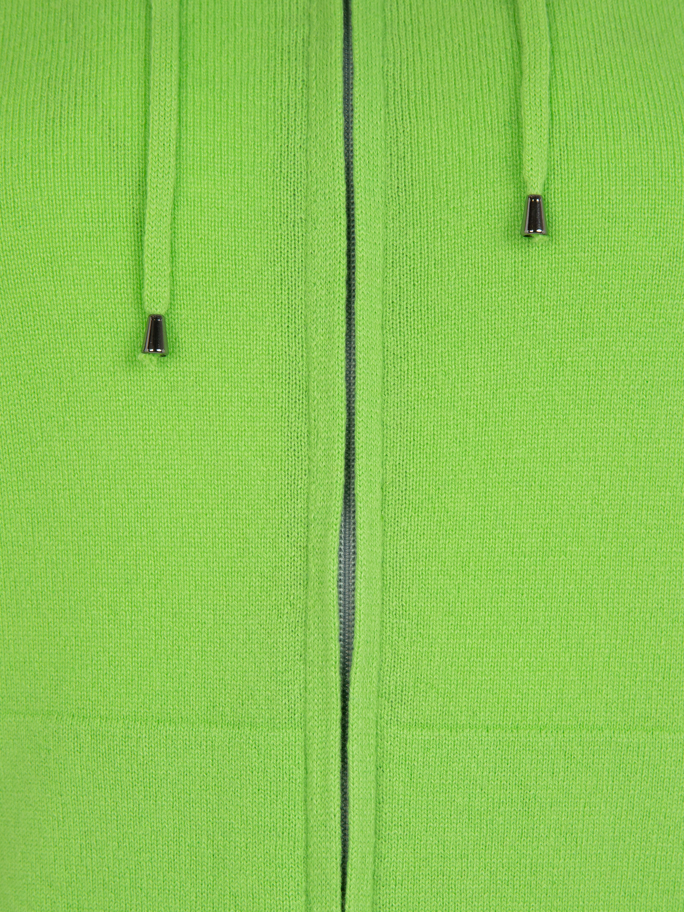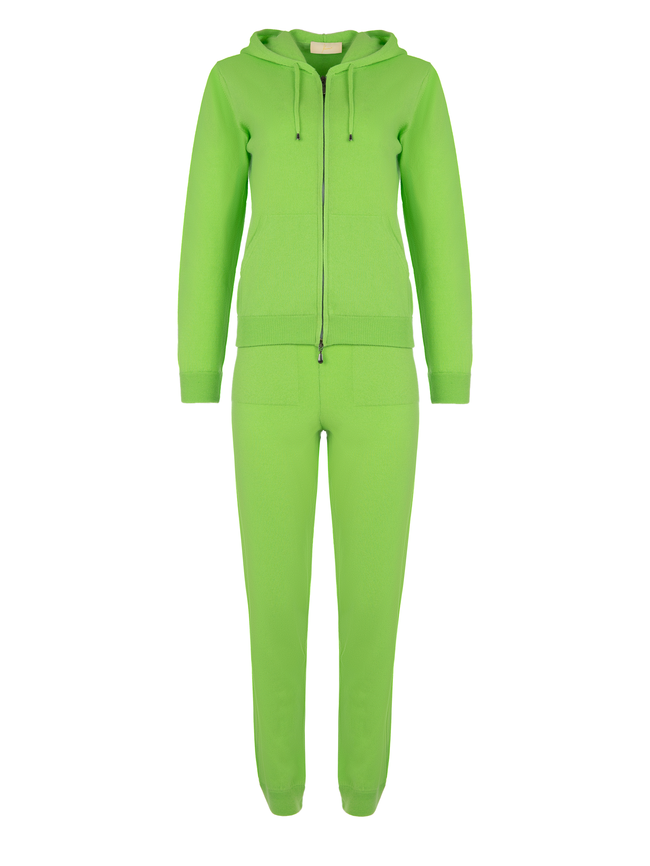 The green cashmere suit consists of a zip-up hoodie with a hood and cuffed trousers. The trousers are complemented with a wide elastic waistband with drawstrings and two slant pockets at the front.