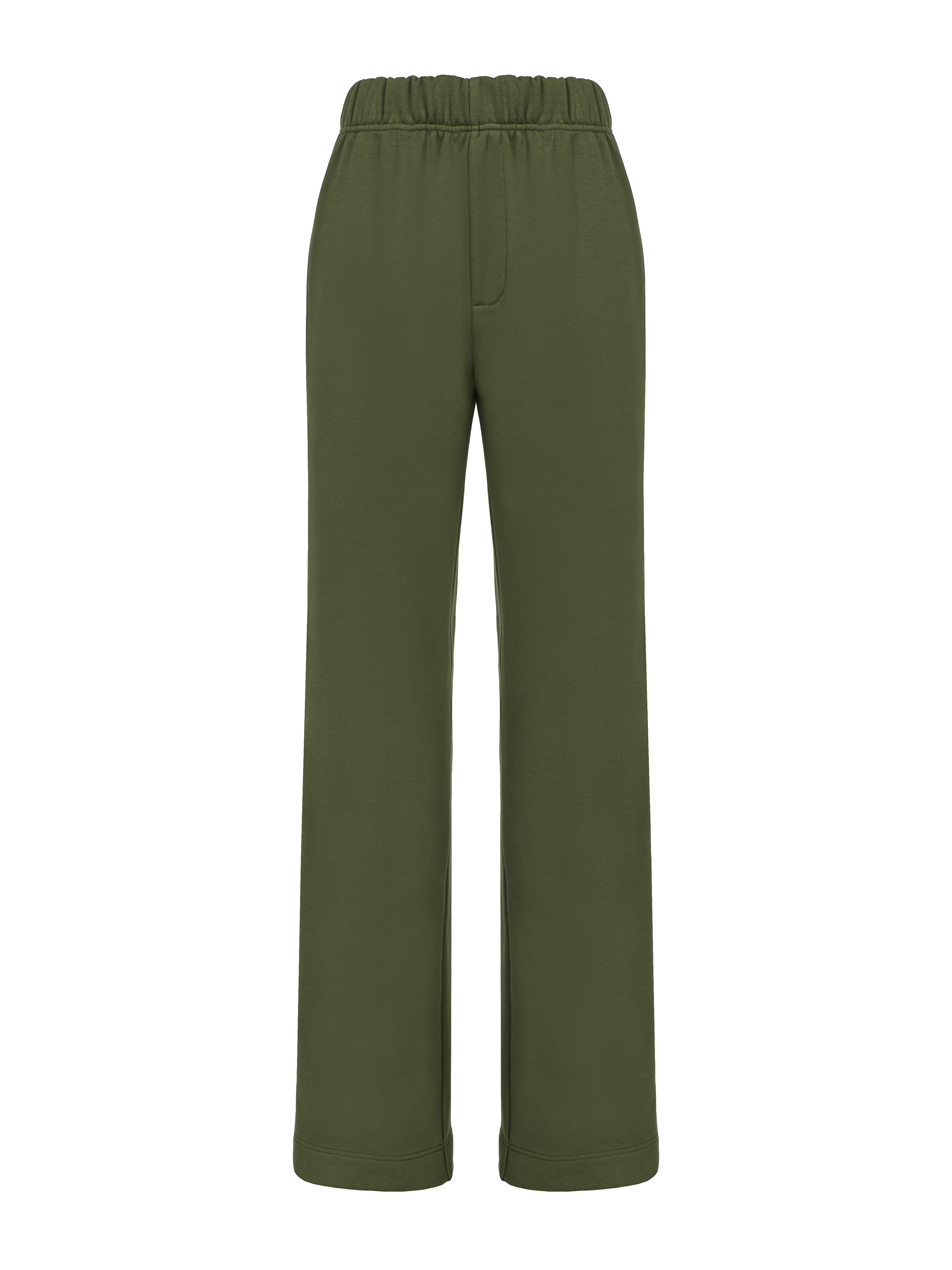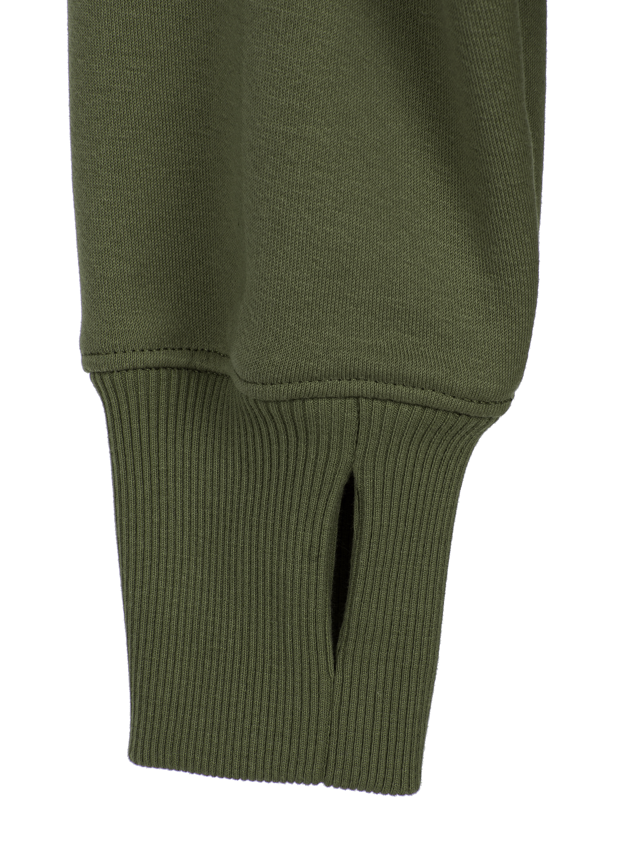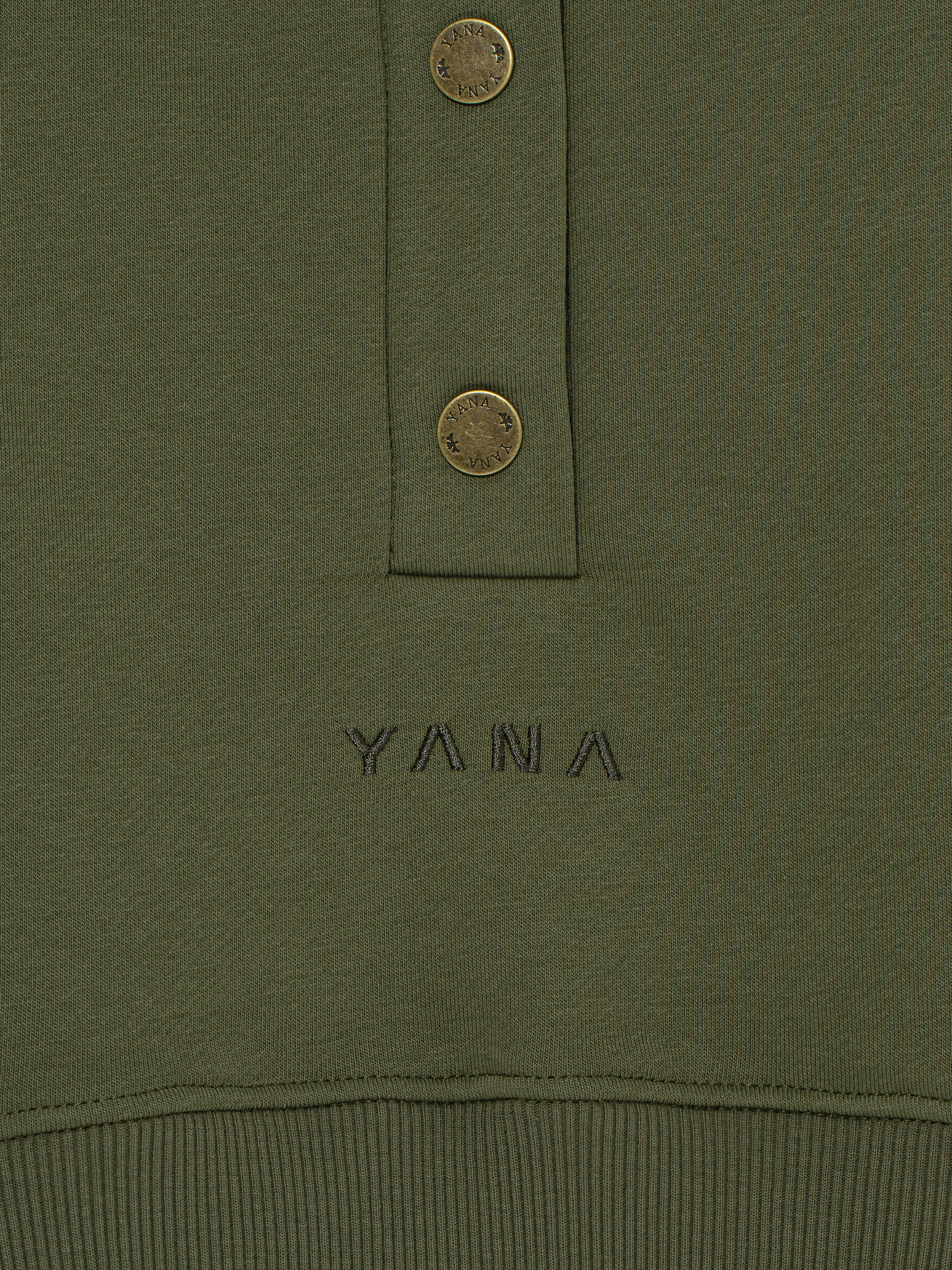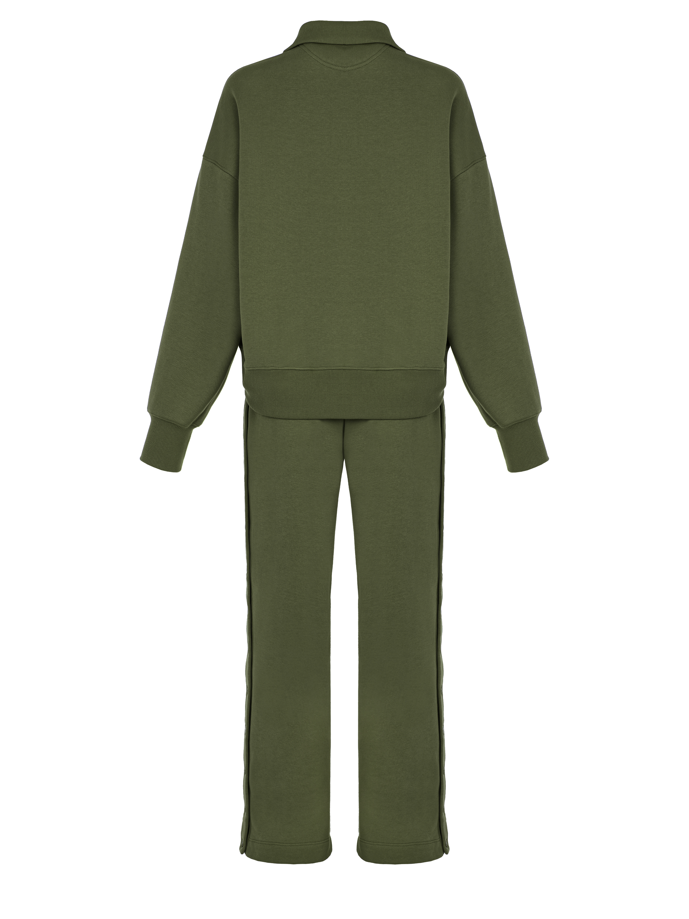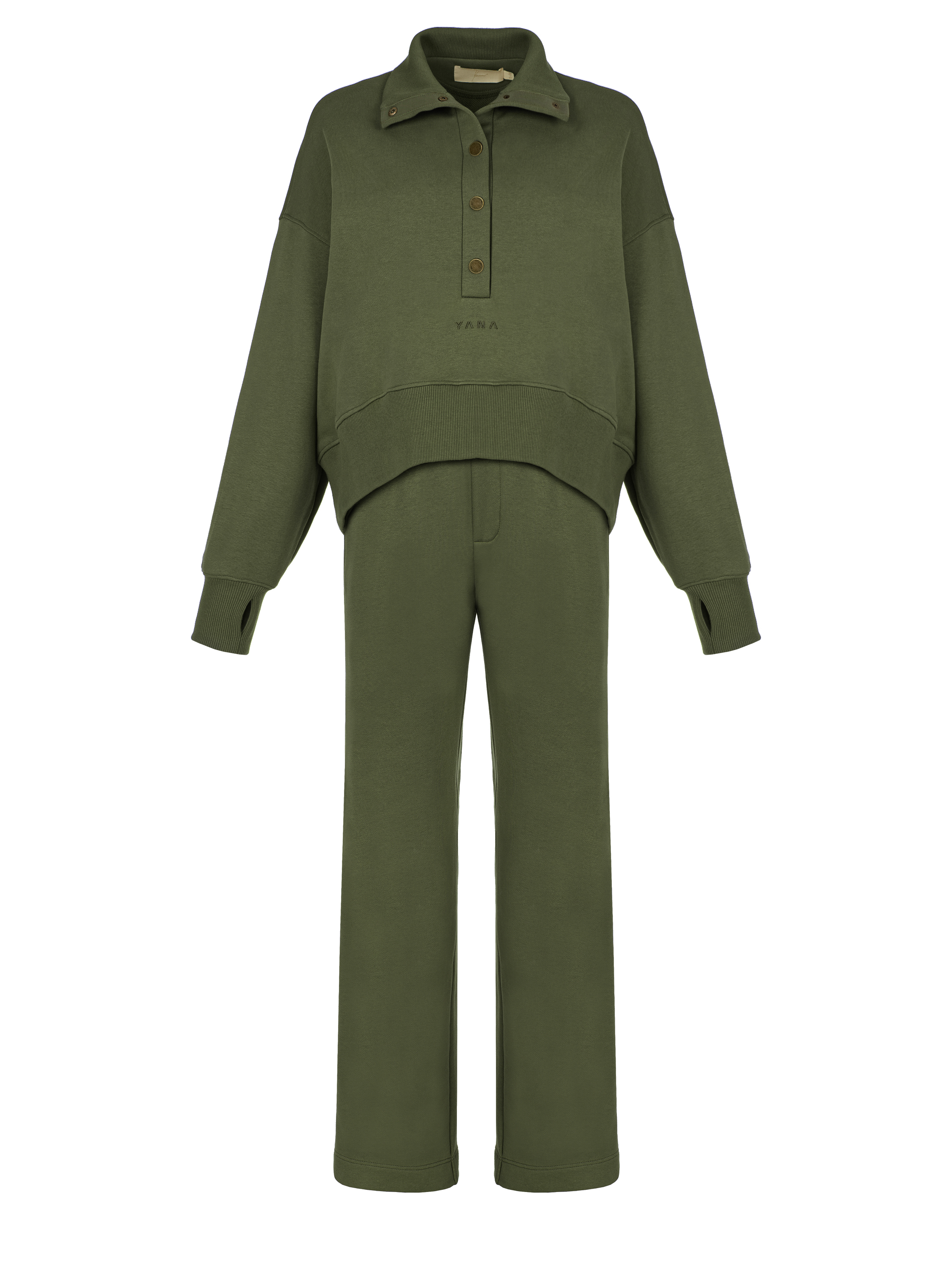 The knit tracksuit is made of warm green fleece with a brushed interior and consists of a cropped sweatshirt with a stand-up collar on snaps and sweatpants. The cuffs and collar are finished with a wide elastic band. The sweatshirt is decorated with tone-on-tone YANA embroidery on the chest and a thumbhole cutout on the cuff. The trousers are complemented by snap side stripes.
