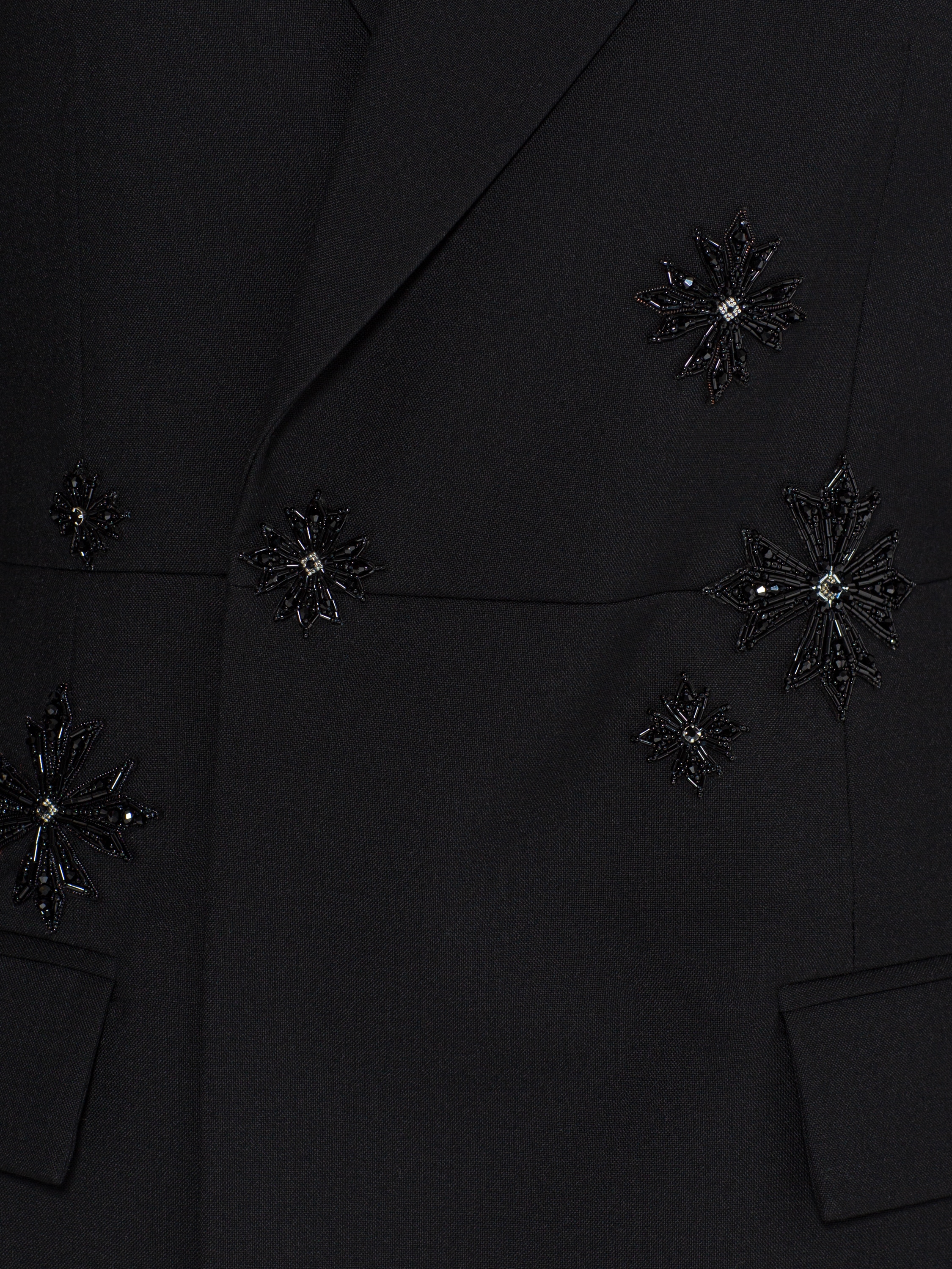 An elegant fitted jacket is made of black wool suiting fabric. The double-breasted model with shaped lapels is complemented by a bustle and flap pockets. The decoration of the item (embroidery with beads, bugle beads, bicone beads) took the craftsmen of the YANA Fashion House 58 hours of handwork.