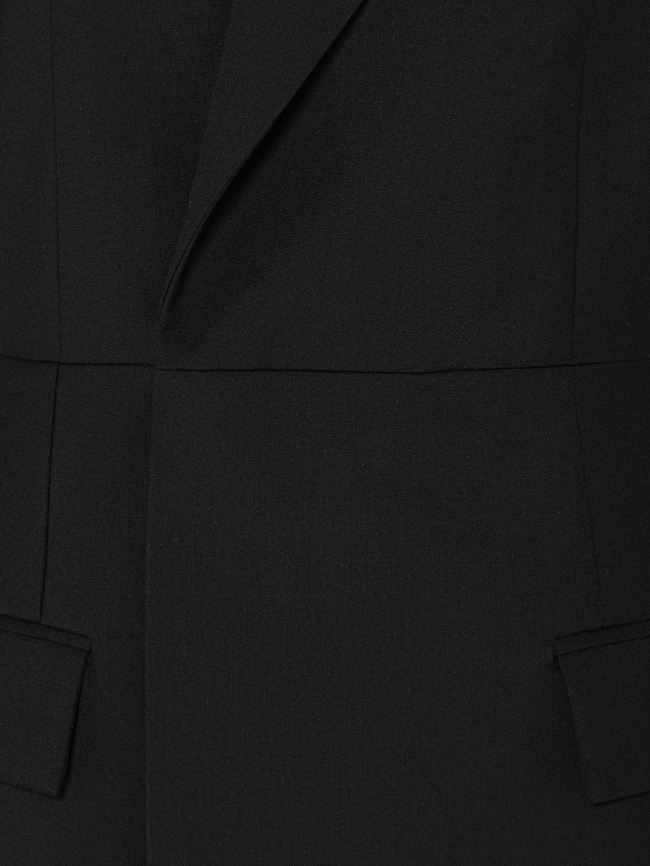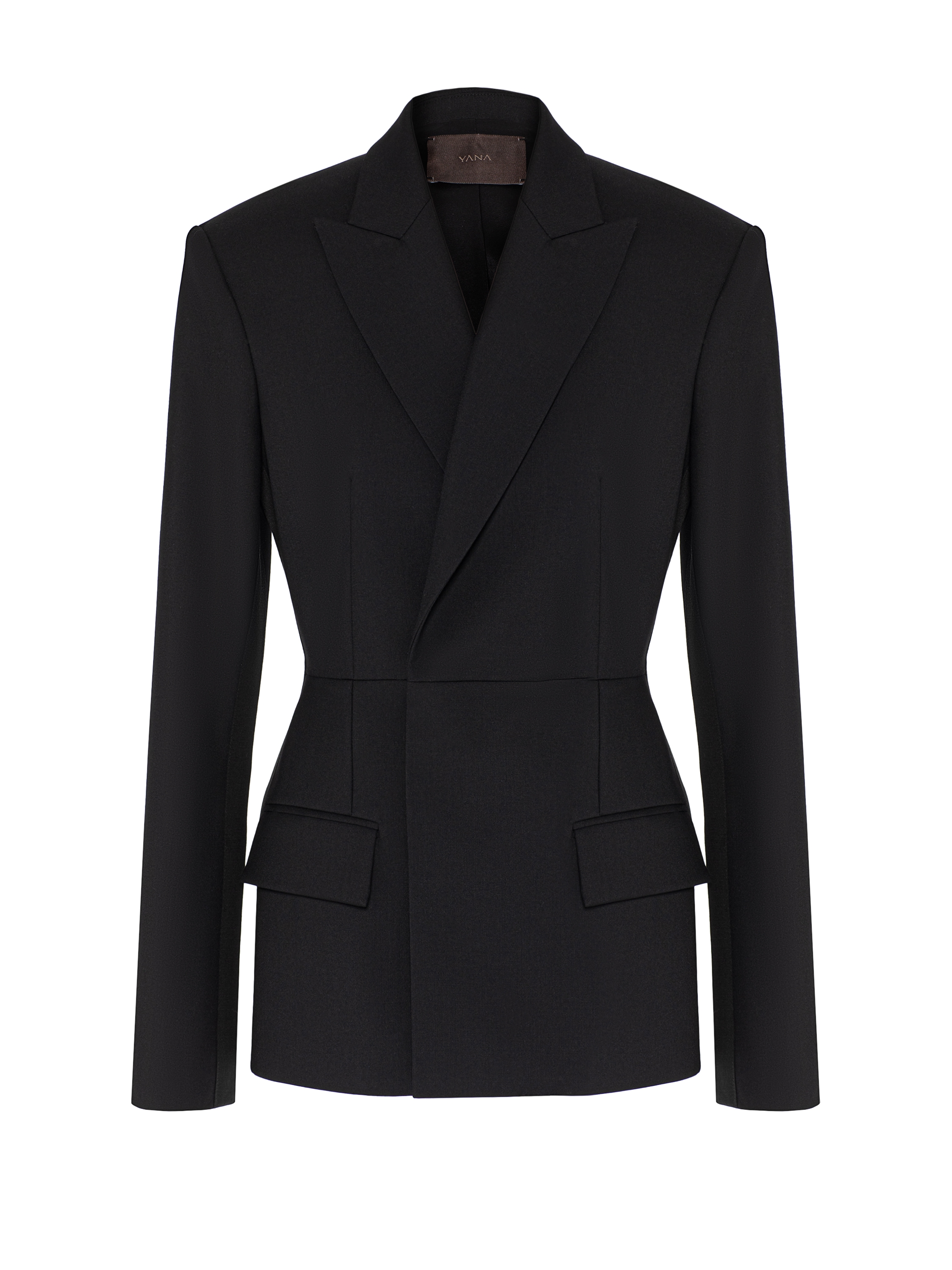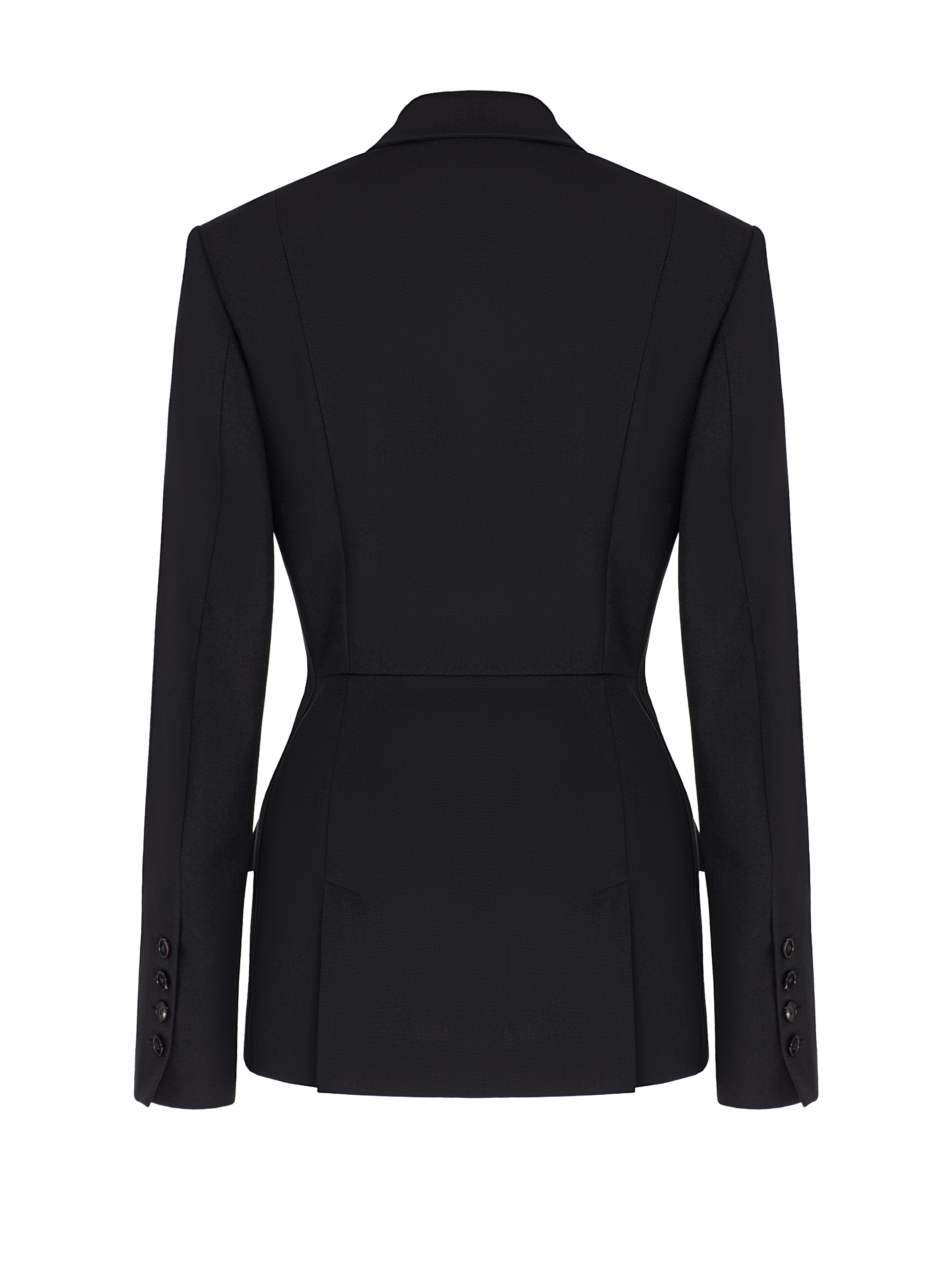 A laconic black double-breasted blazer is made of wool fabric. The minimalist fitted model is inspired by the aesthetics of uniform, combining elegant rigor and refined femininity. Statement shoulders combined with shaped lapels add drama to the look.