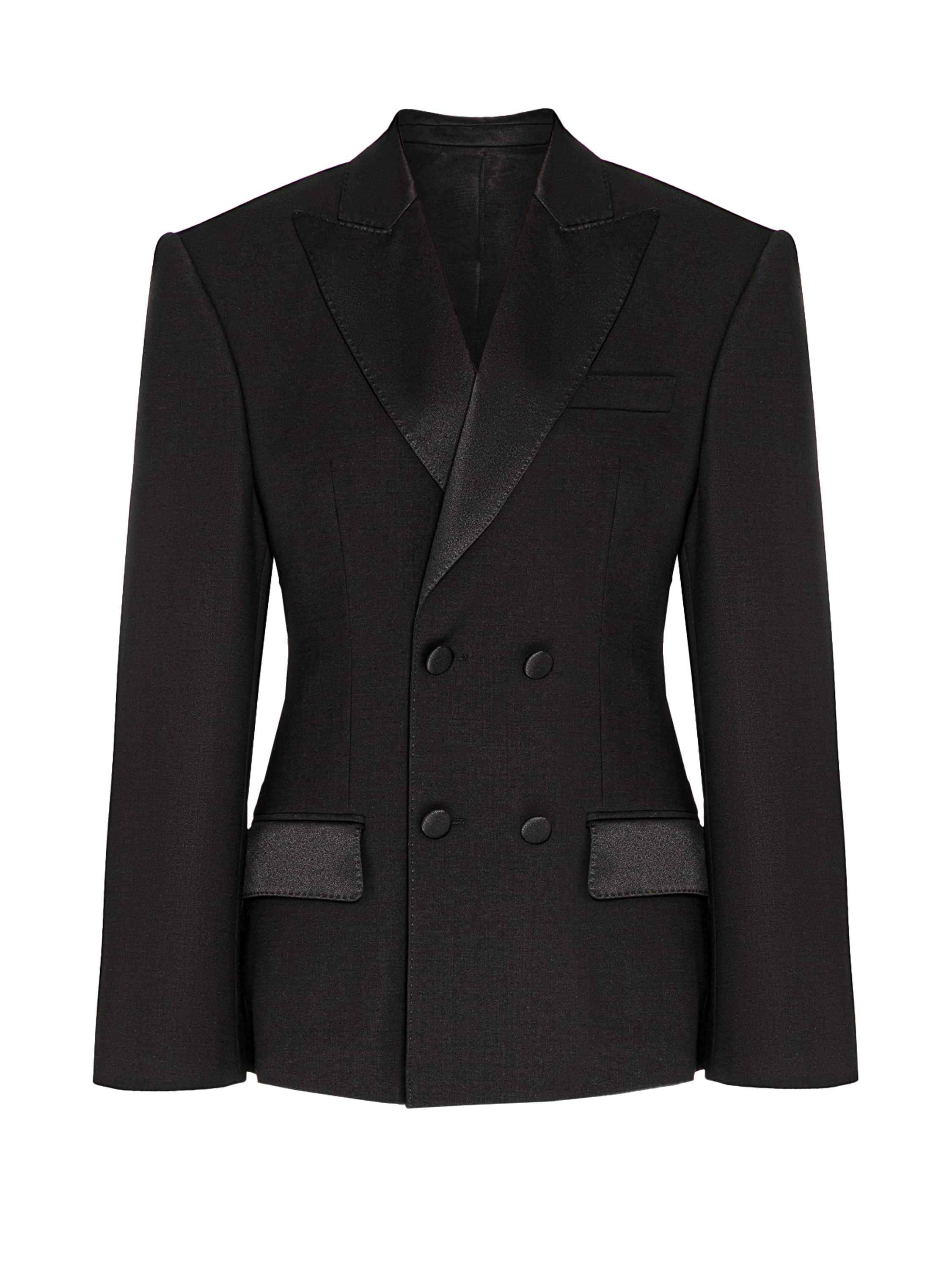 The double-breasted blazer made of black suiting fabric is an elegant classic with expressive accents: figured satin lapels, flaps and covered buttons. 12 hours of painstaking handwork — this is how long the masters of the Yana Fashion House spent on puffing-technique finishing.