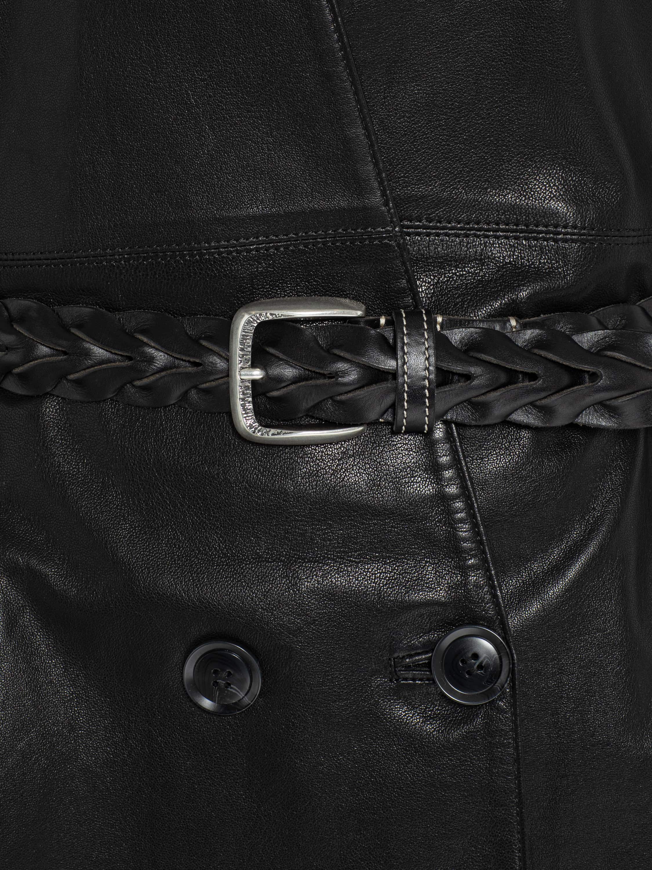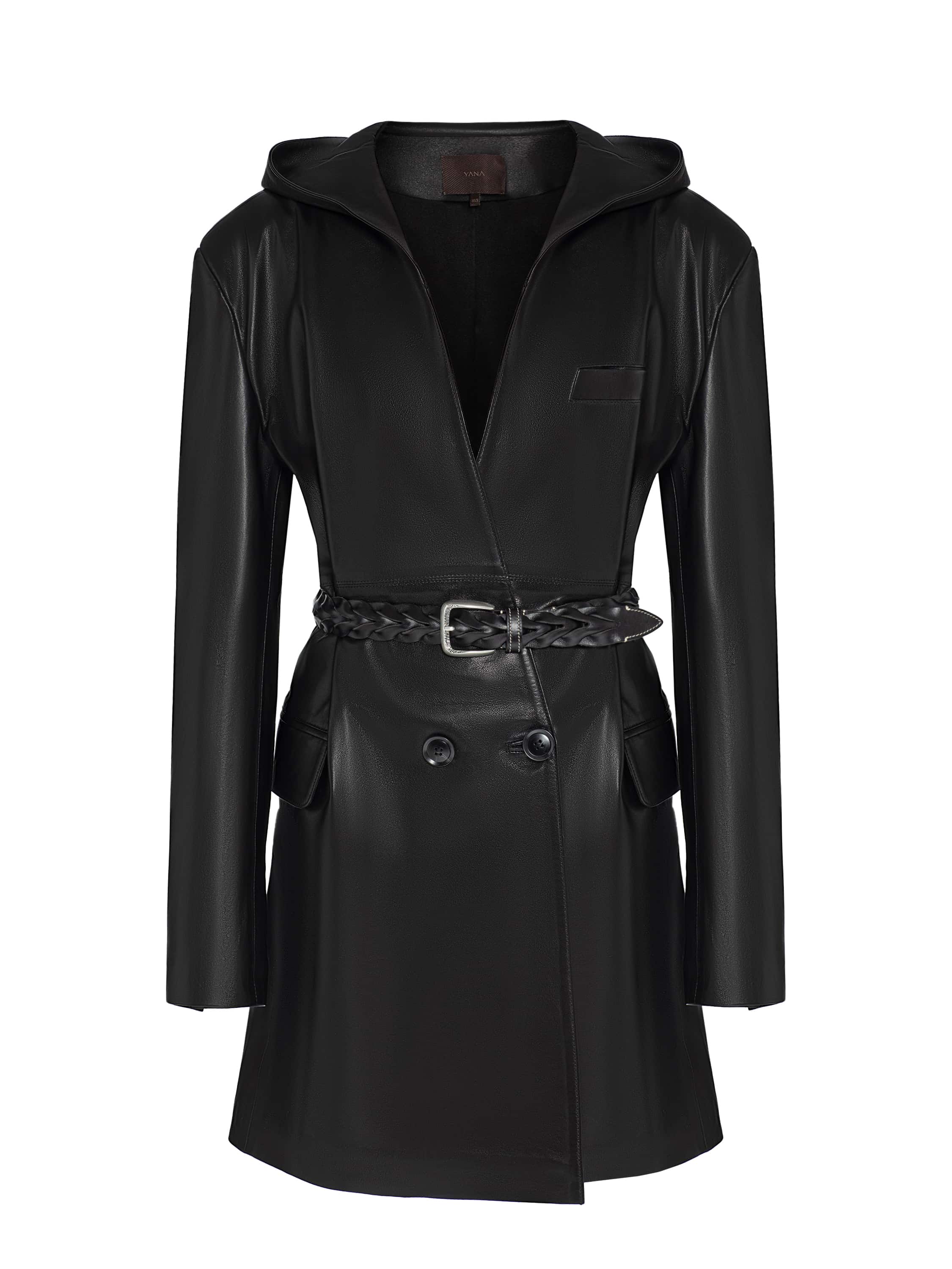 The double-breasted elongated blazer is sewn from genuine leather in a black shade. The piece is complemented by a hood. A braided belt comes with the blazer. Flap pockets on the sides.