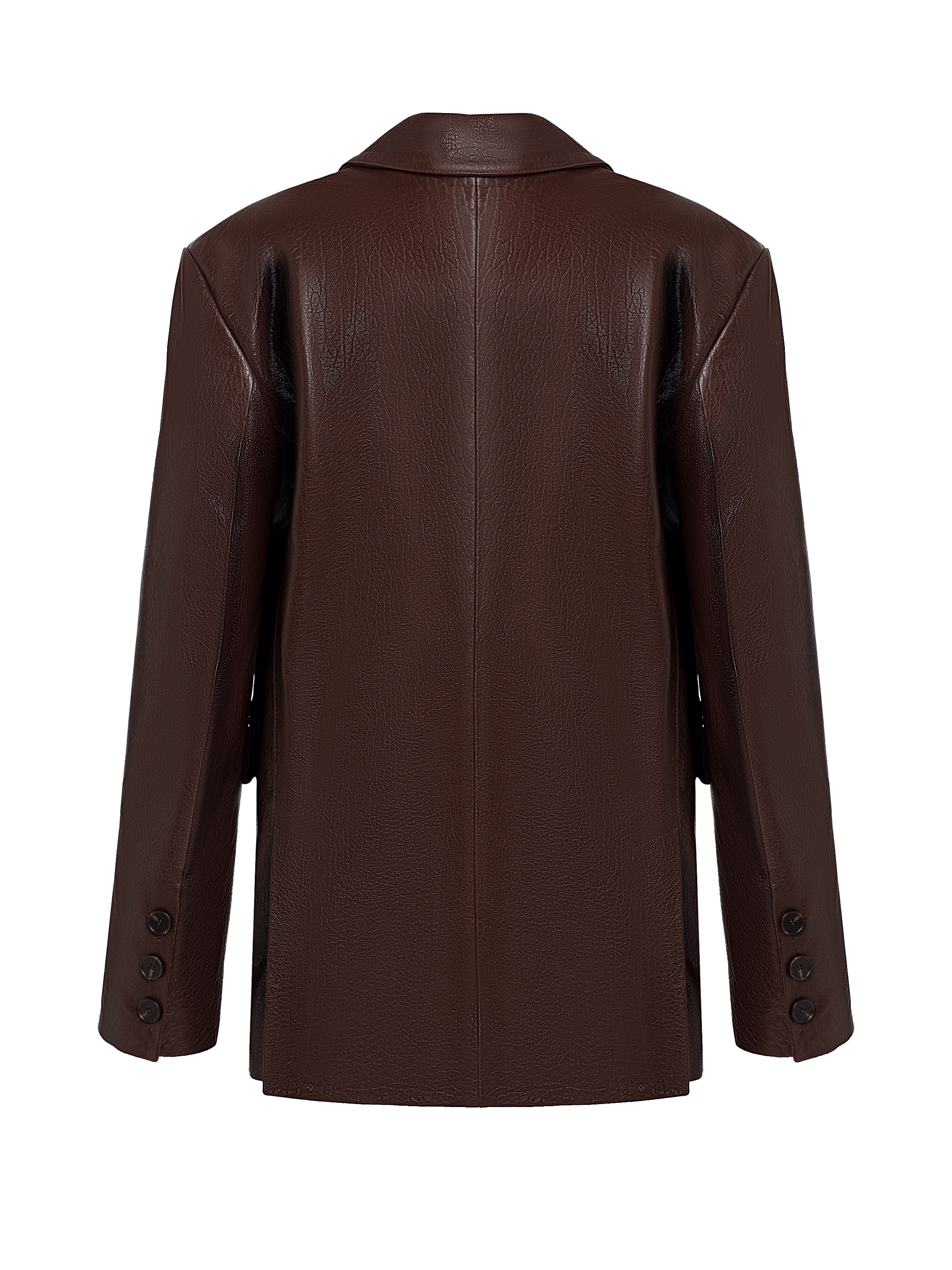 The double-breasted brown leather jacket with broad shoulders gives the look a striking graphic quality. The model with two vents is complemented by flaps and shaped lapels.