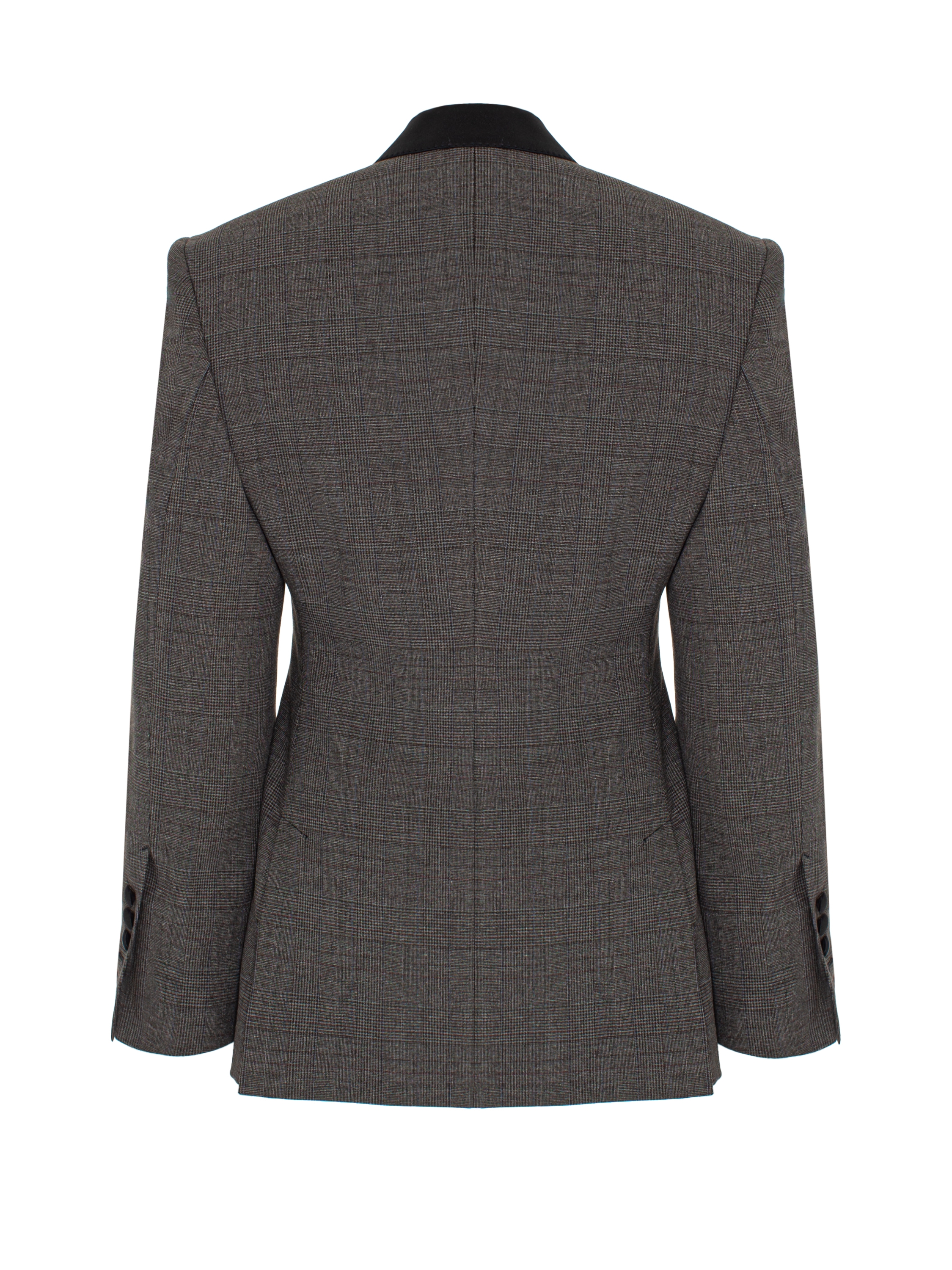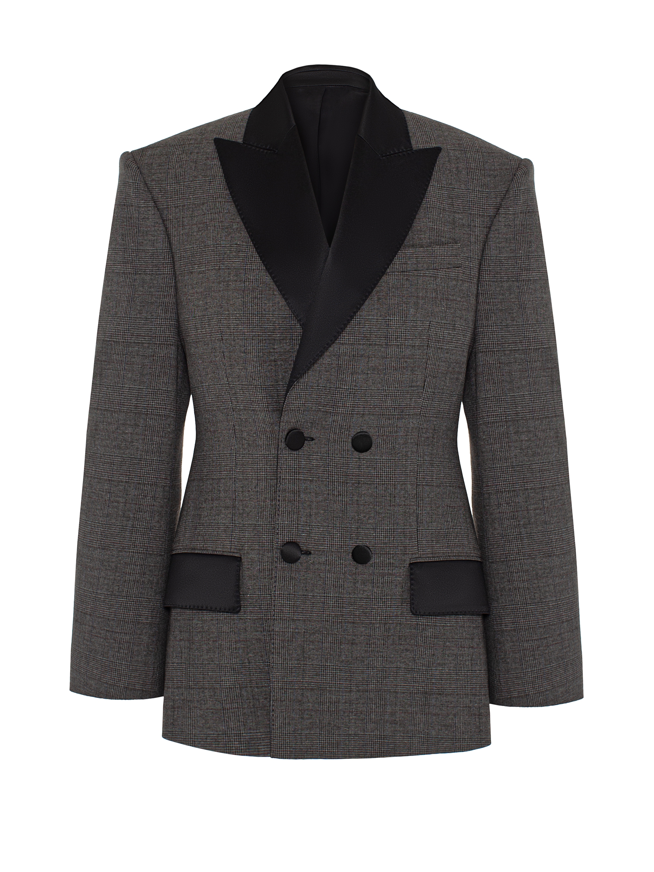 The grey double-breasted checked blazer with dramatic satin lapels is elegant classics in a modern interpretation. Clean lines and a geometric cut create a striking look that combines rigor and femininity. This model will emphasize your confidence and sense of style while remaining within the framework of a business dress code.