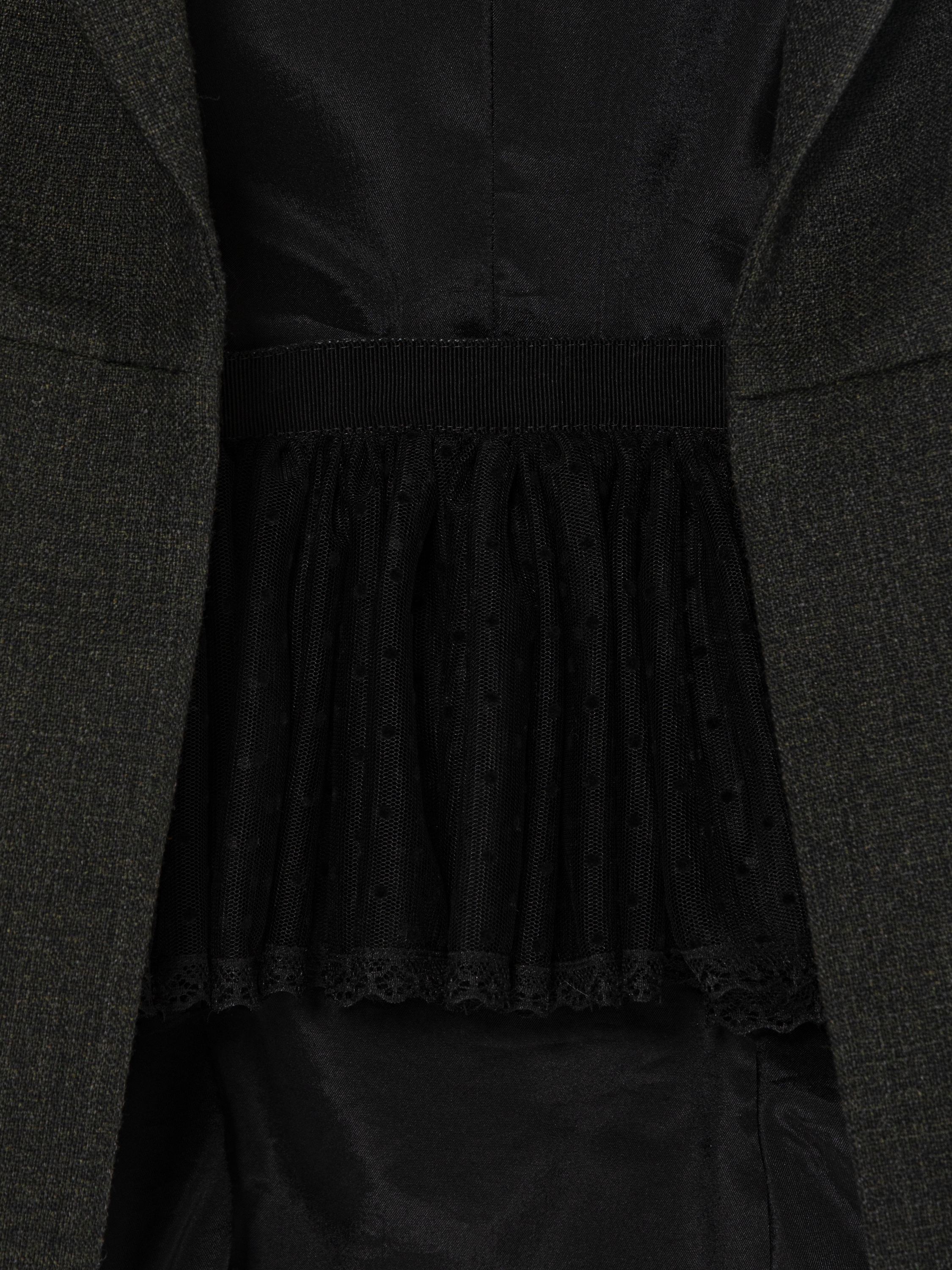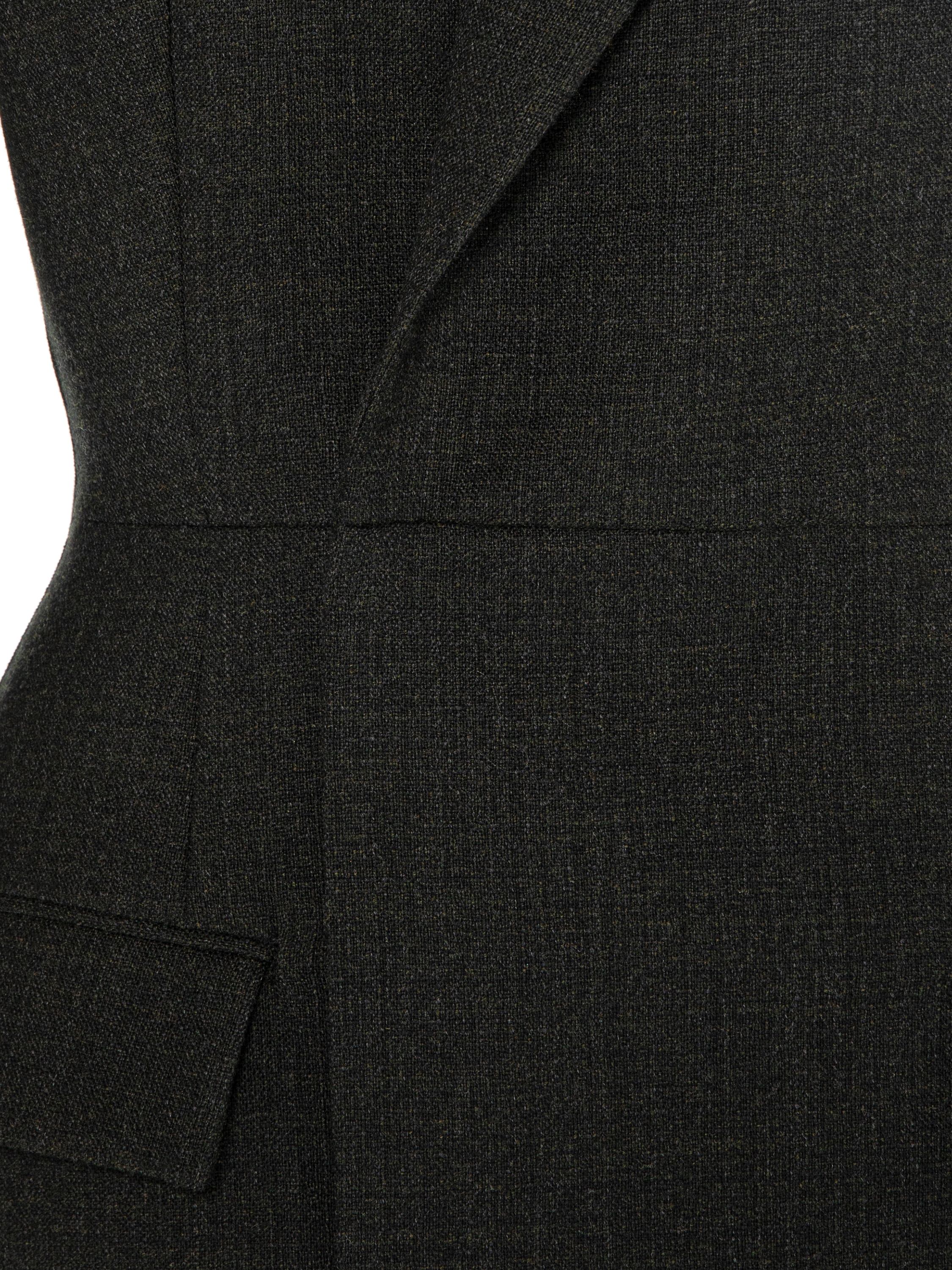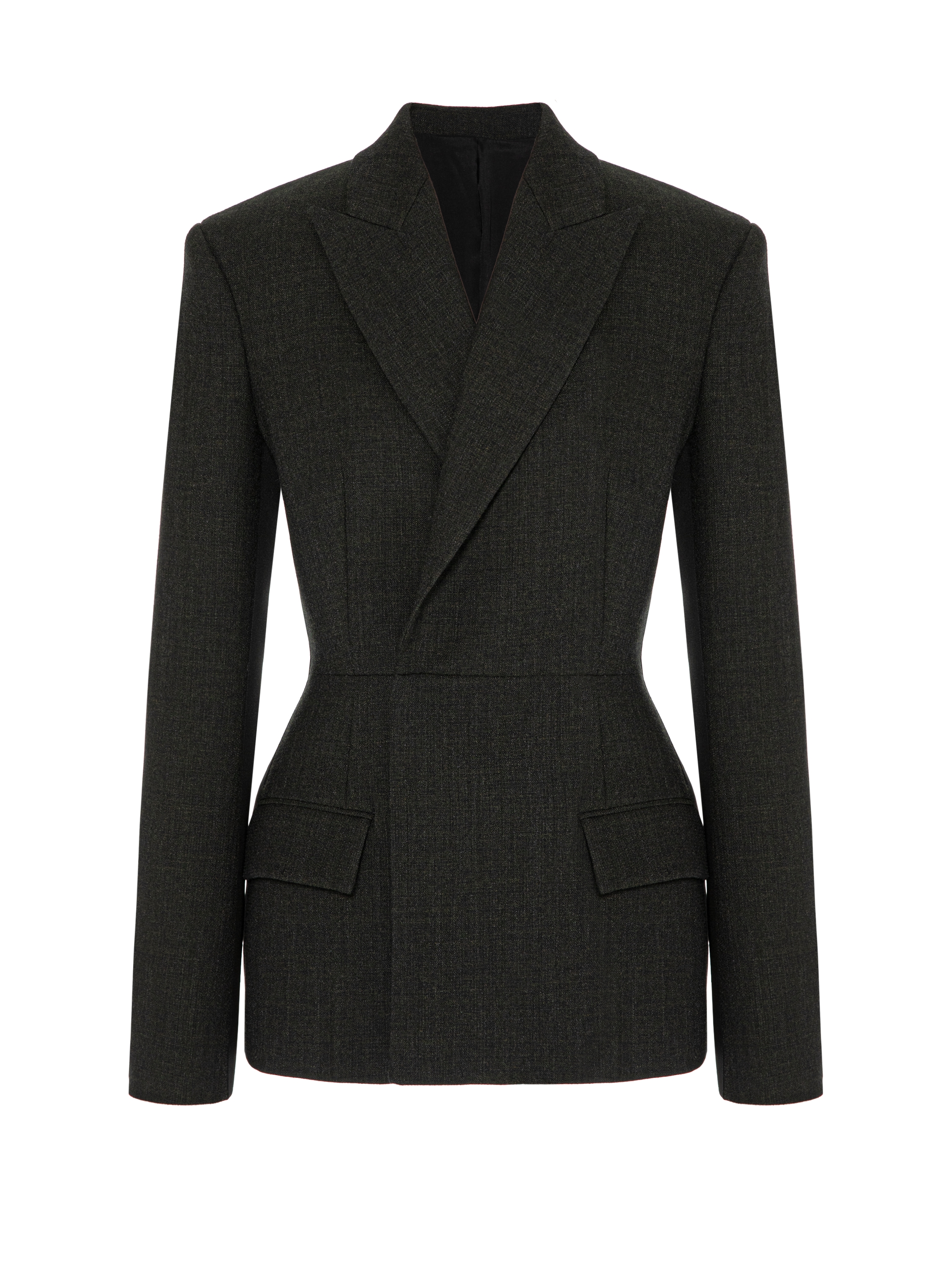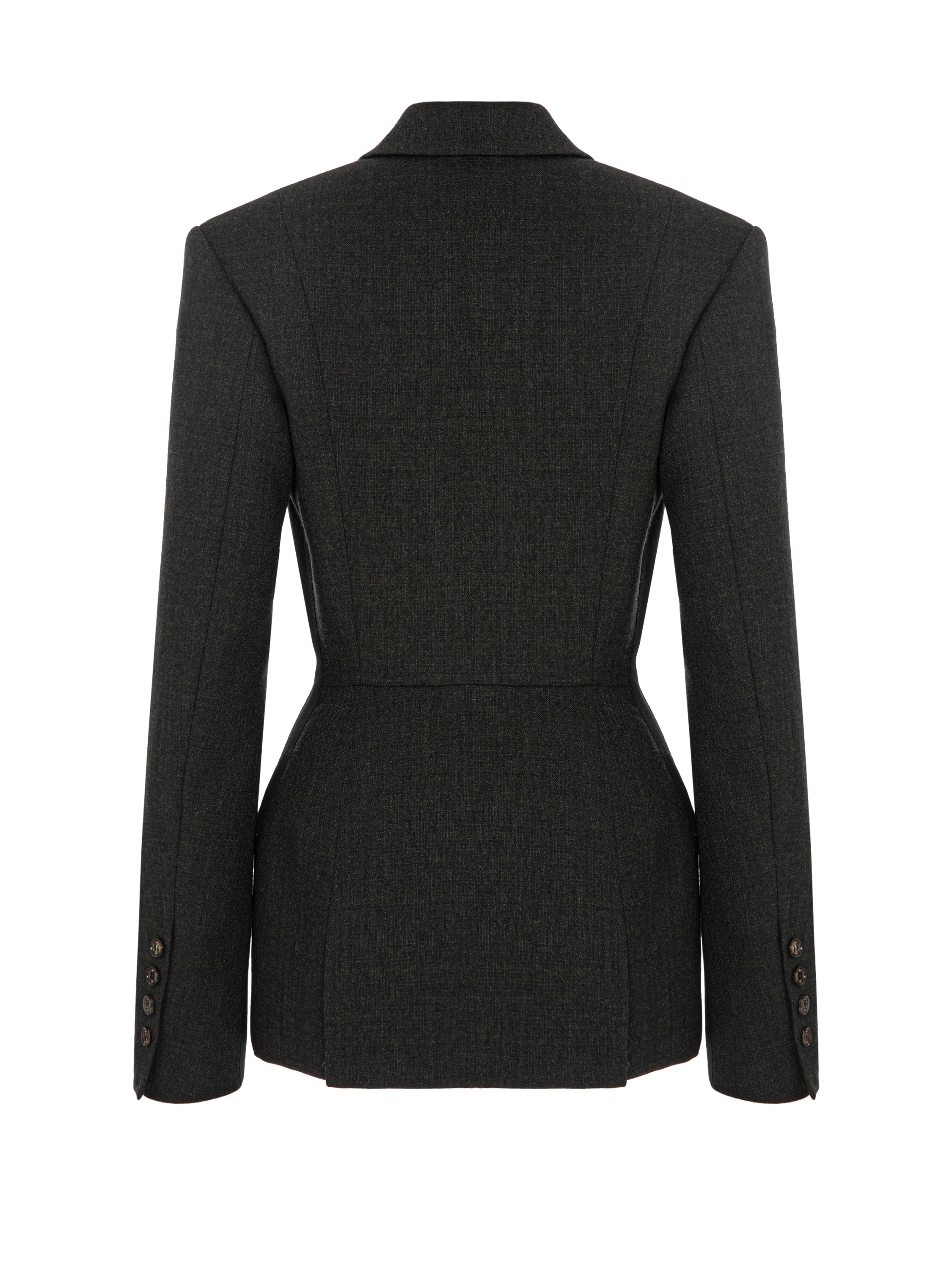 The double-breasted blazer with emphasized shoulders and a fitted silhouette is a perfect embodiment of the harmony of business style inspired by uniform and refined femininity. A solid-colored model is made of wool fabric in a noble dark olive hue. A classic pencil skirt will be the ideal complement to the look from the new Yana collection.