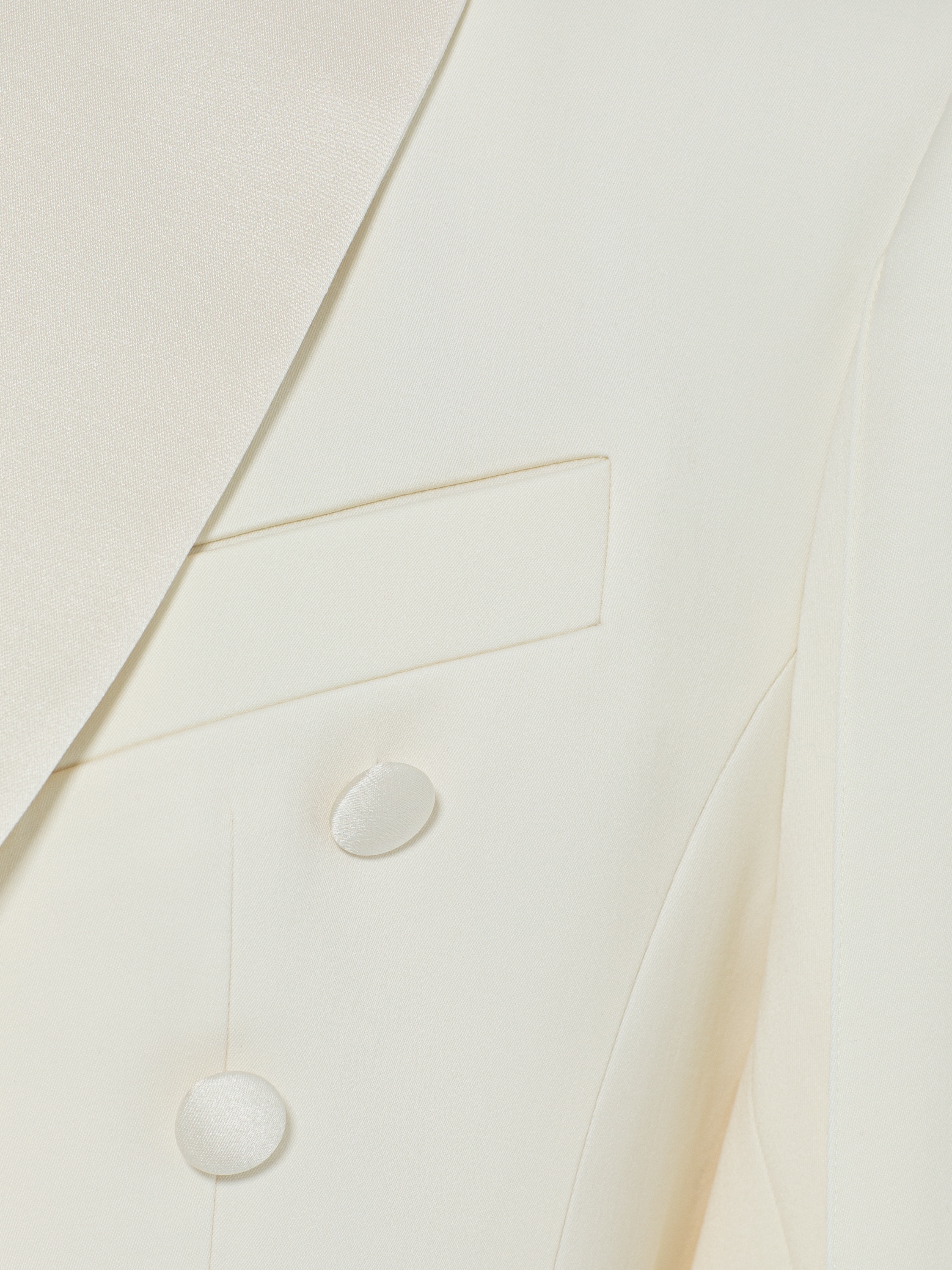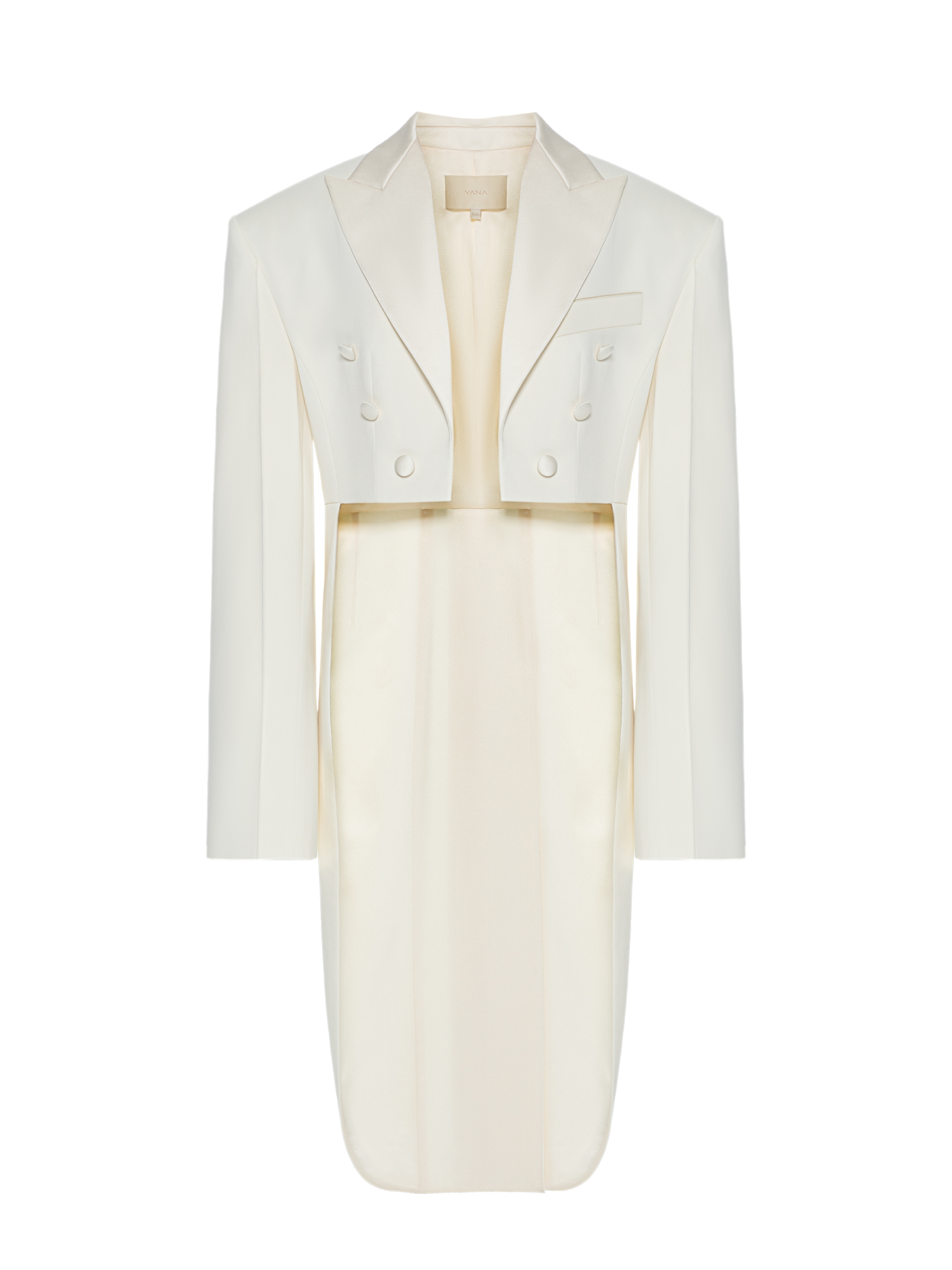 The off‑white tailcoat jacket with shaped satin lapels will become a striking element of the look. The piece is made of premium-quality suiting wool fabric.