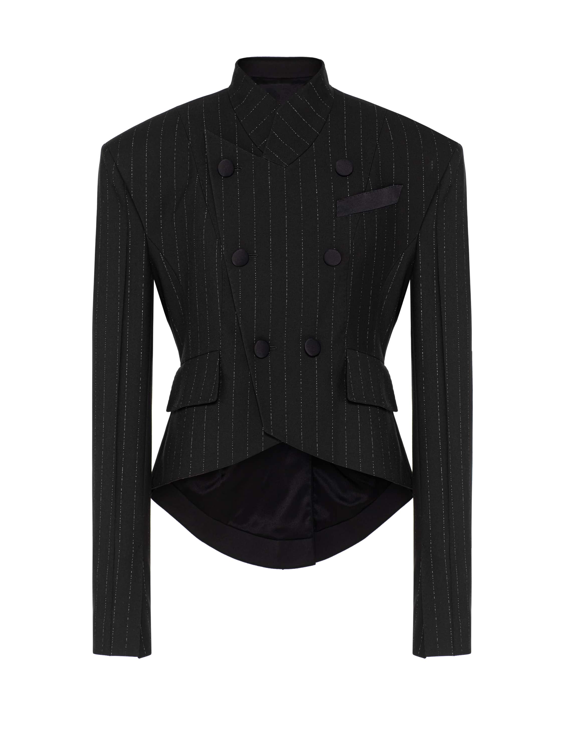 A cropped double-breasted jacket made of black pinstripe suiting fabric. The model with a stand-up collar is complemented by flaps, a welt pocket and fabric-covered buttons.