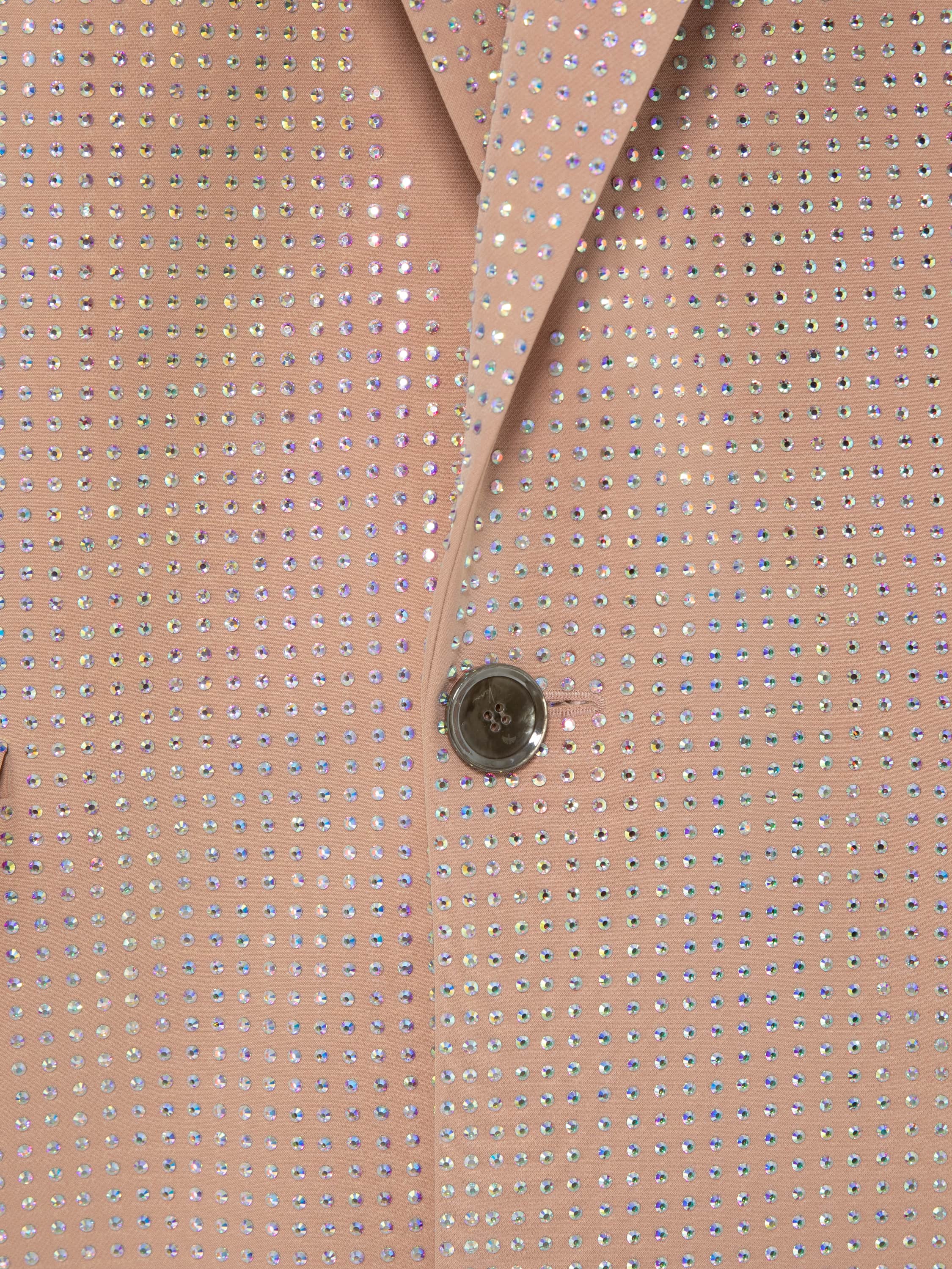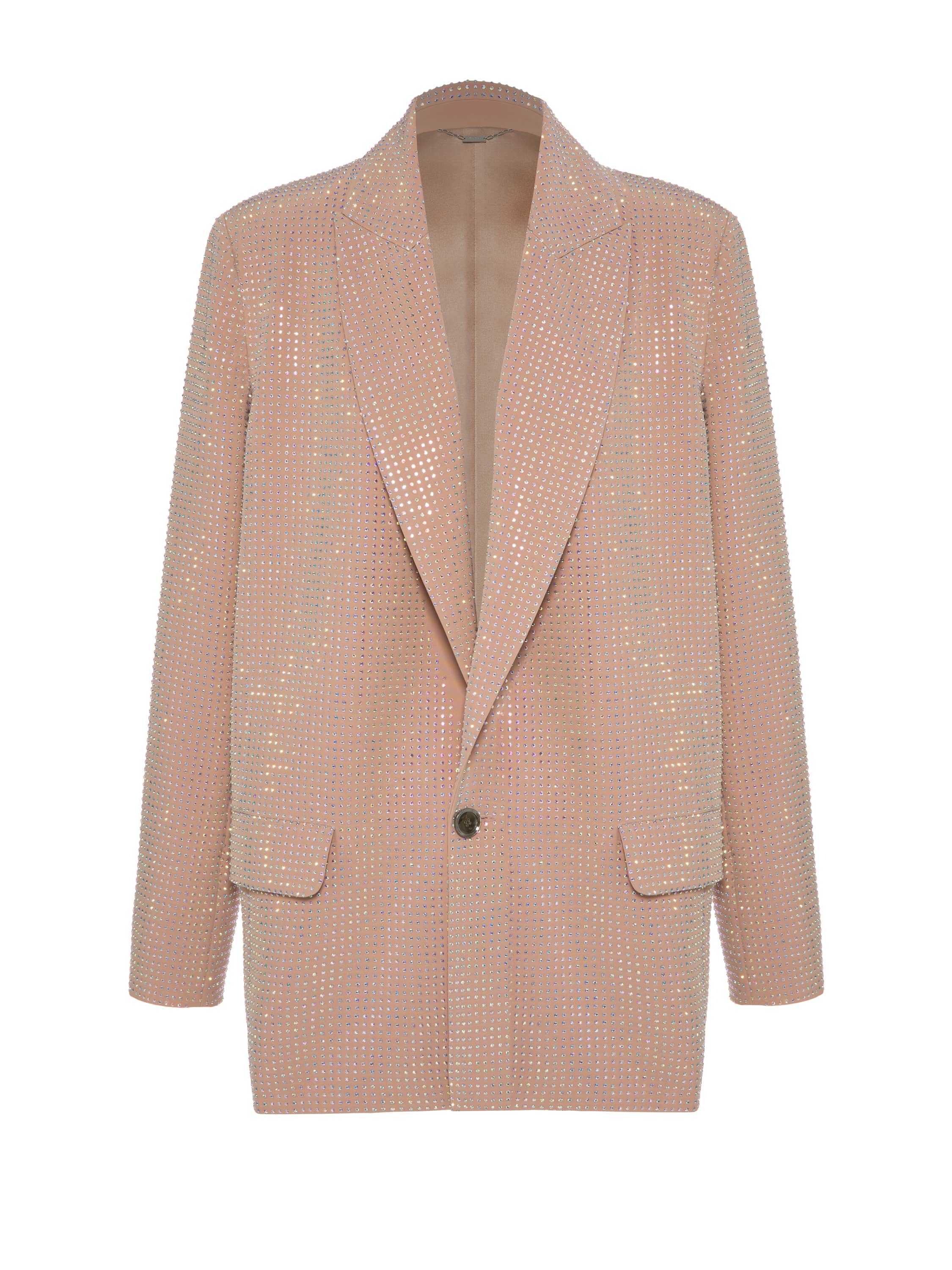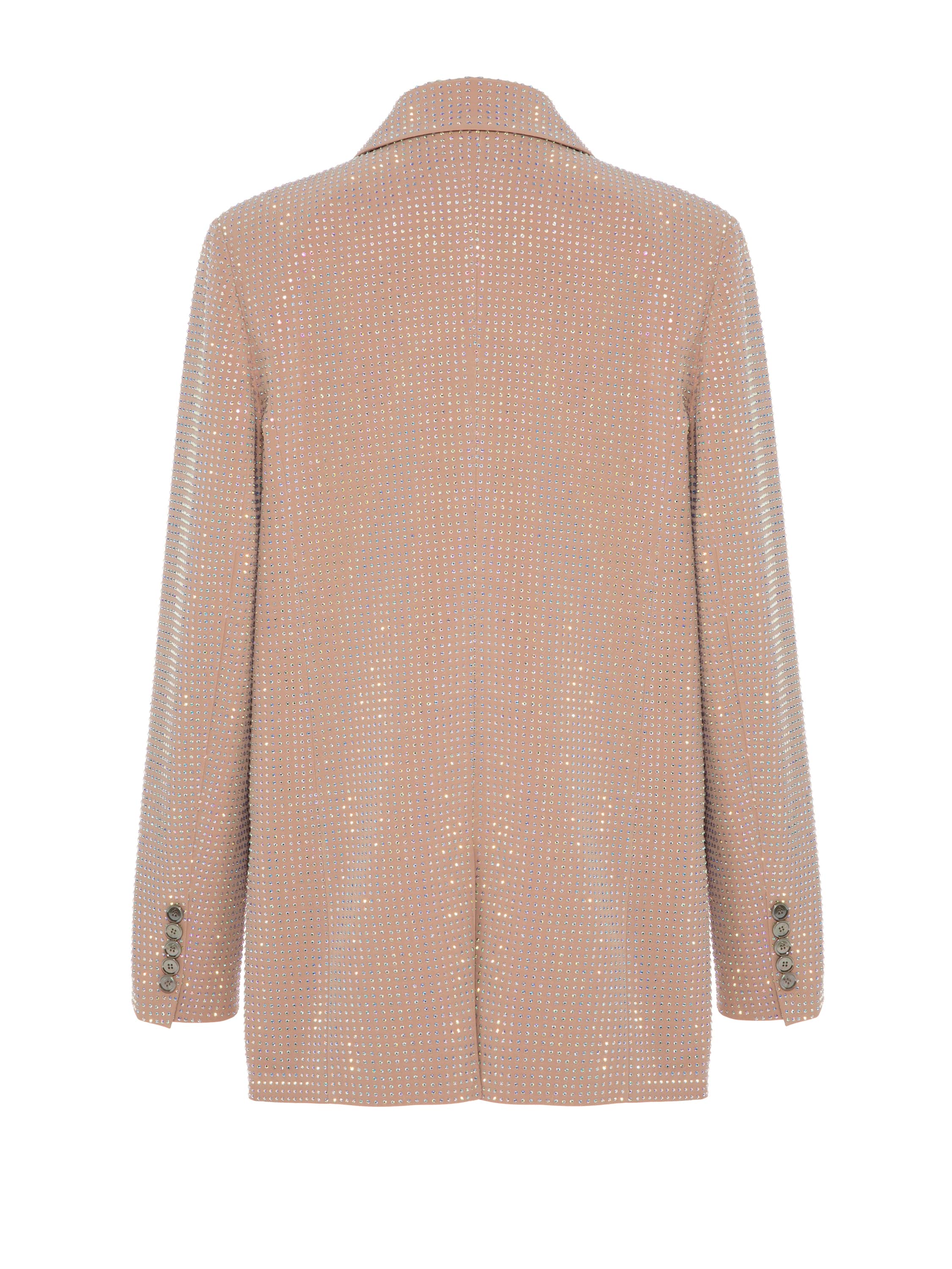 A beige oversized single-button jacket is made of suiting fabric. The piece is embellished with an appliqué of shimmering rhinestones that took Yana fashion house craftsmen 115 hours of handwork.
