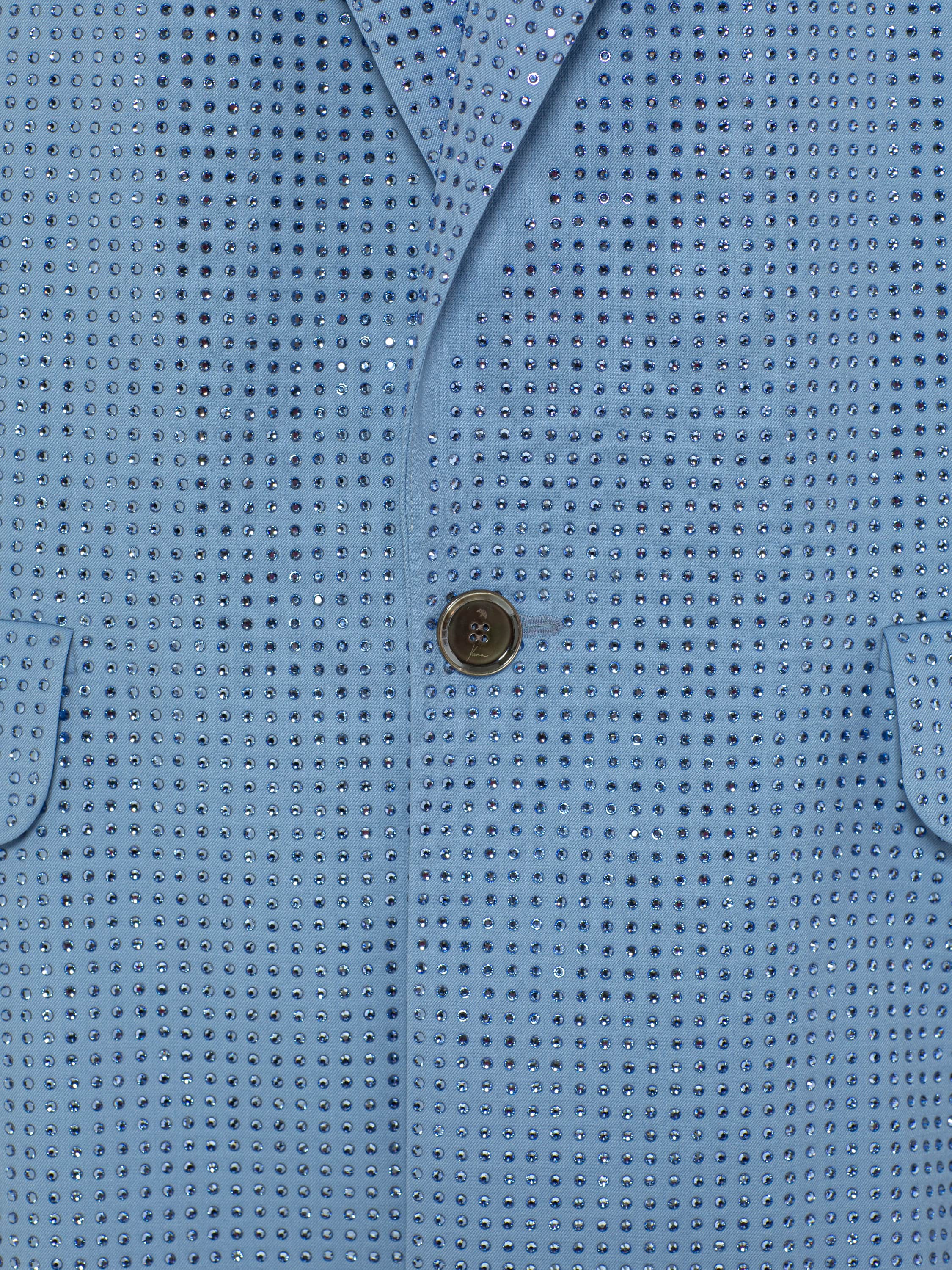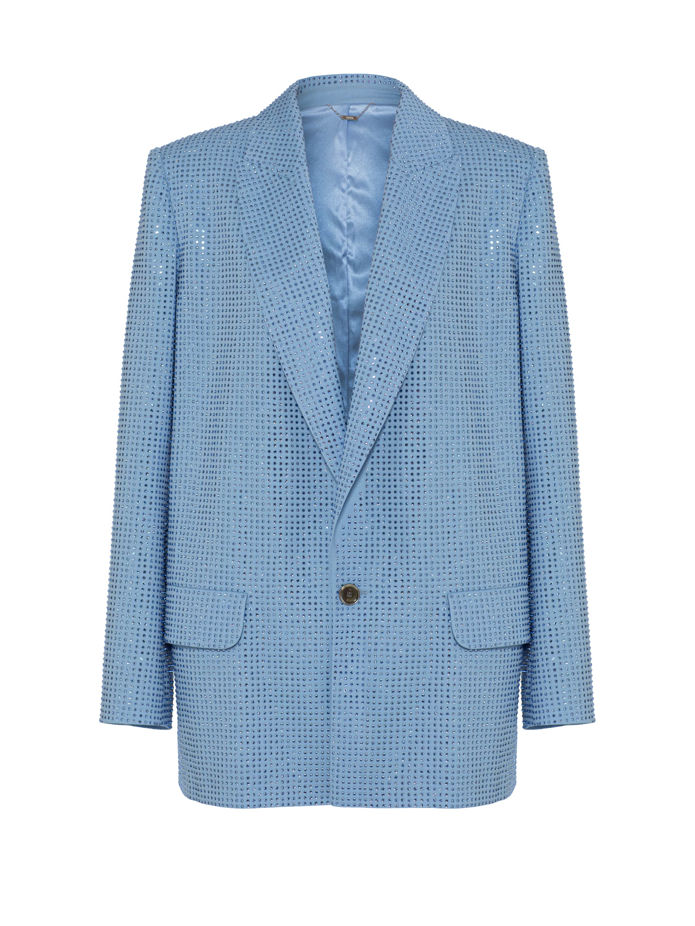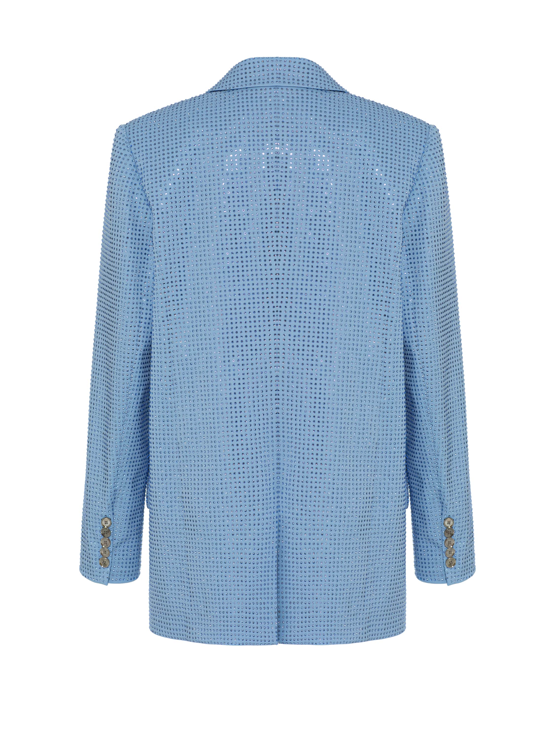 The light blue oversized blazer made of suiting fabric will become a bright detail of the look. The model is complemented by an elegant rhinestone appliqué, which took the Yana fashion house craftsmen 115 hours of handwork.