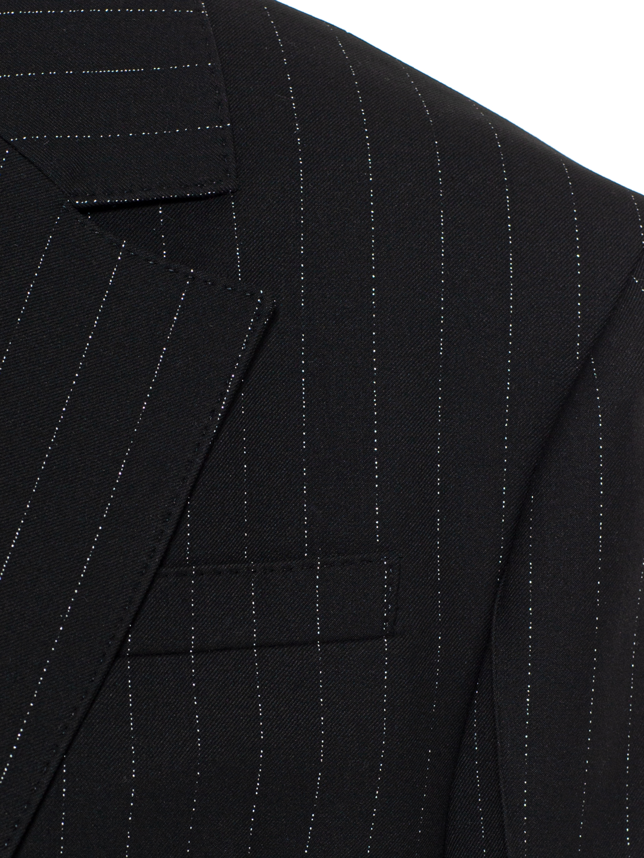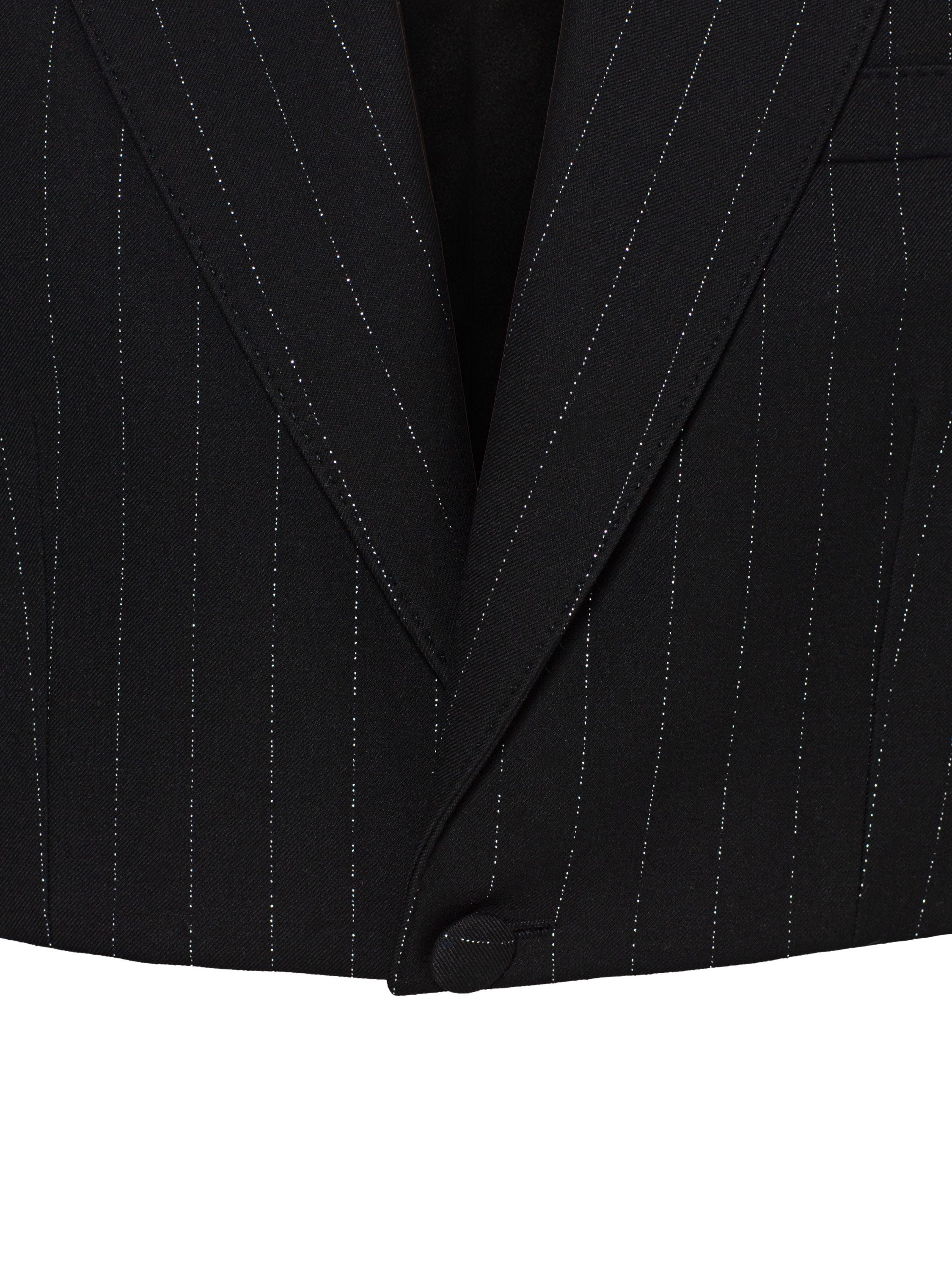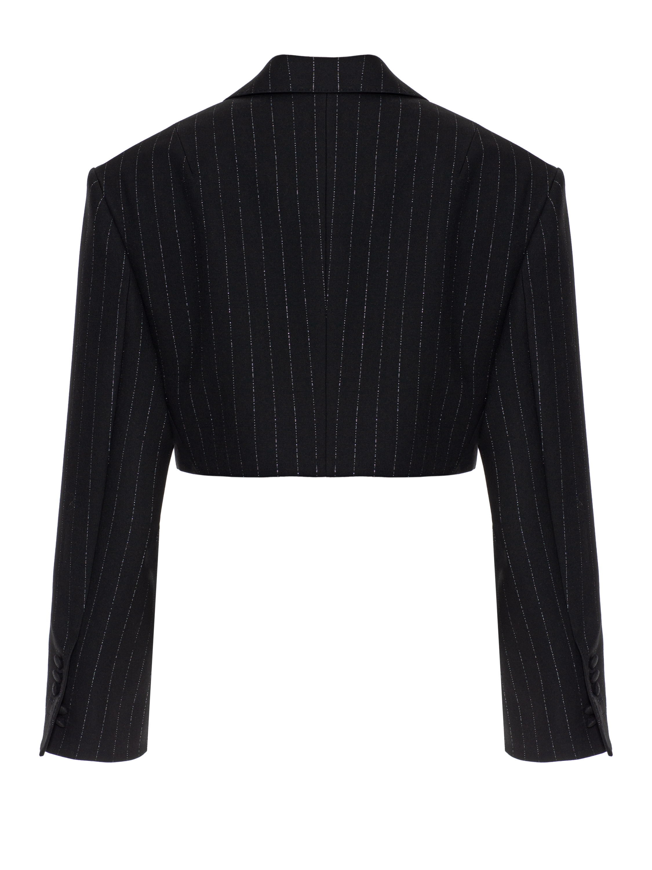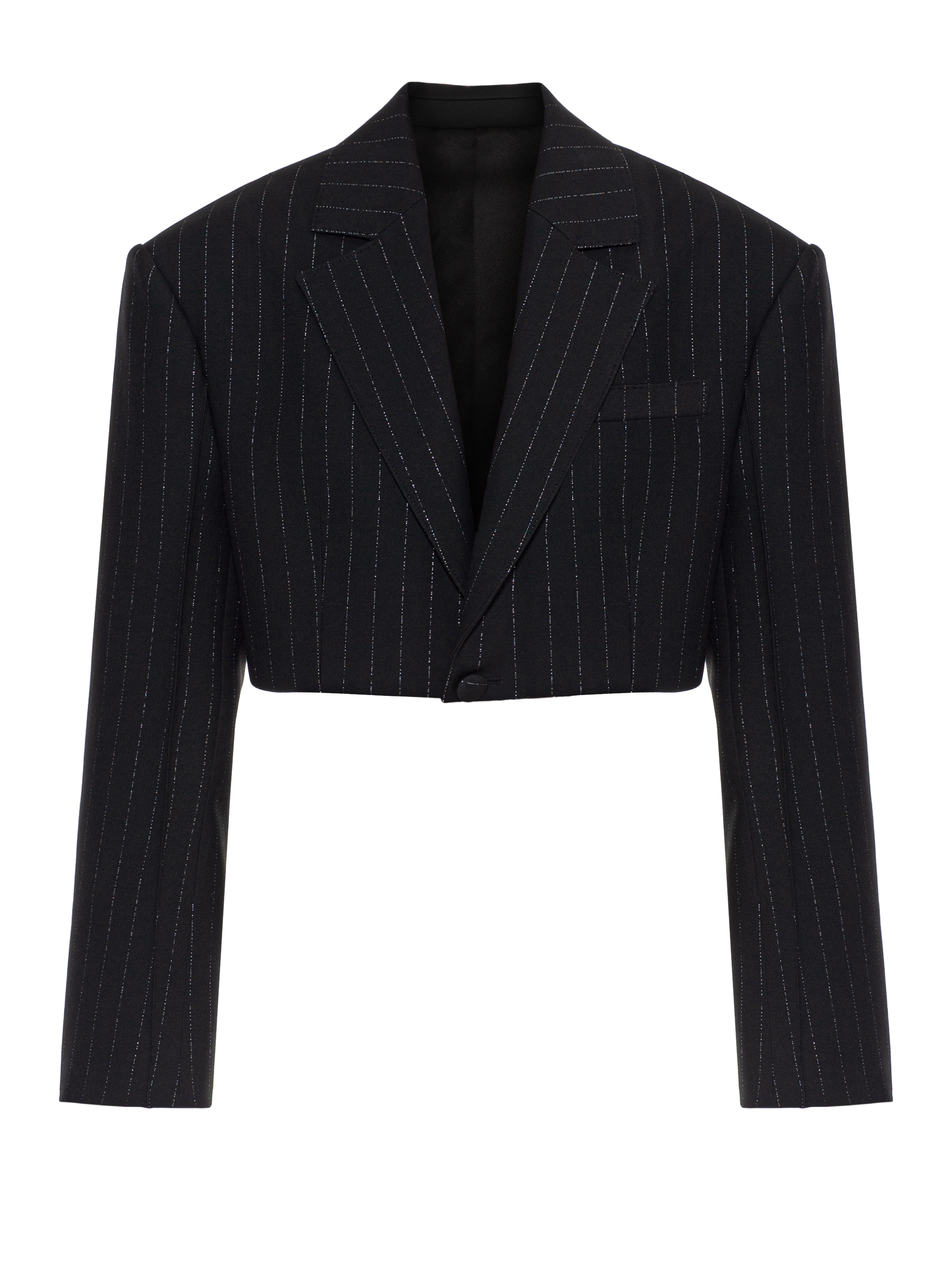 The cropped black jacket with a vertical stripe is made of suiting fabric. The model with broad shoulders is complemented by lapels and a welt pocket. Fastens with a single covered button.