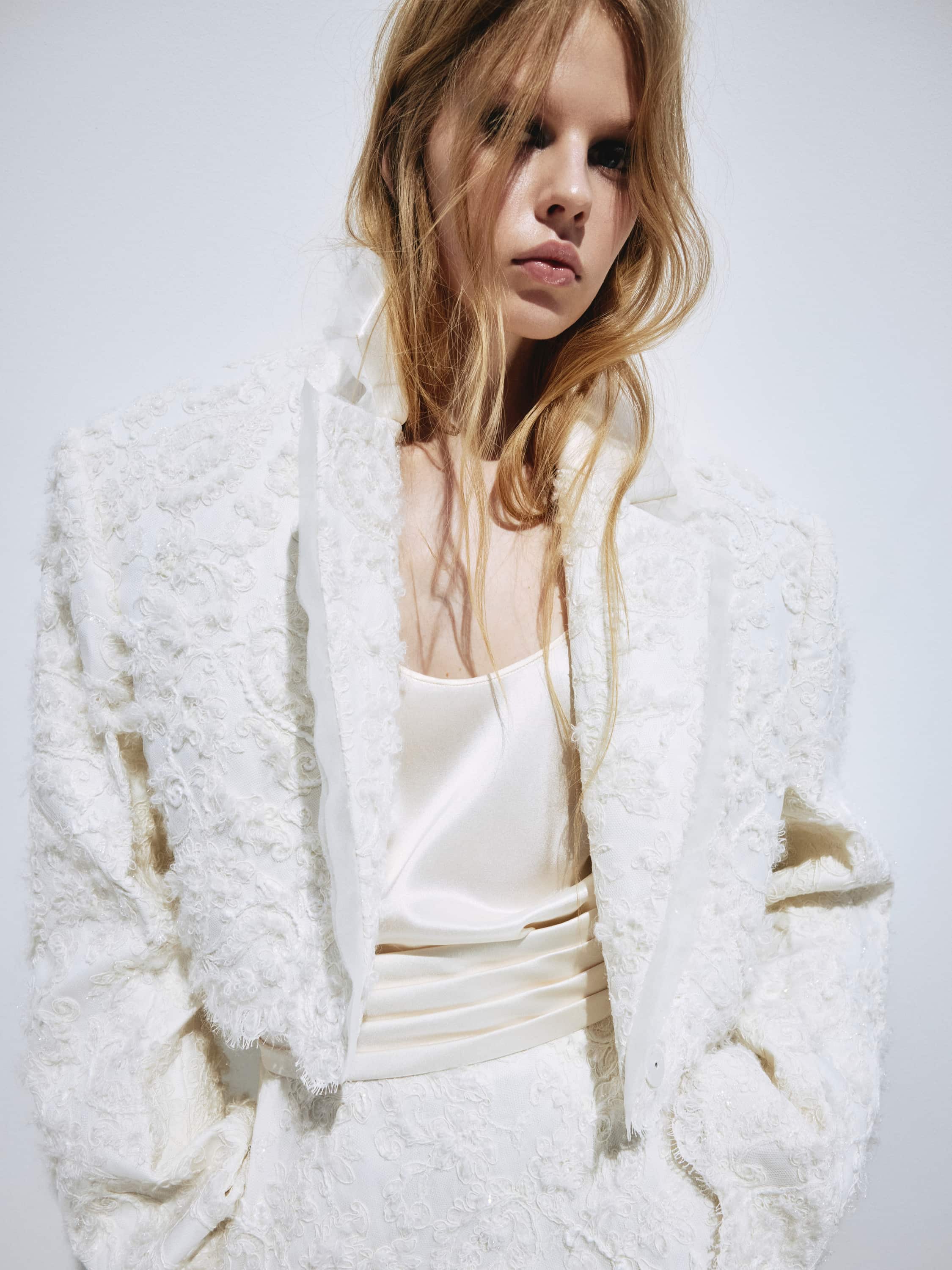 The cropped, broad-shouldered jacket is made of ivory wool suiting fabric. The style is adorned with exquisite embroidery featuring textured organza elements.