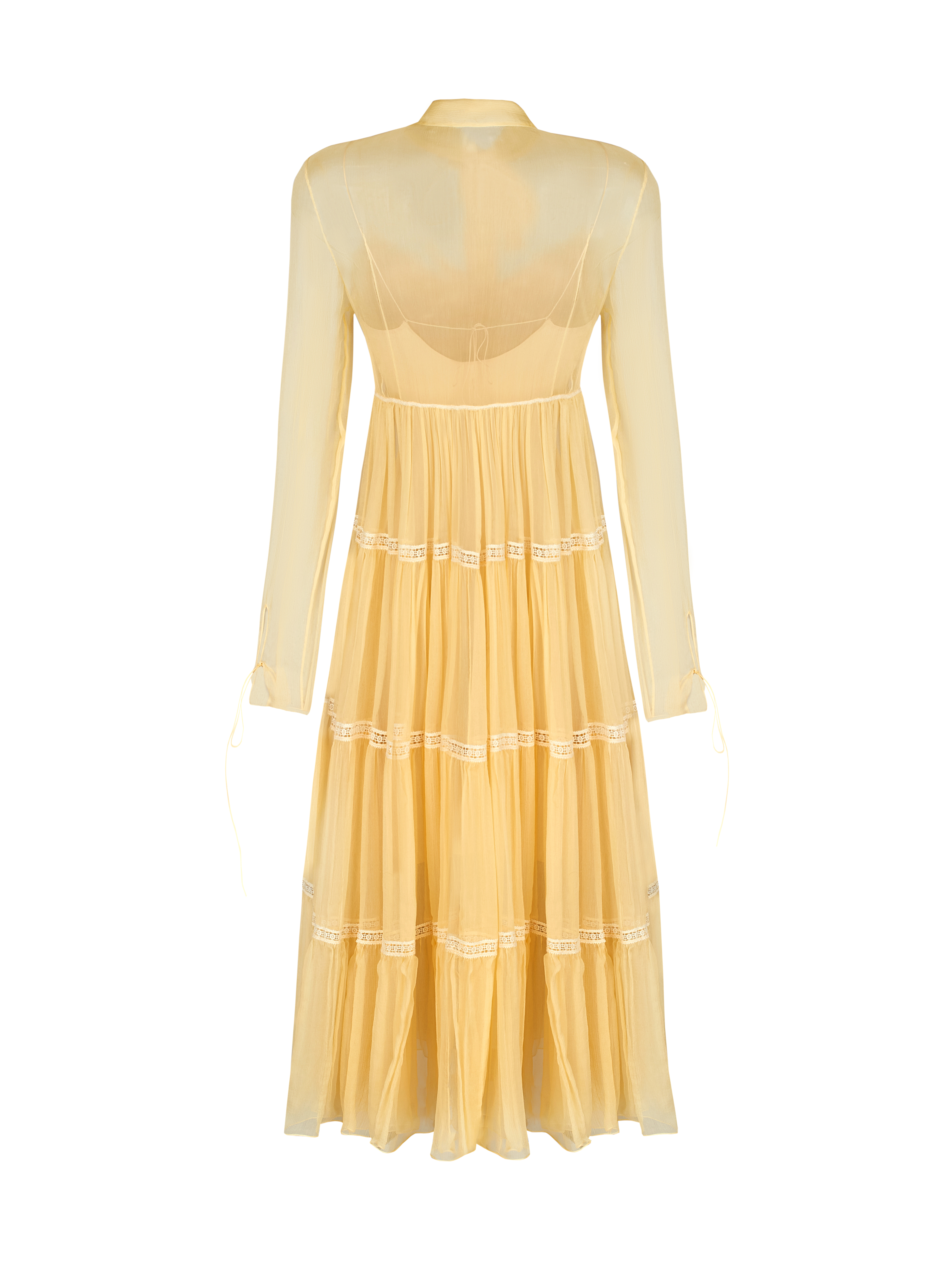 A yellow midi dress with long sleeves is made of lightweight, semi-sheer chiffon. The model is complemented by a tie at the neck. The hem of the dress is cut in three tiers and decorated with lace inserts. Button fastening at the front.