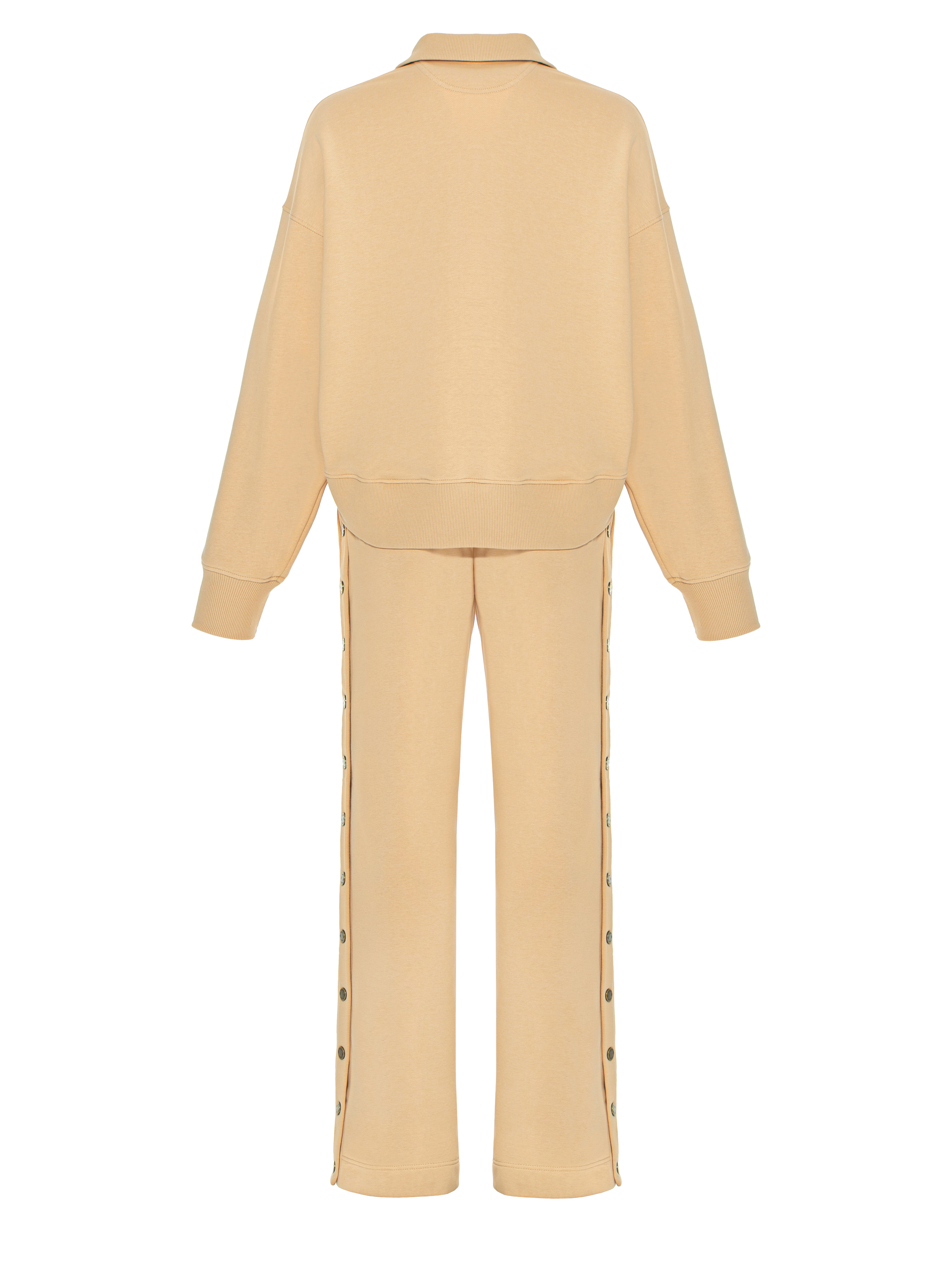 The knitted suit is made of warm sand-colored fleece with a brushed interior and consists of a cropped sweatshirt with a stand-up collar with snap buttons and sweatpants. The cuffs and collar are finished with a wide elastic band. The sweatshirt is decorated with tone-on-tone YANA embroidery on the chest and a thumbhole on the cuff. The trousers are complemented by snap-button side stripes.