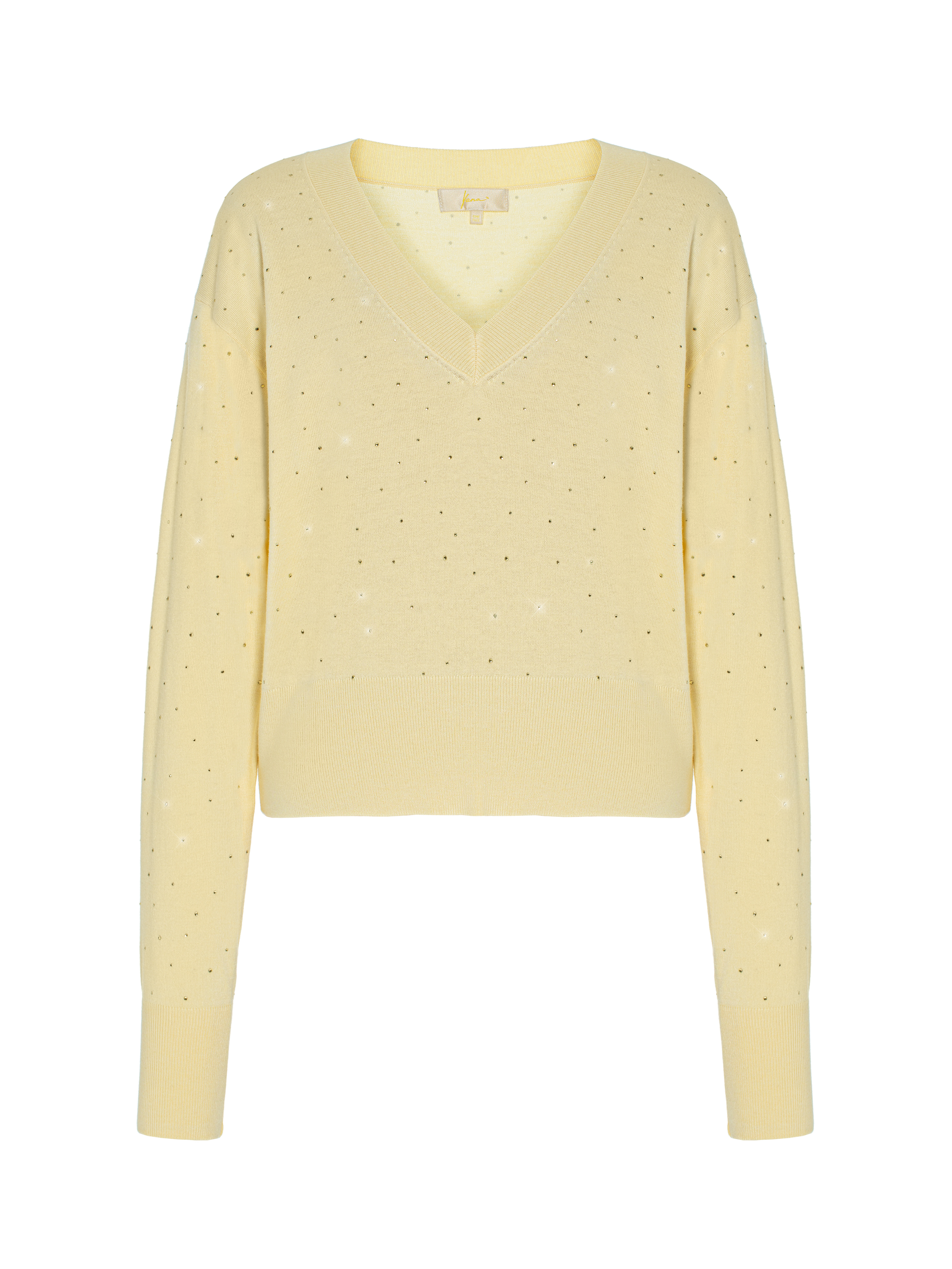 The pullover, made of natural light yellow cashmere, is incredibly comfortable and warm. The model is complemented by shimmering yellow rhinestones. Loose fit and elegant V-neckline.