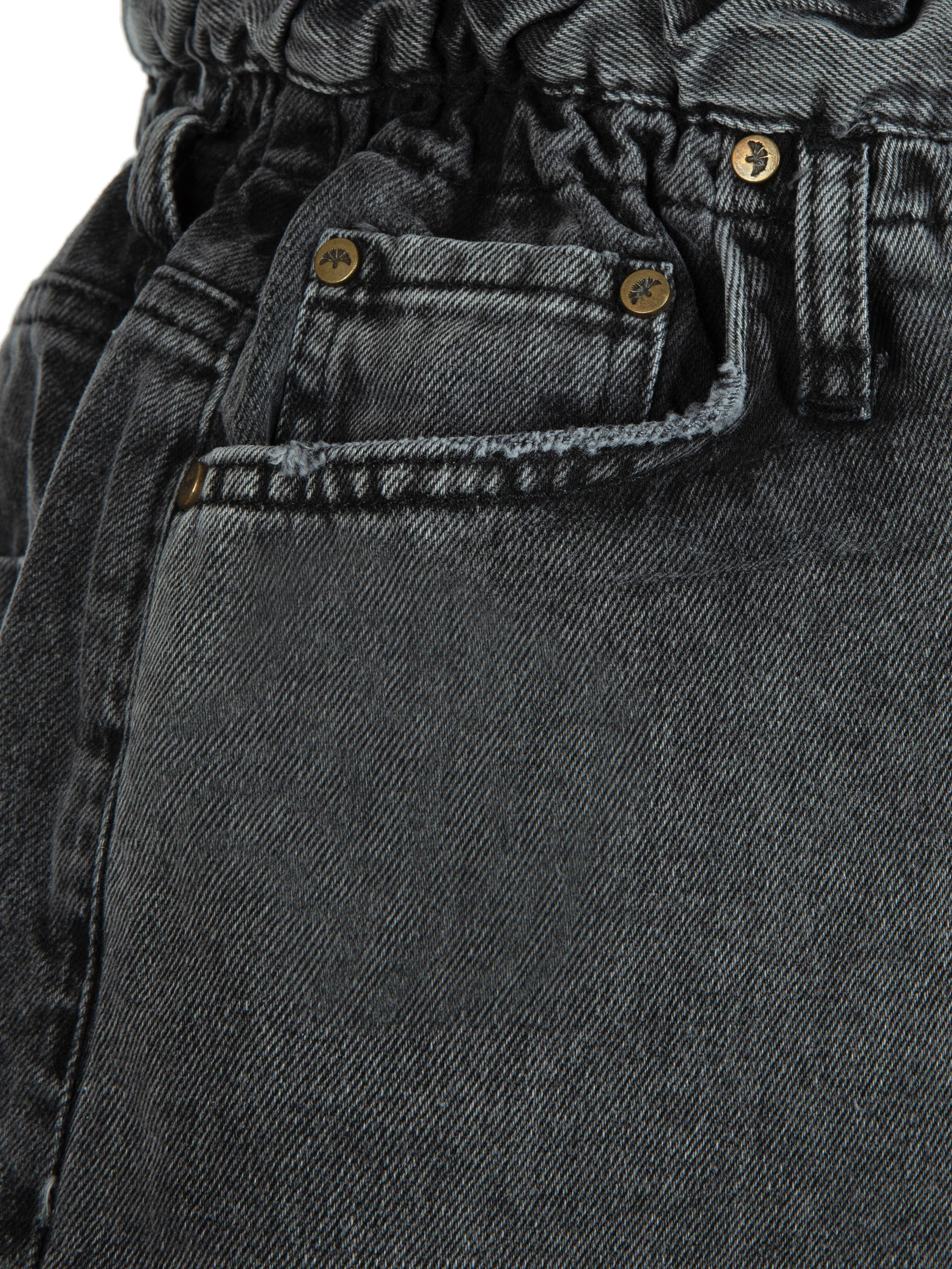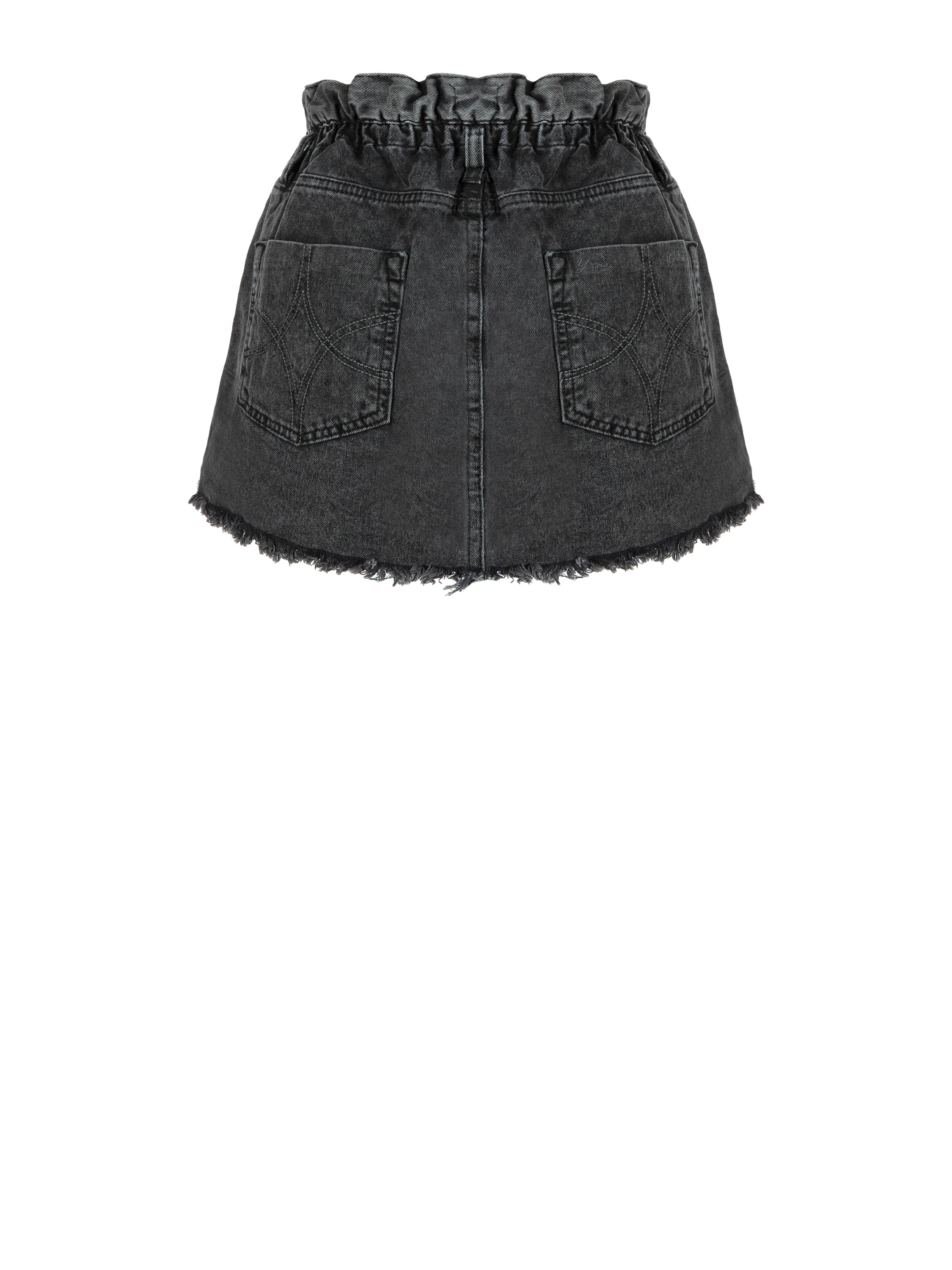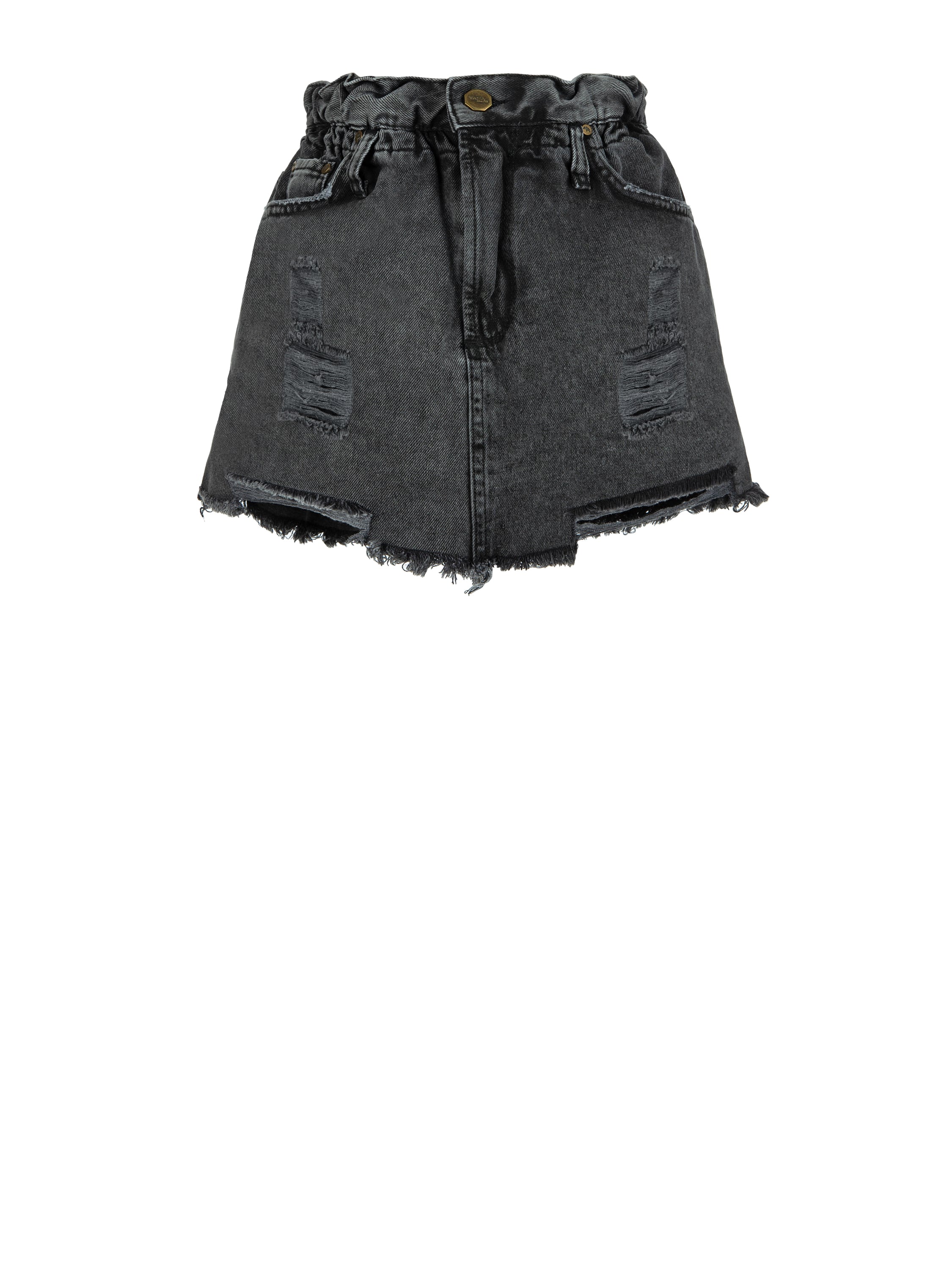 Denim mini skirt with raw hems and decorative holes made of dark grey denim. An indispensable part of a basic wardrobe. The skirt is complemented by an elastic waistband for a more comfortable fit.